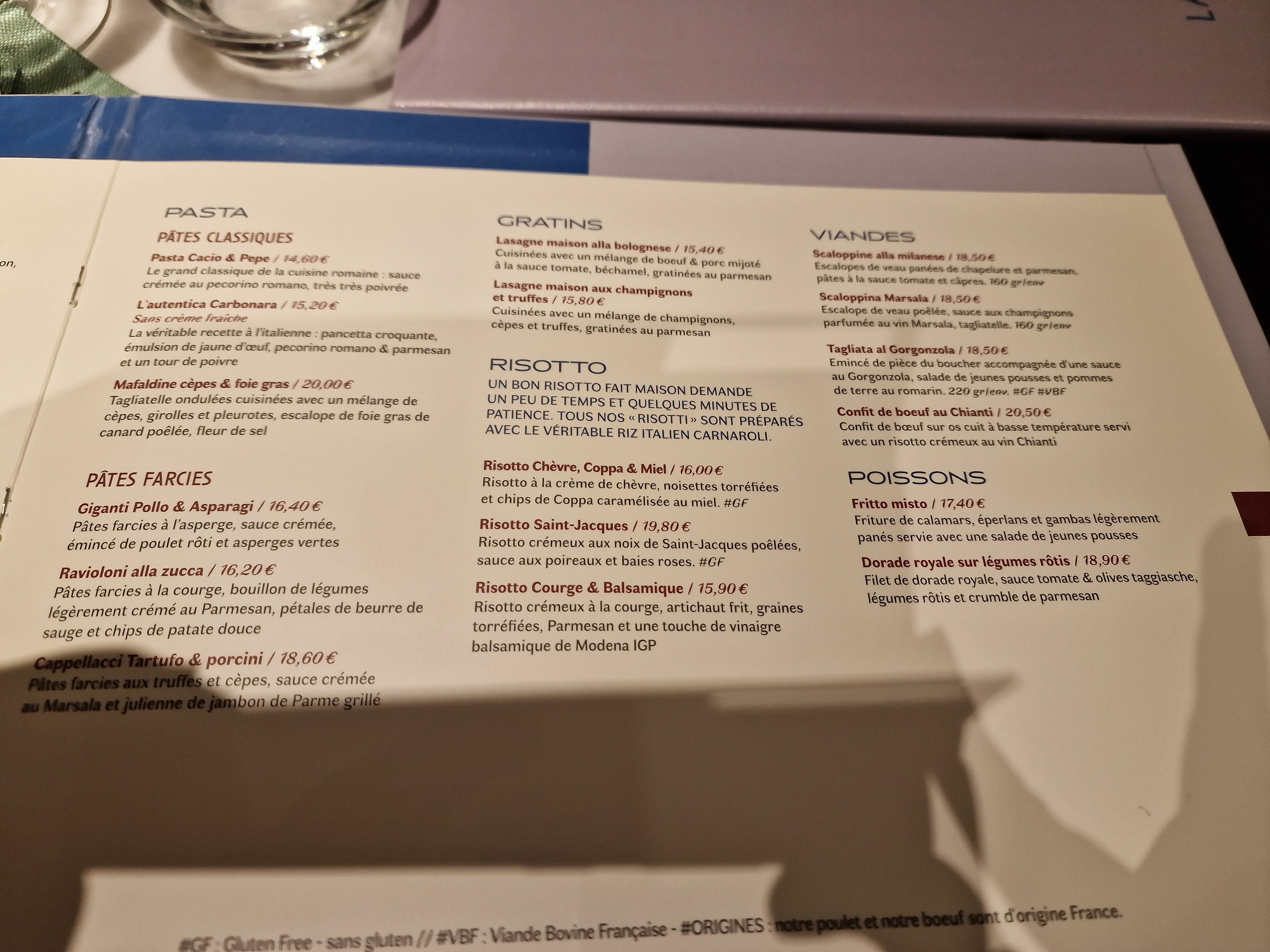 Restaurant très accueillant alors qu'on était en retard par rapport à notre réservation. Menu Pâte Gratiné, Pâte Farcies ou bien Pâte Original. Possibilité de prendre une pizza il y a aussi du carpaccio de Bœuf et aussi du Jambon 16 Mois d'affinage à déguster à l'apéritif 😁 . Je vous conseille d'aller dégusté pour avoir votre propre Avis personnelle. Apéritif italien, Vin italien Tout y est je reviendrai 😉