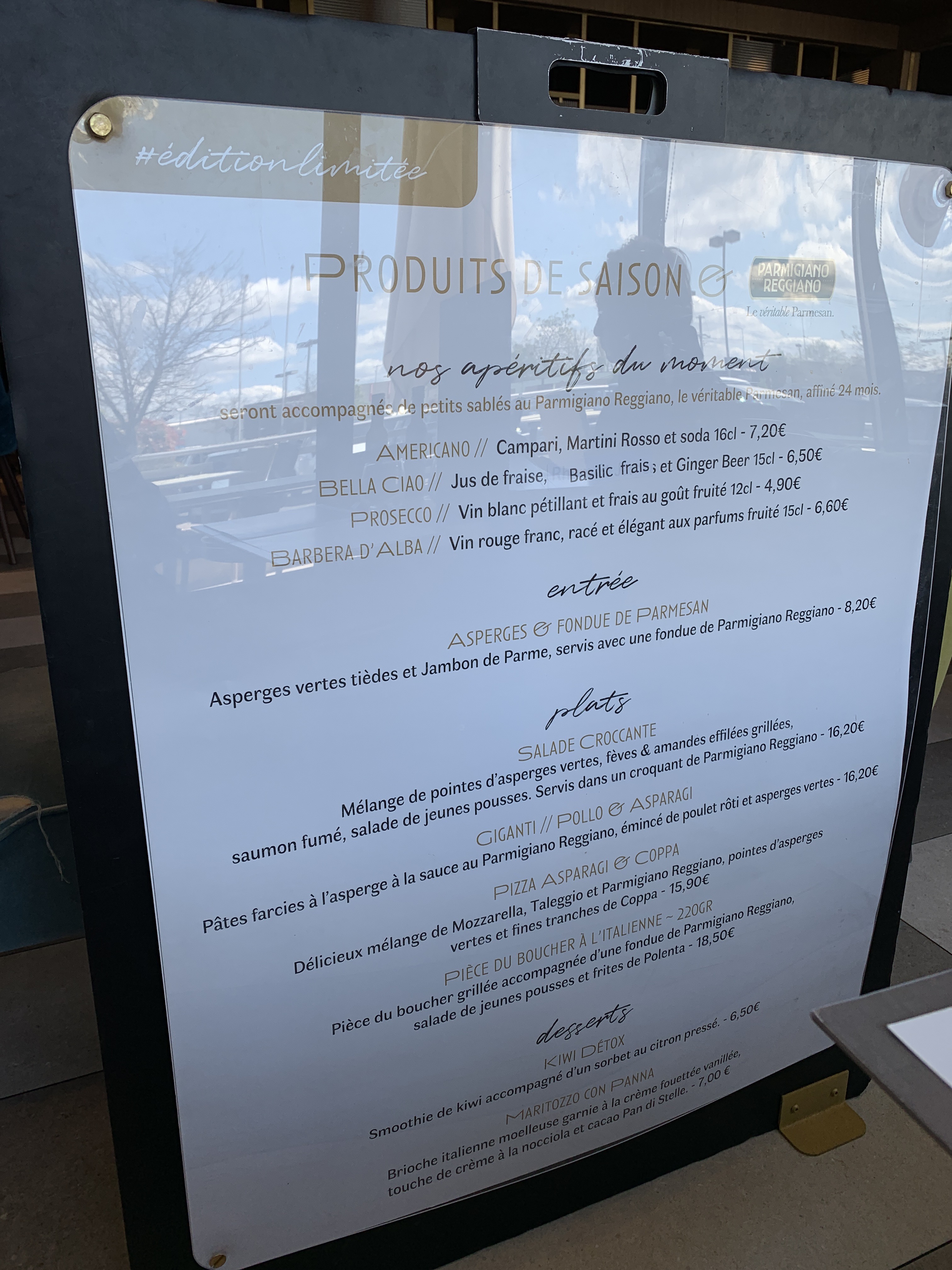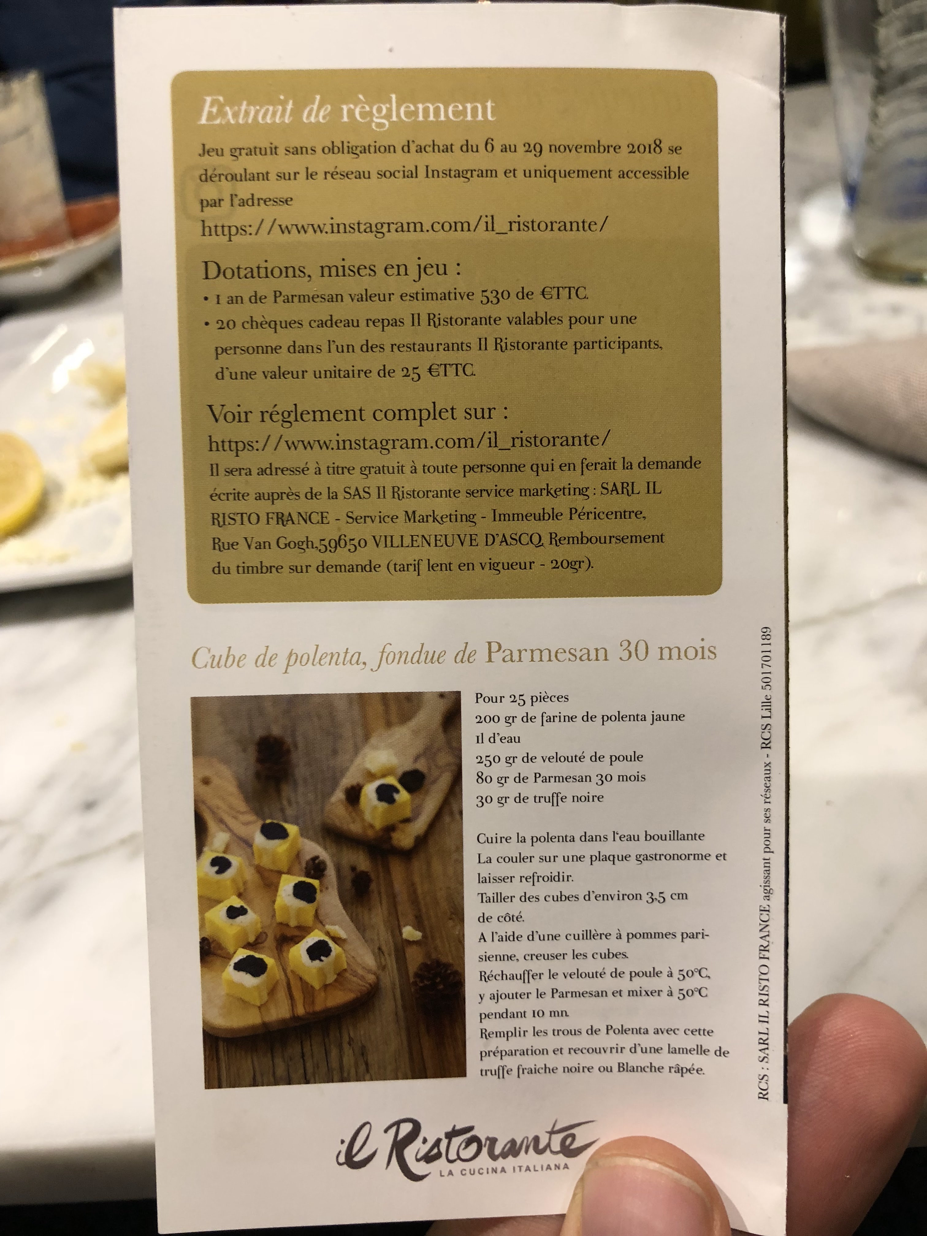 Bienvenue à Merignac, où la gastronomie en zone industrielle n’a de secret pour personne. Chaudement recommandé par une collaboratrice bienveillante nous voici baignés dans le chef lieu italien local. Il Ristorante. Ici pas de chichis, des bières locales brassées par le fils d’un chanteur très connu au pays, un accueil au top font partis du paysage. Et le petit plus, un menu taille géante pour épater les enfants ainsi que les malvoyants. Bravo à tous. Bacci. Edit: a l’échelle de la carte, les desserts sont aussi enormissimo, déconseillés aux bambini.