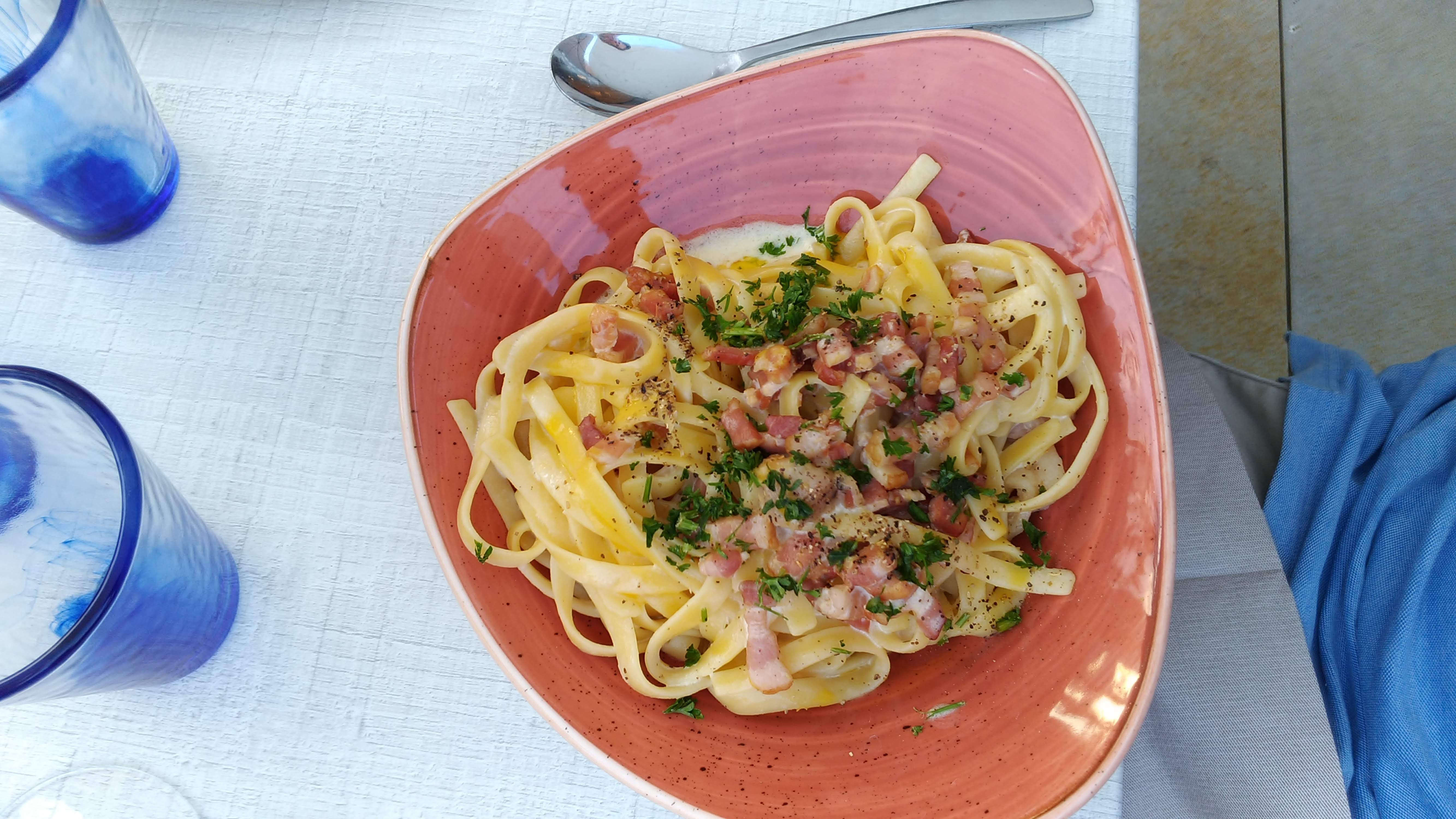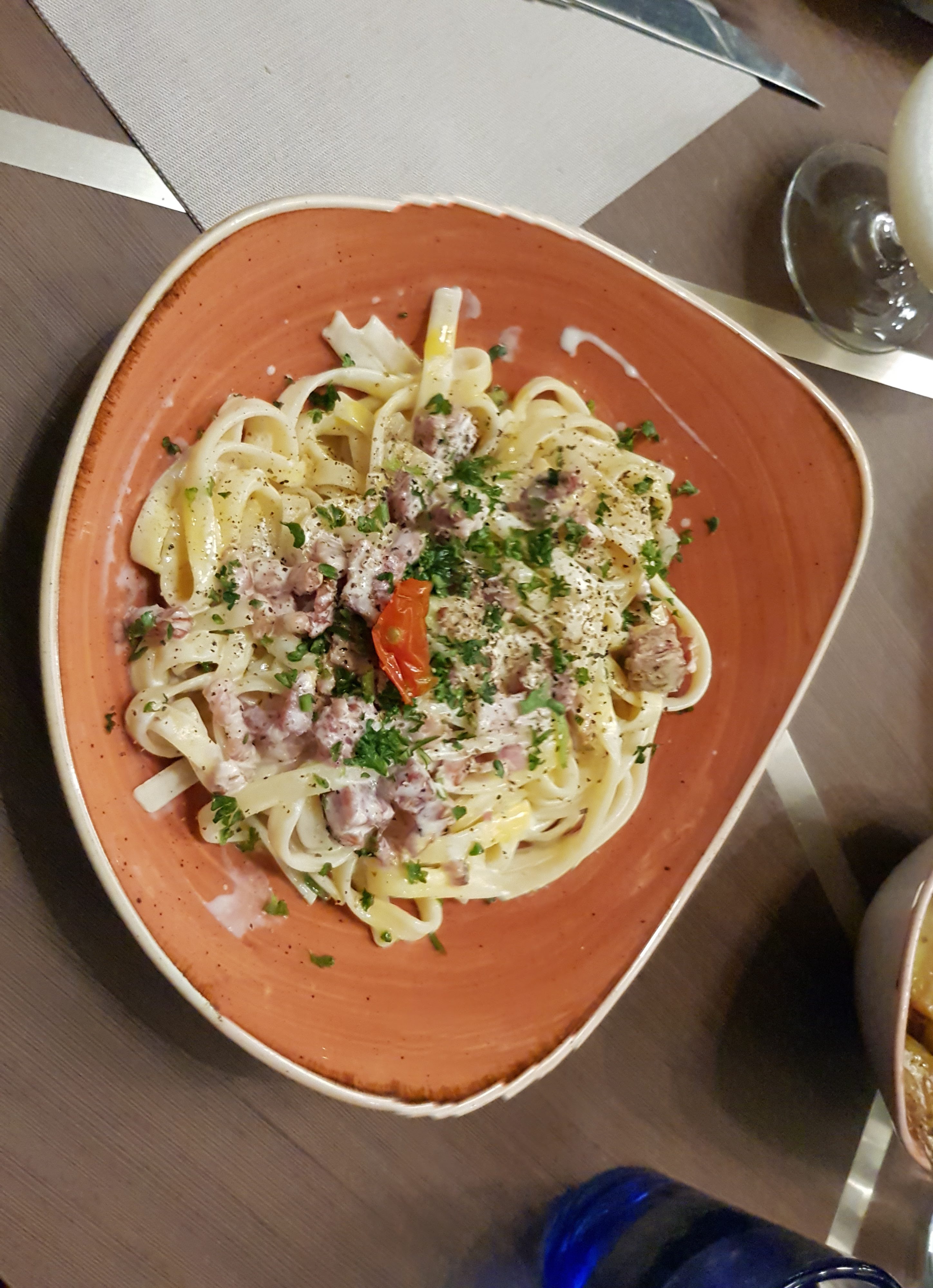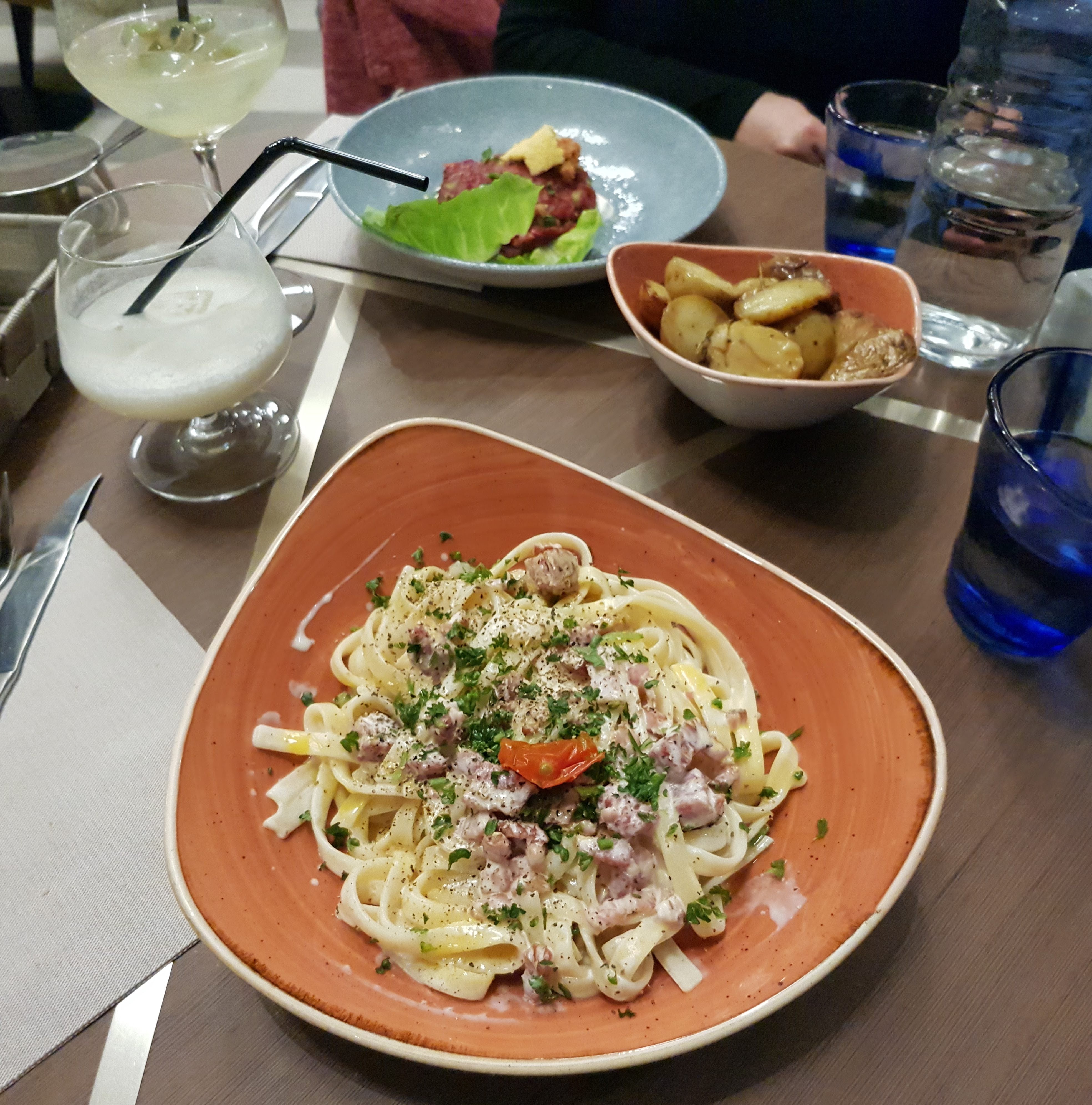 Bonne cuisine italienne. Pâtes carbonara un peu salée, pizza rigolote pour les enfants. Excellent Bellini🍹