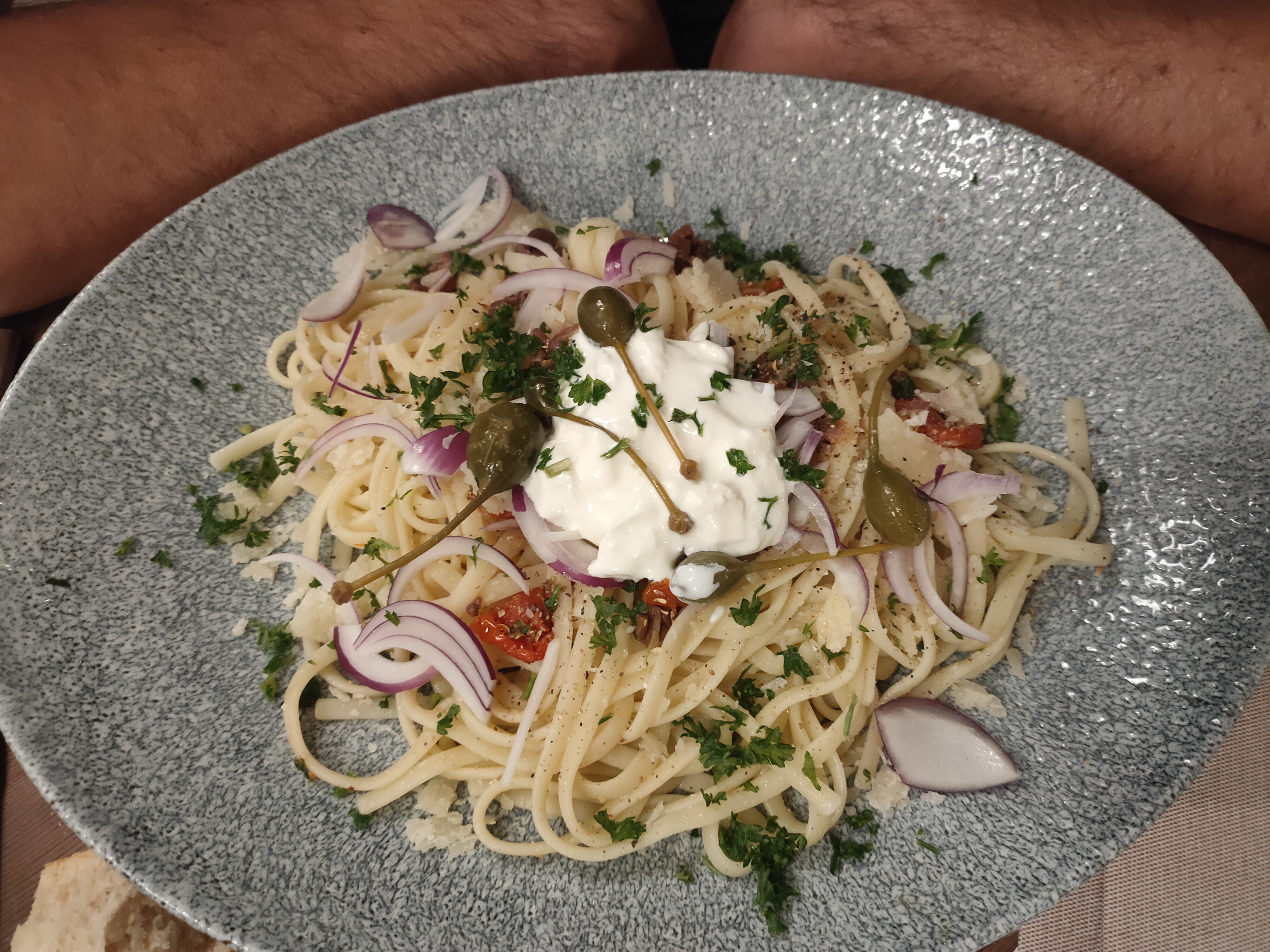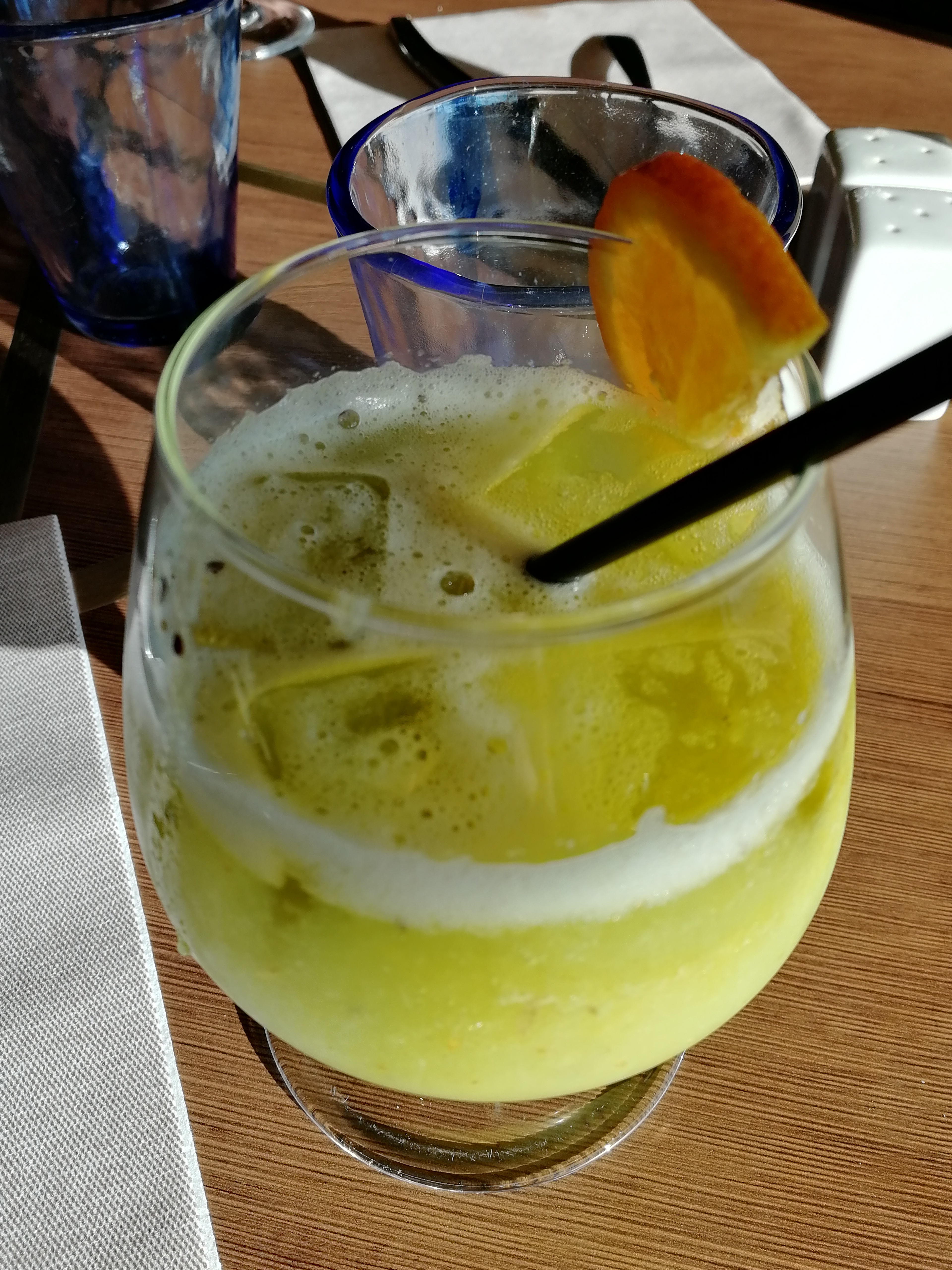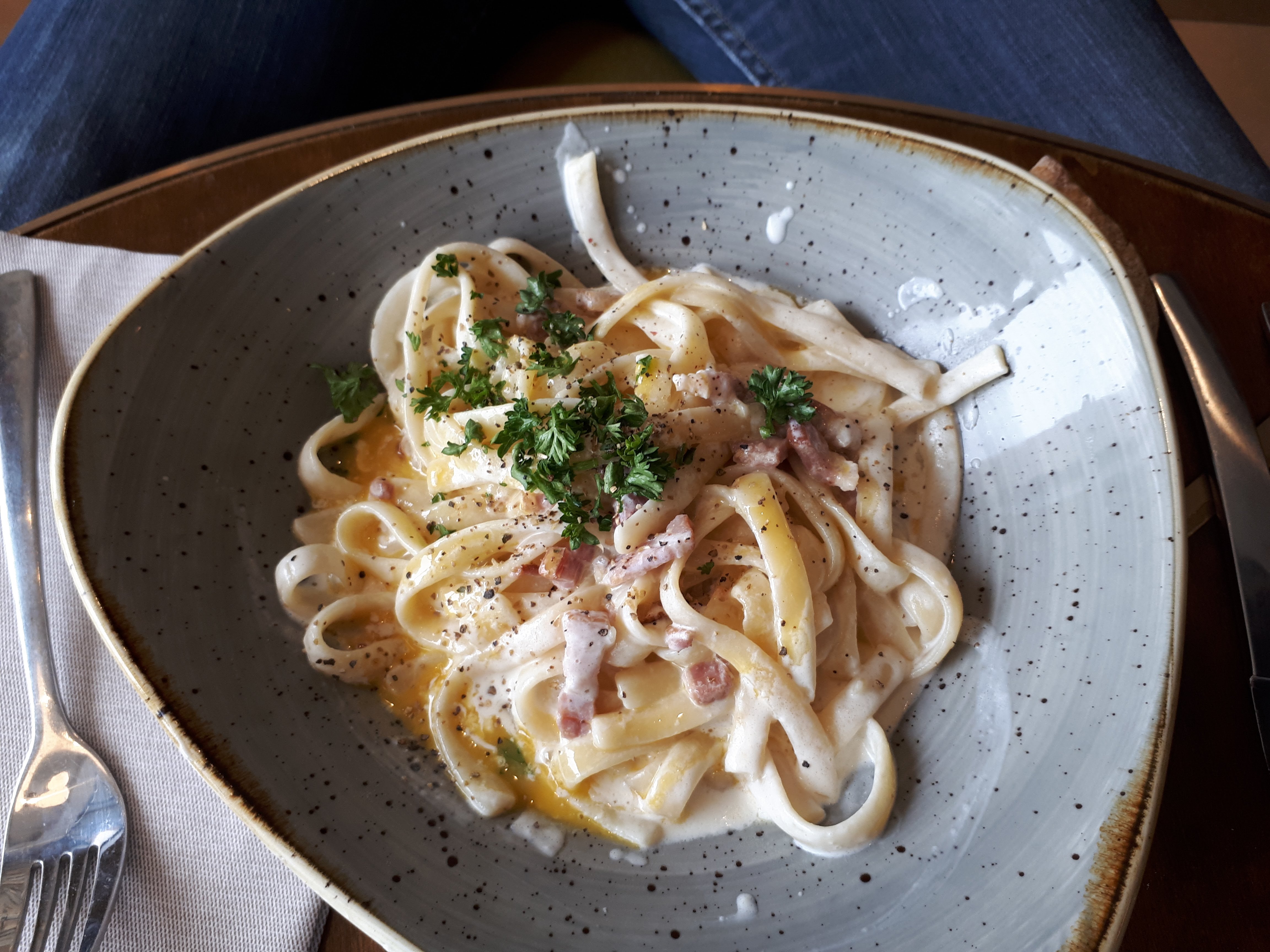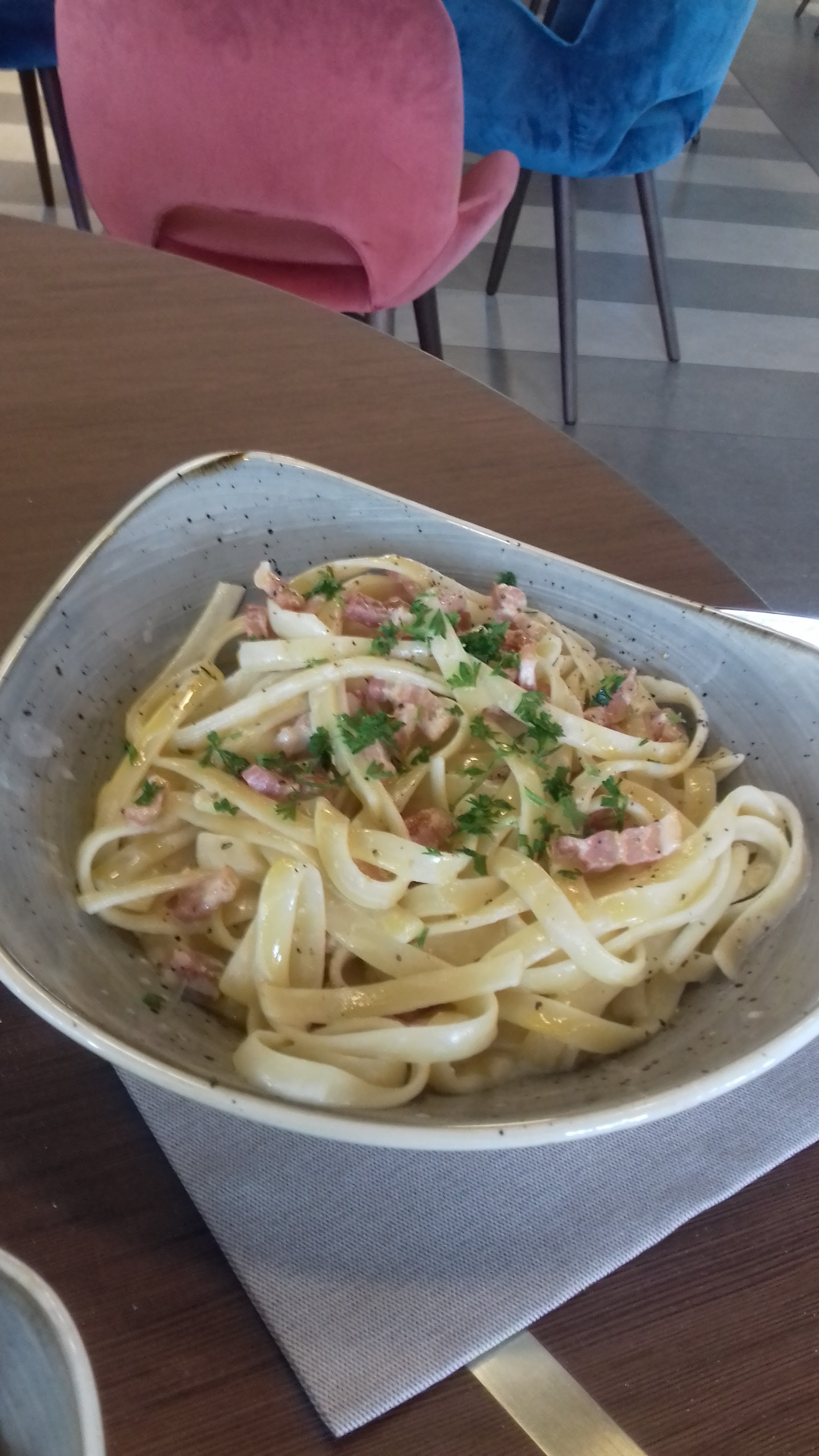 Bonne cuisine italienne. Pâtes carbonara un peu salée, pizza rigolote pour les enfants. Excellent Bellini🍹