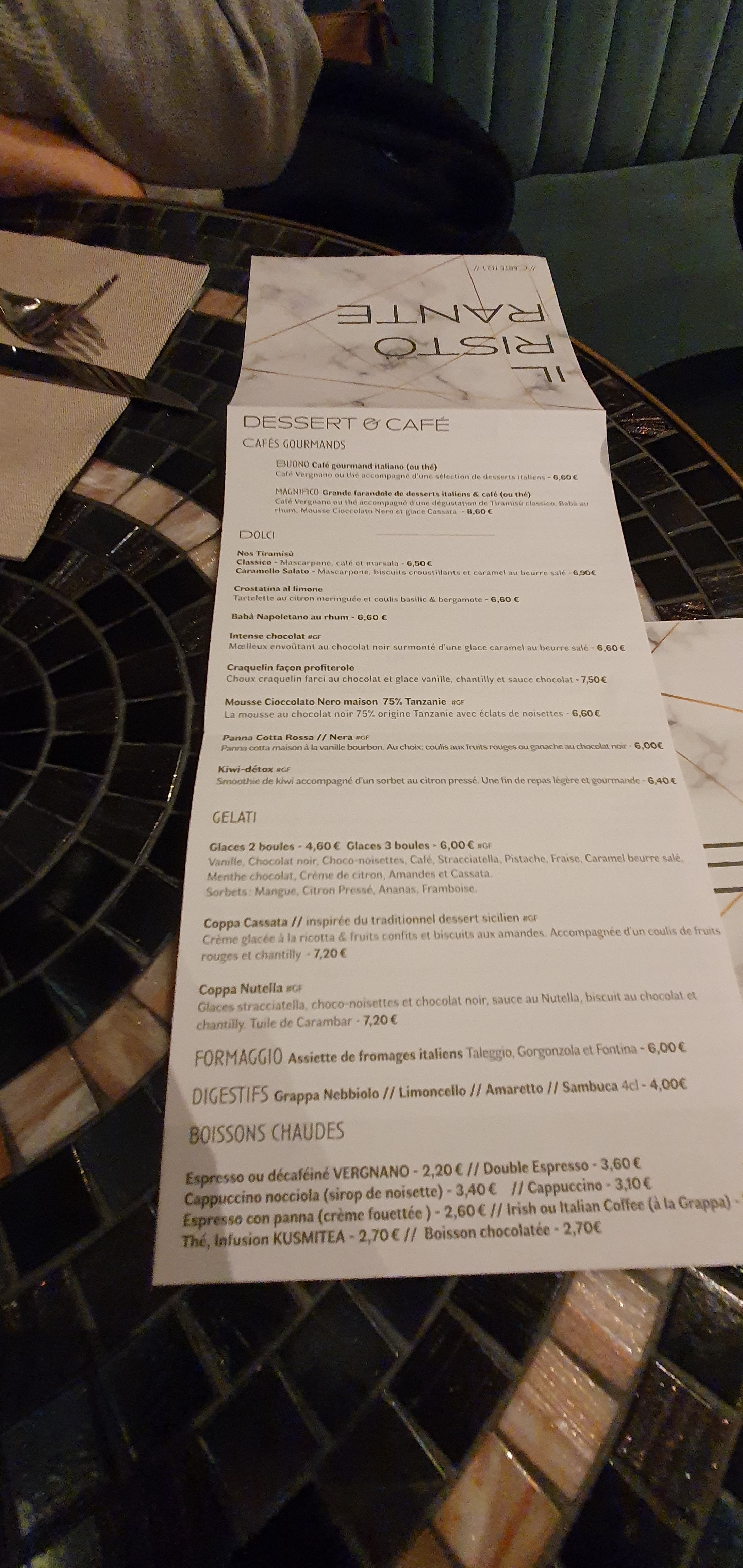 Très bon restaurant italien. Ambiance cosy et moderne. Plats servis assez rapidement (dîner en semaine) et copieux. Point positif pour le thé gourmand, alternative très appréciée pour ceux qui n’aiment pas le café. Personnel agréable et efficace. Respect des gestes barrières, gel et menu en format numérique.