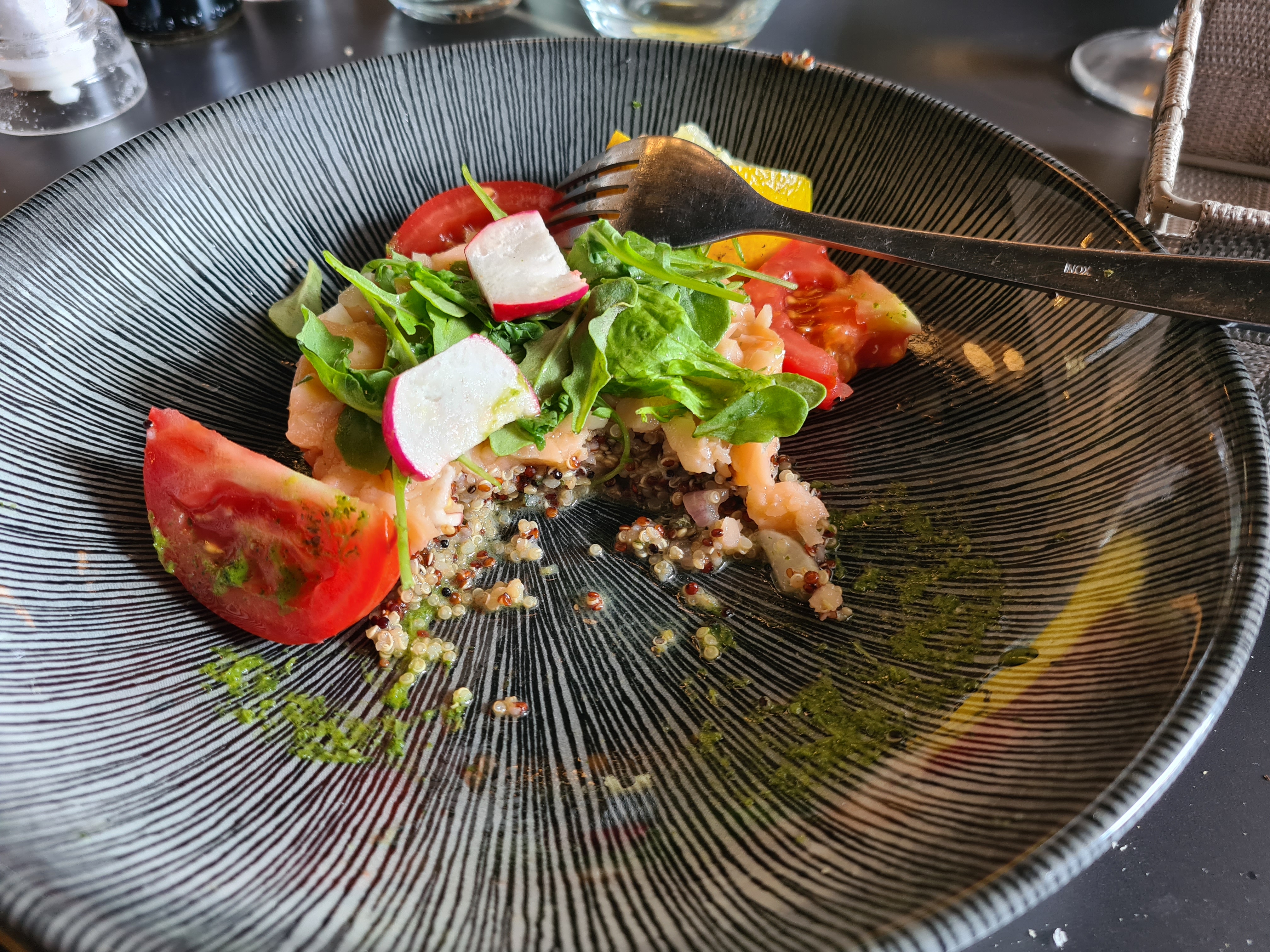 Rapport quantité / qualité / prix très moyen. Typiquement le tartare de saumon à 16 euros doit contenir grand maximum 100g de saumon, du quinoa et 3 quartier de tomate de base, même pas une bonne tomate goûteuse. Trop peu pour le prix. Le tartare de bar était plus copieux, la farandole à l'apéritif aussi.