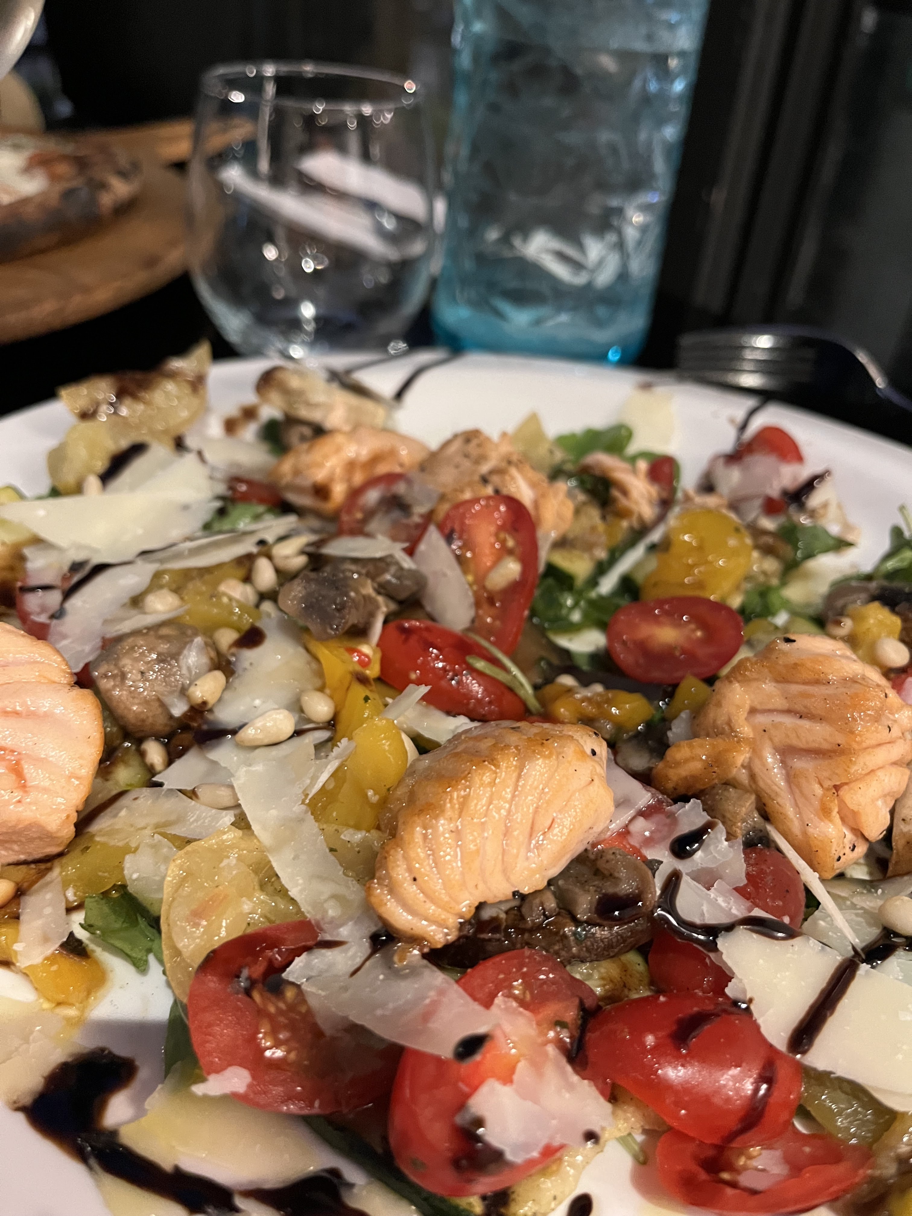 Bon, salade copieuse les légumes sont frais et le saumon avait une très bonne cuisson. La pizza très bonne aussi. Petit bémol « le pain » accompagnant était un peu trop cuit. Mais sinon très bien. Le service très bien et l’accueil charmant.