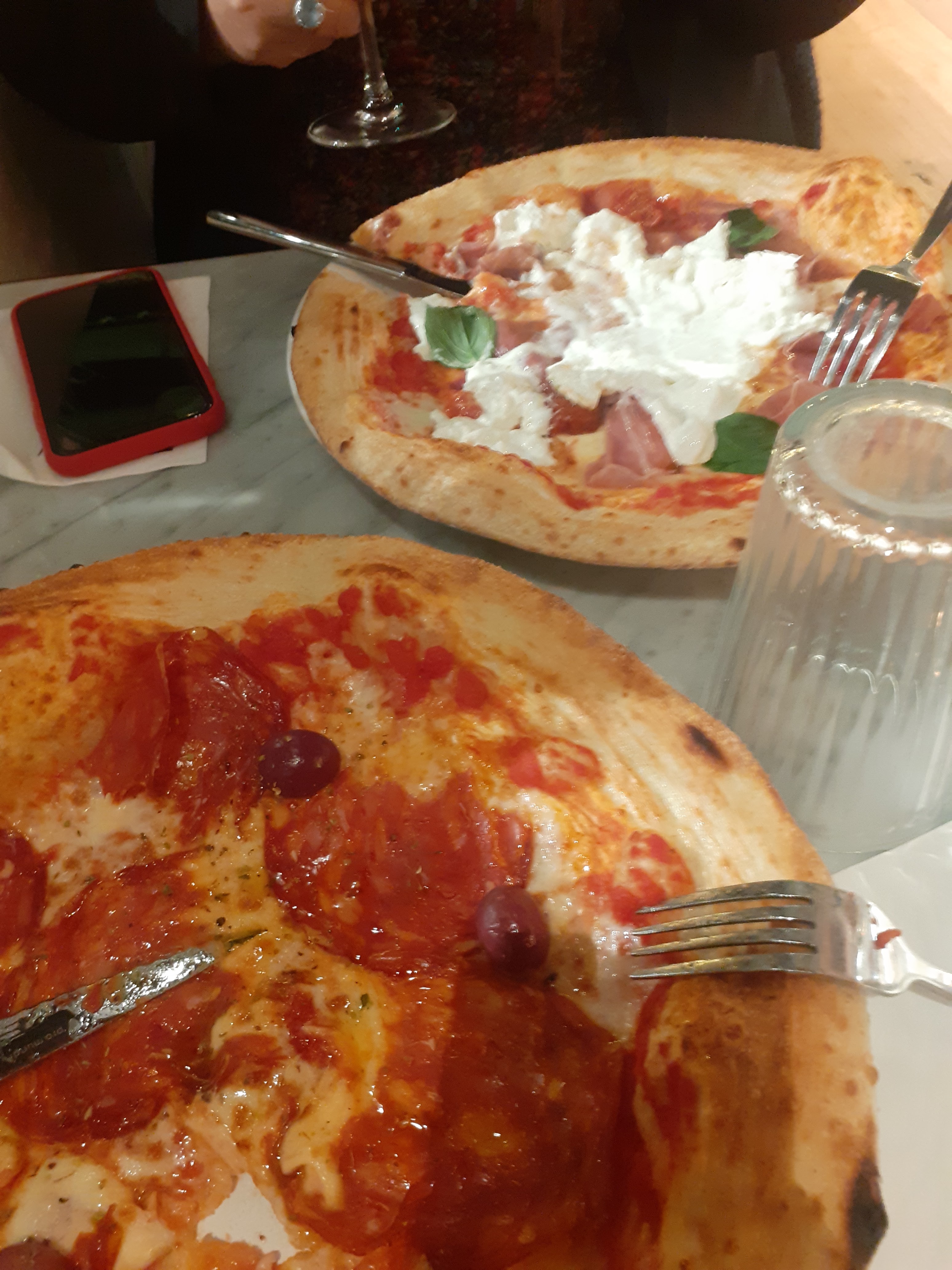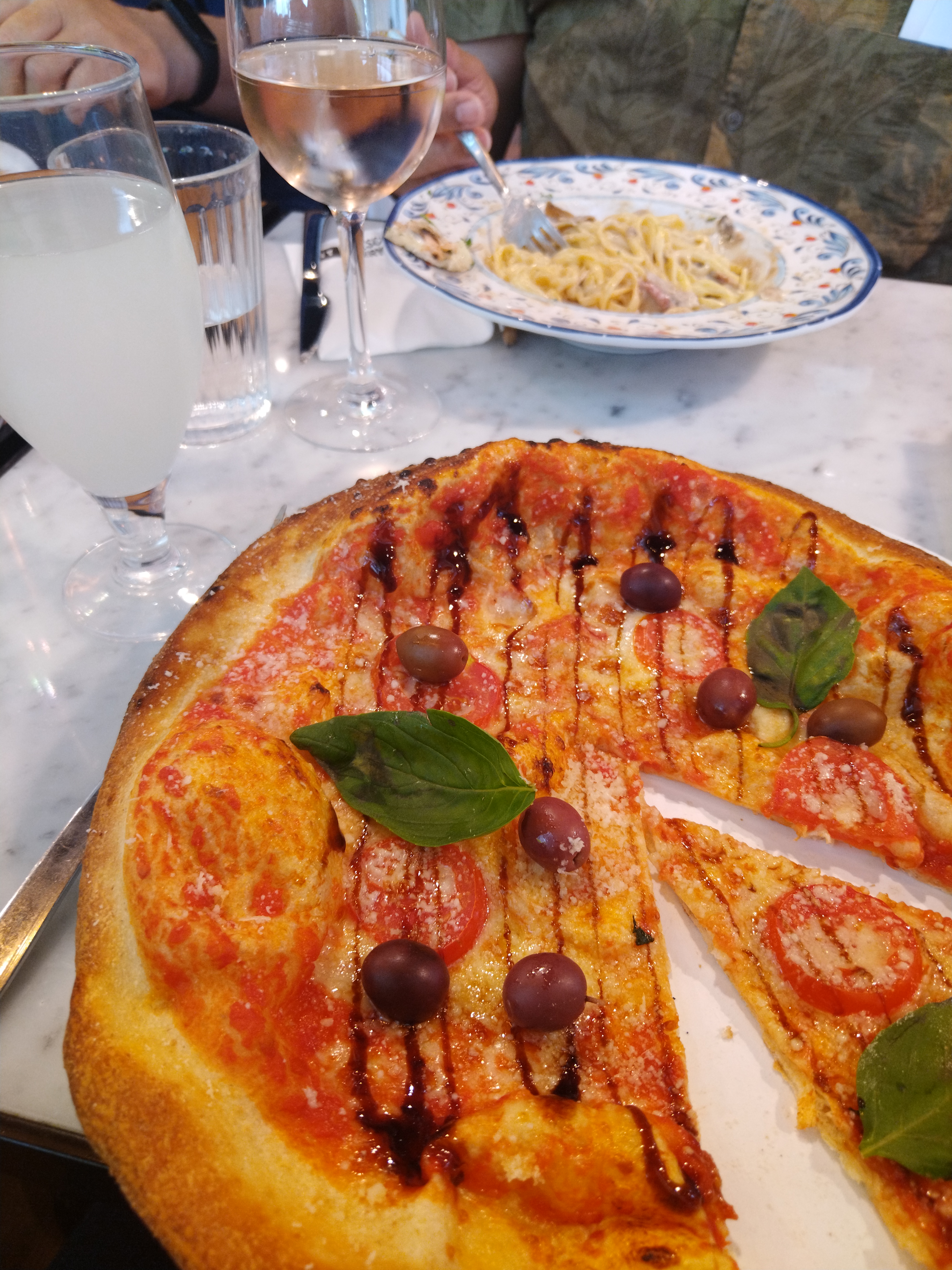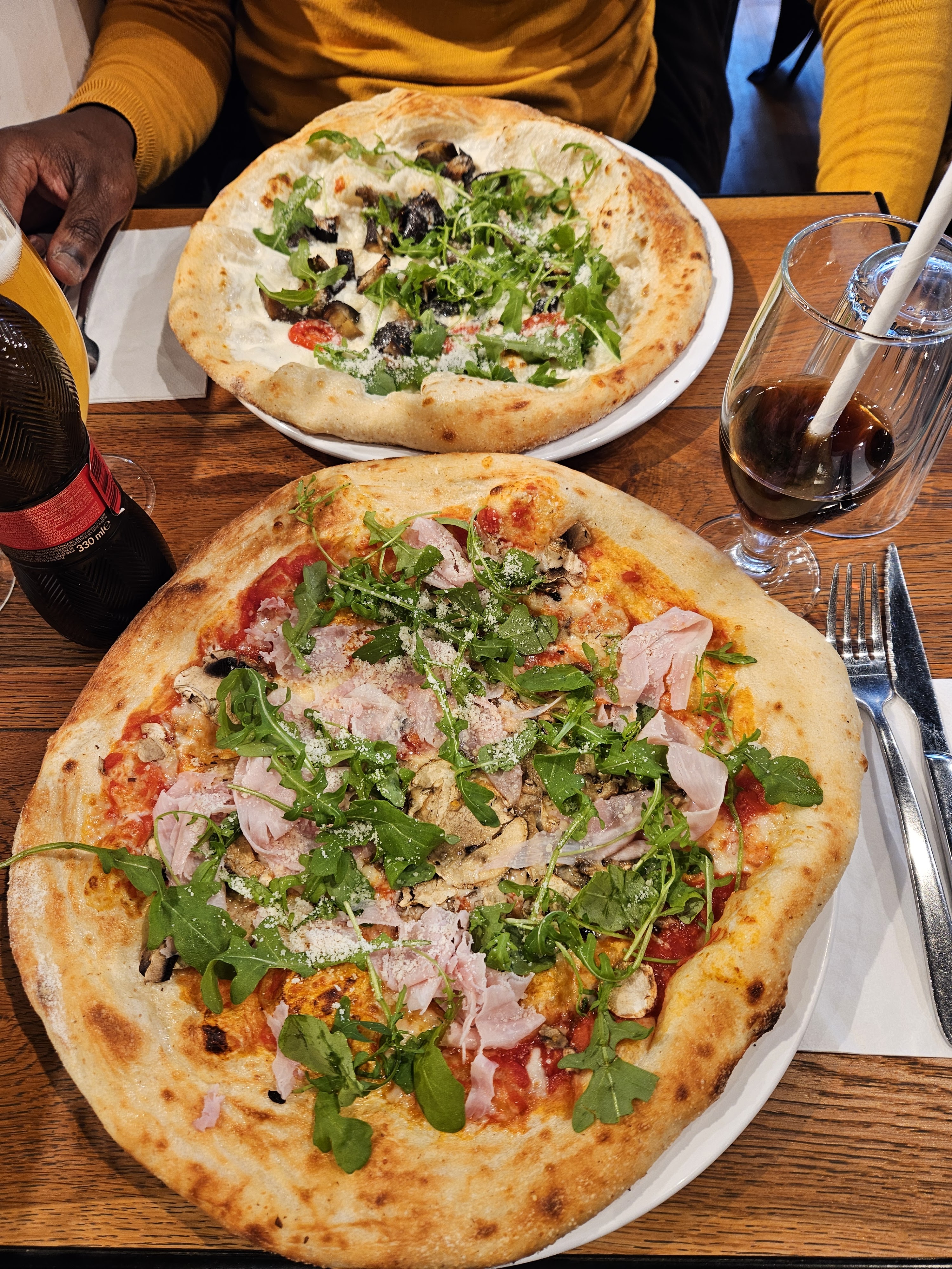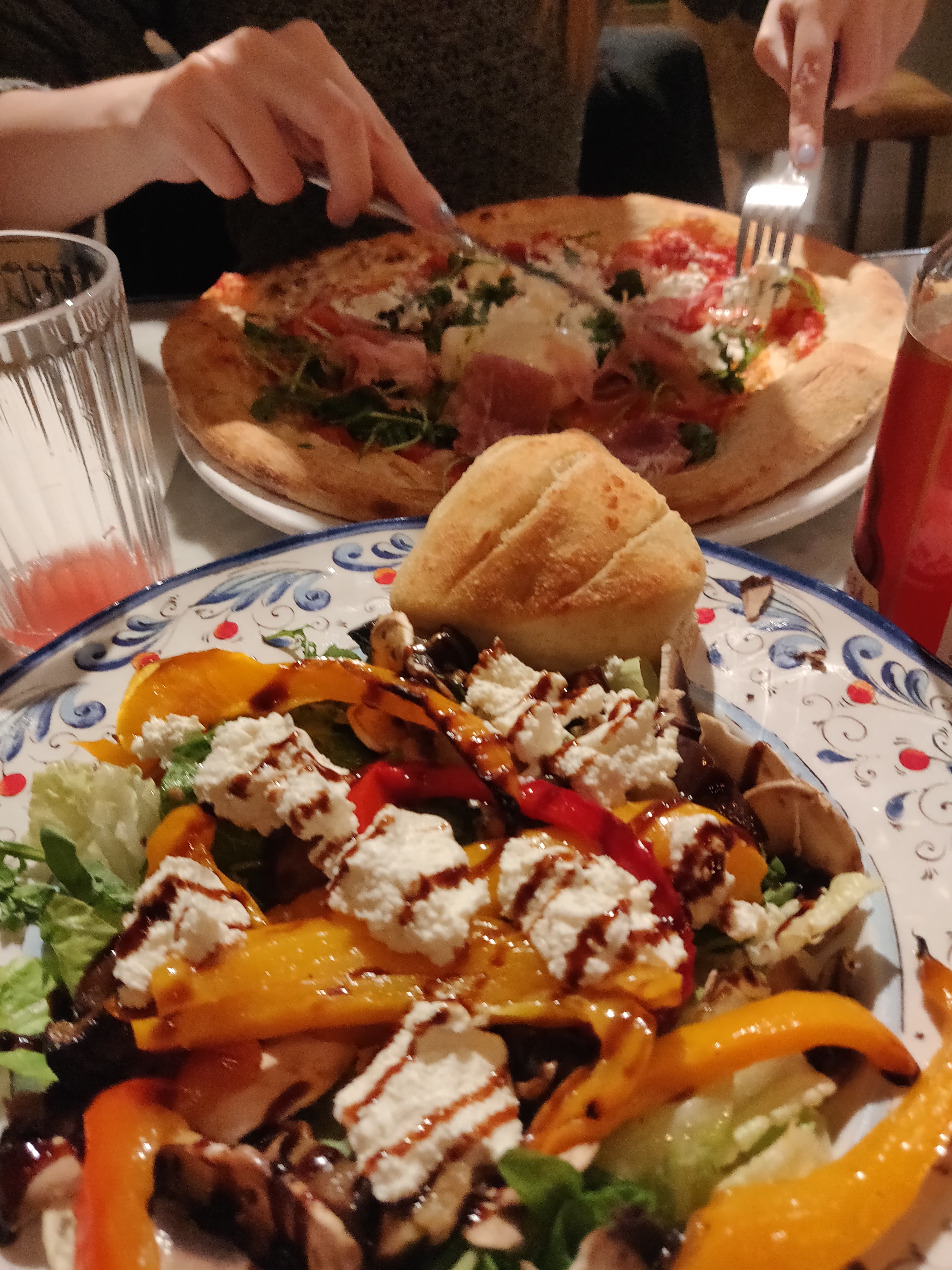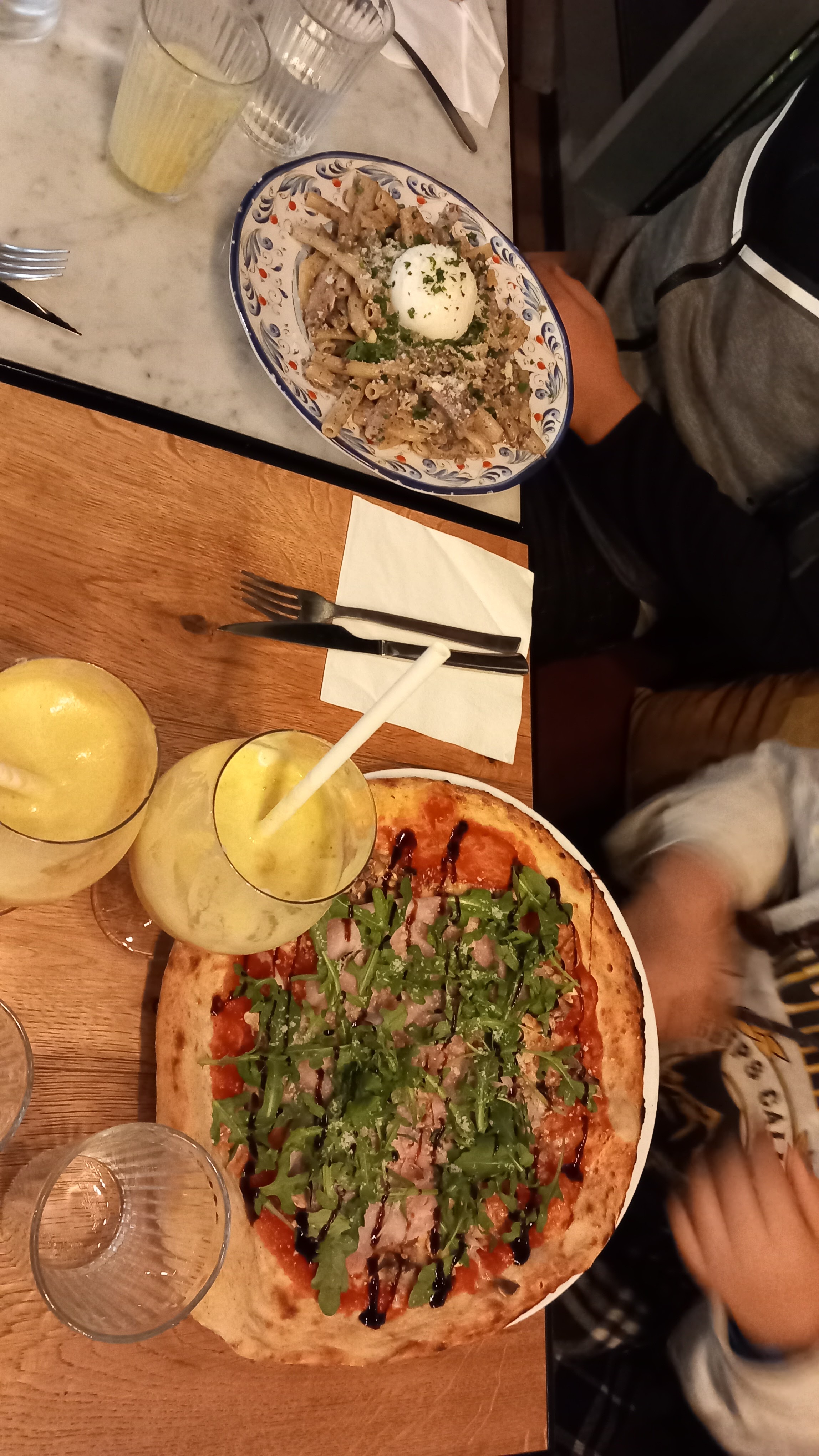 Pizza ok Pâtes bof Parcontre fuyez le mojito il est vraiment pas bon (j’en ai bu qu’une gorgé). Enfin si vous aimez le rhum, ça passe 😅 On l’a indiqué à la serveuse, en espérant que le barman revoir ses bases.