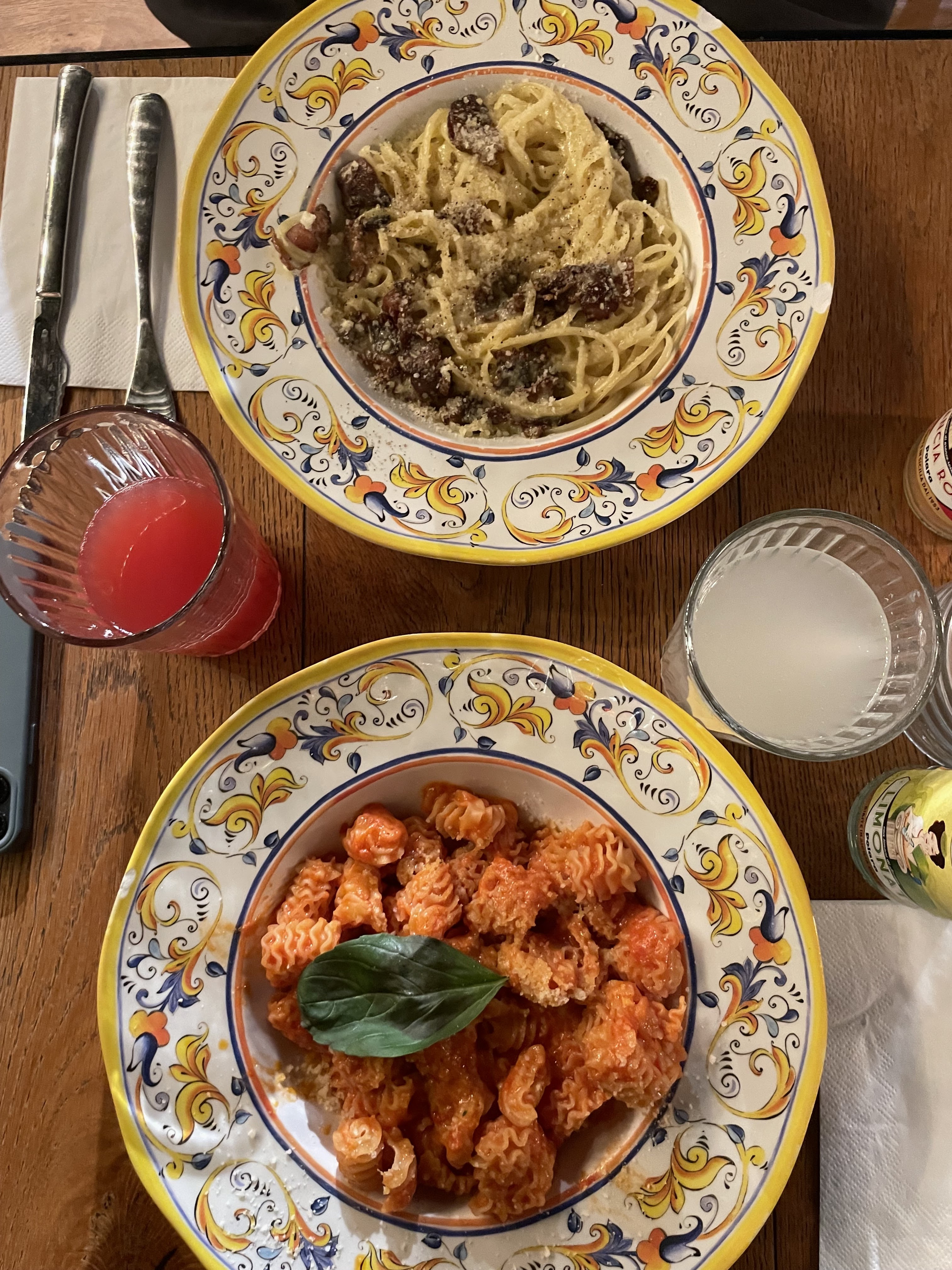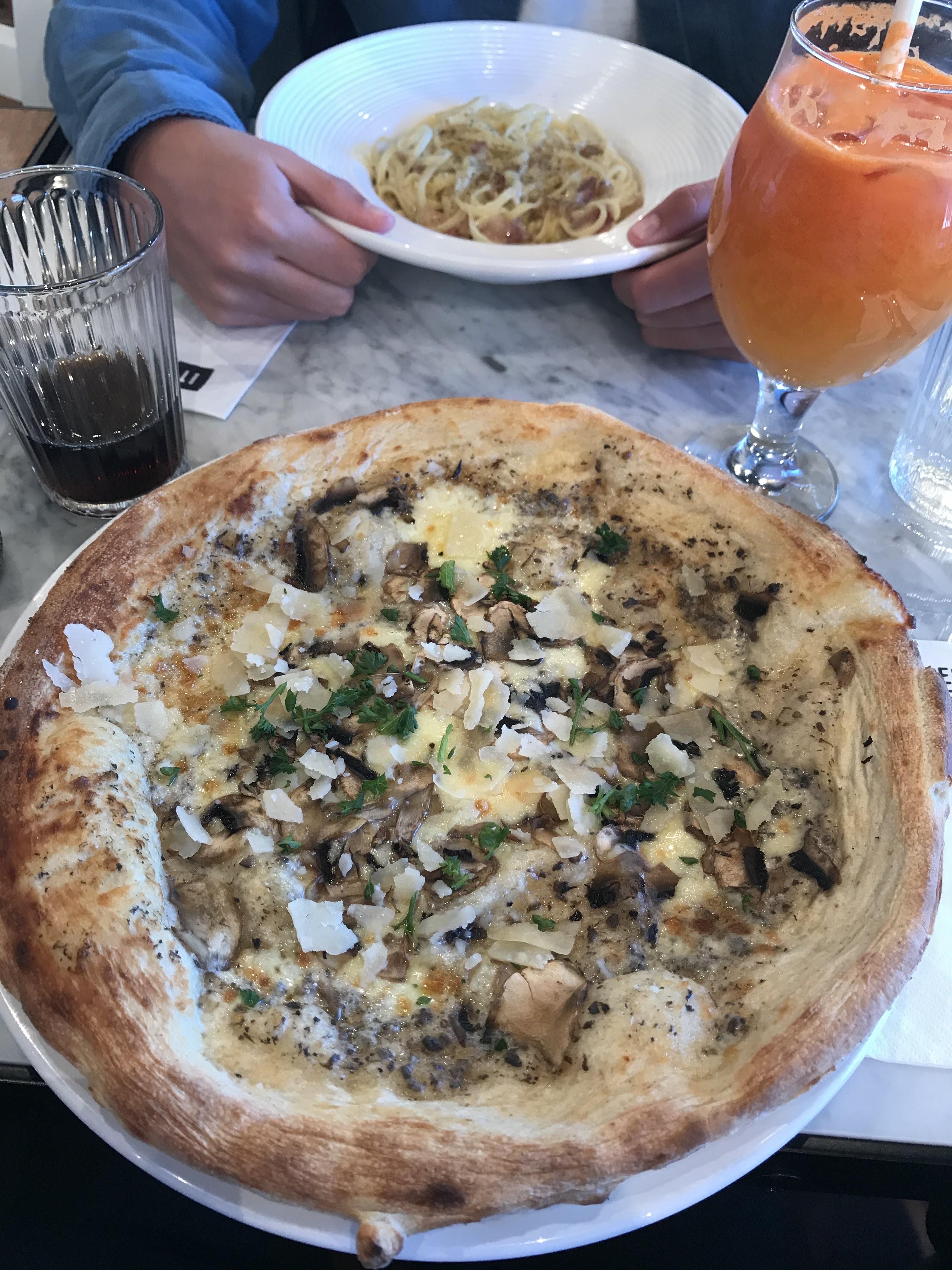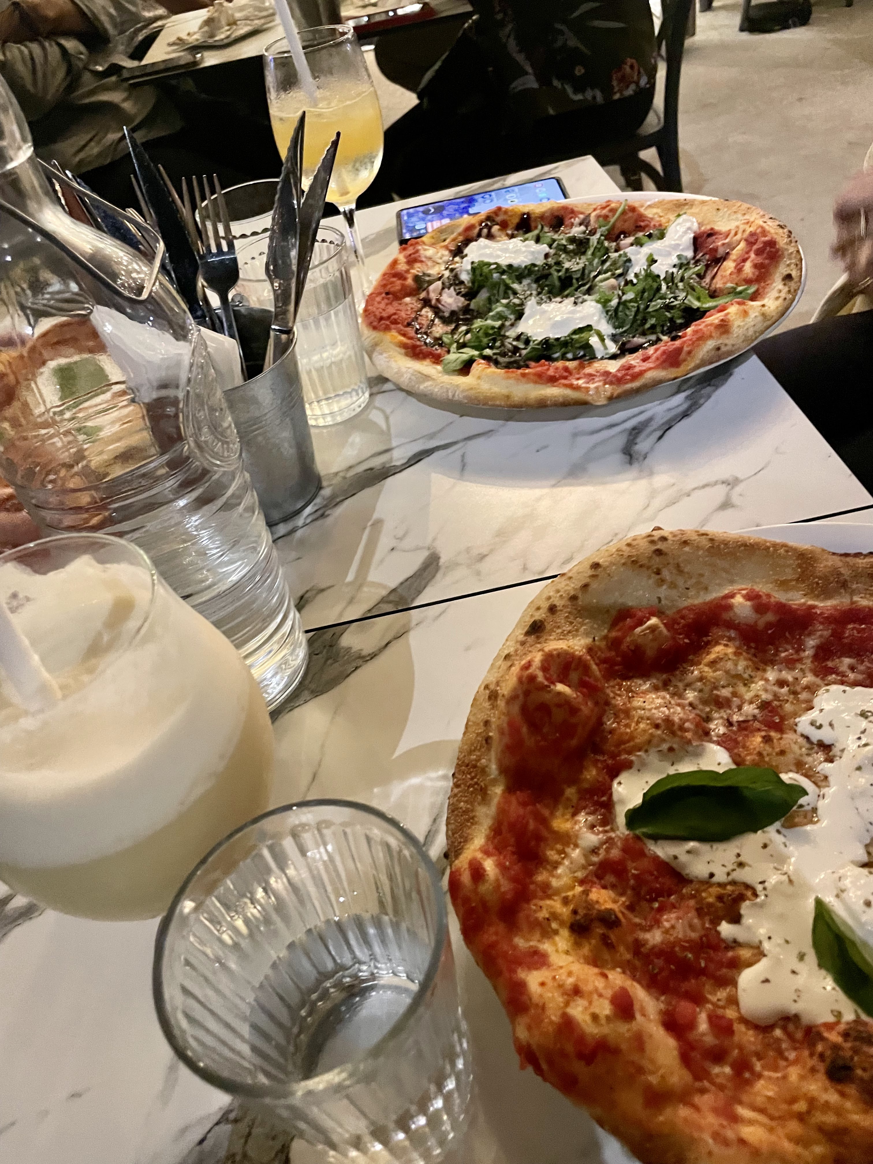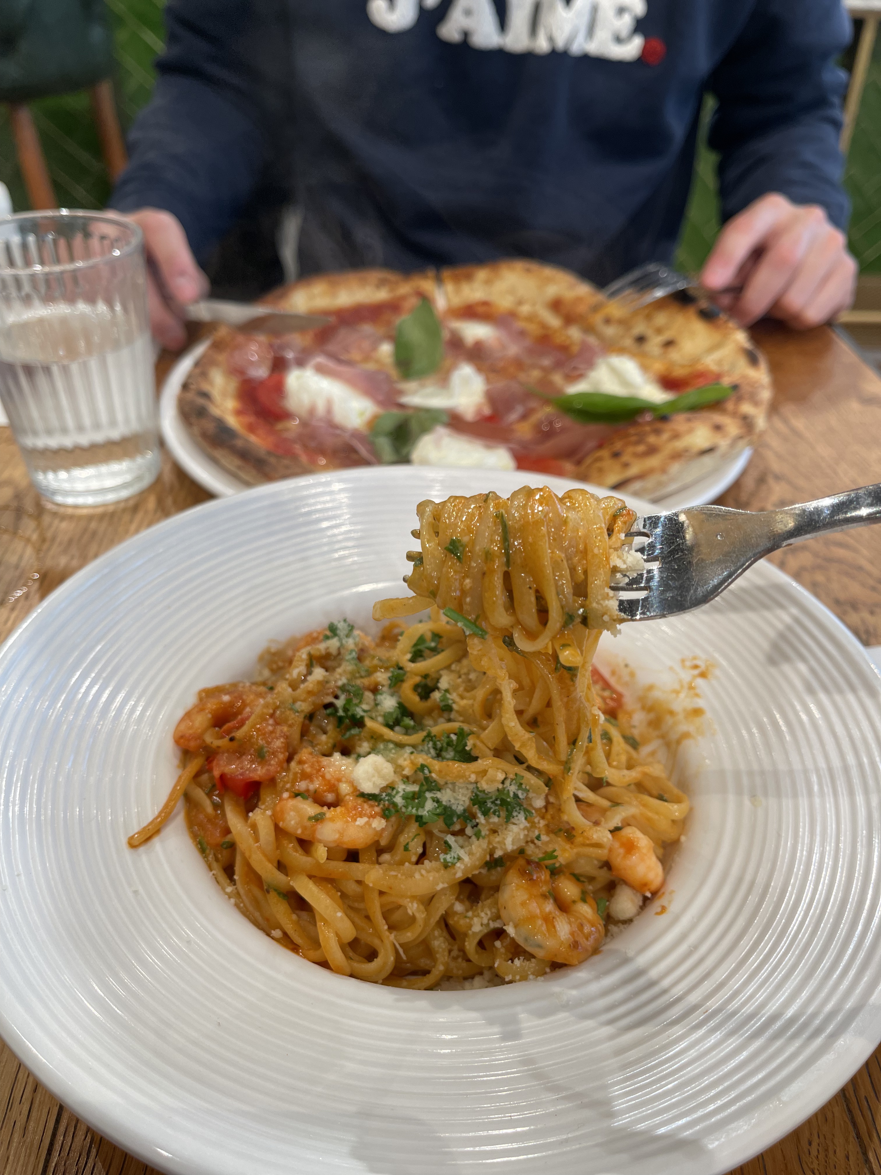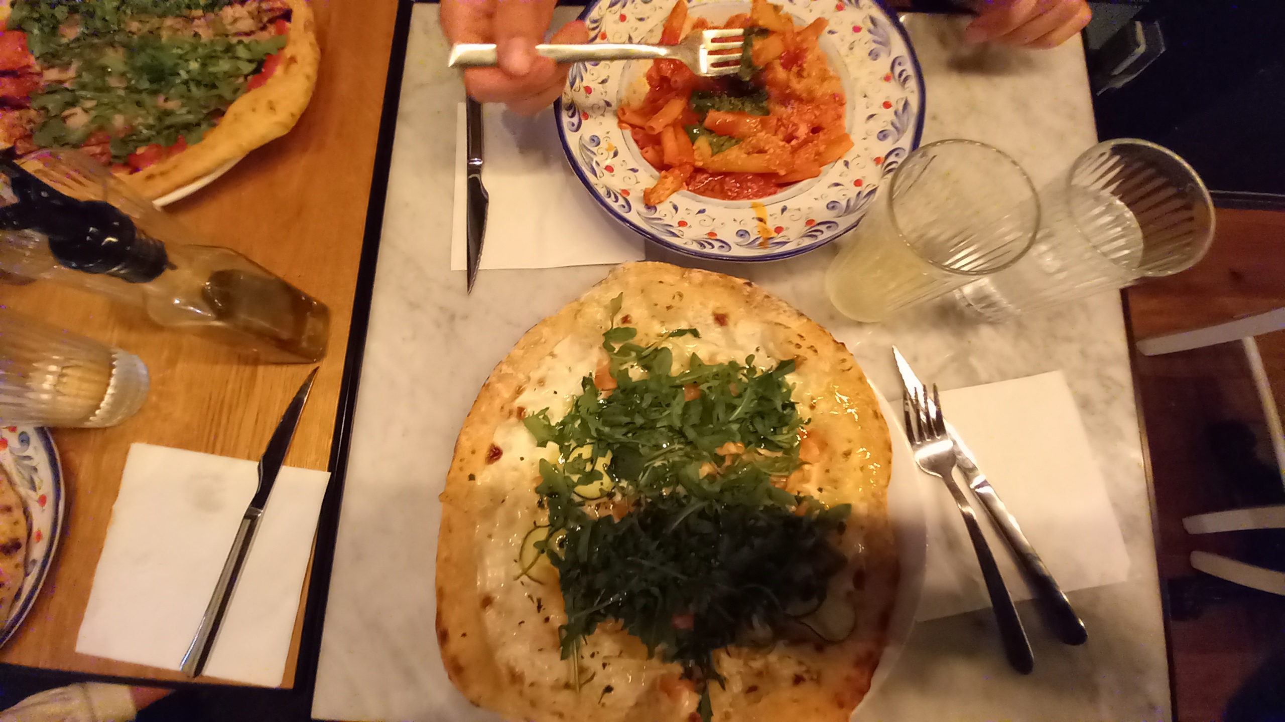 Pizza ok Pâtes bof Parcontre fuyez le mojito il est vraiment pas bon (j’en ai bu qu’une gorgé). Enfin si vous aimez le rhum, ça passe 😅 On l’a indiqué à la serveuse, en espérant que le barman revoir ses bases.