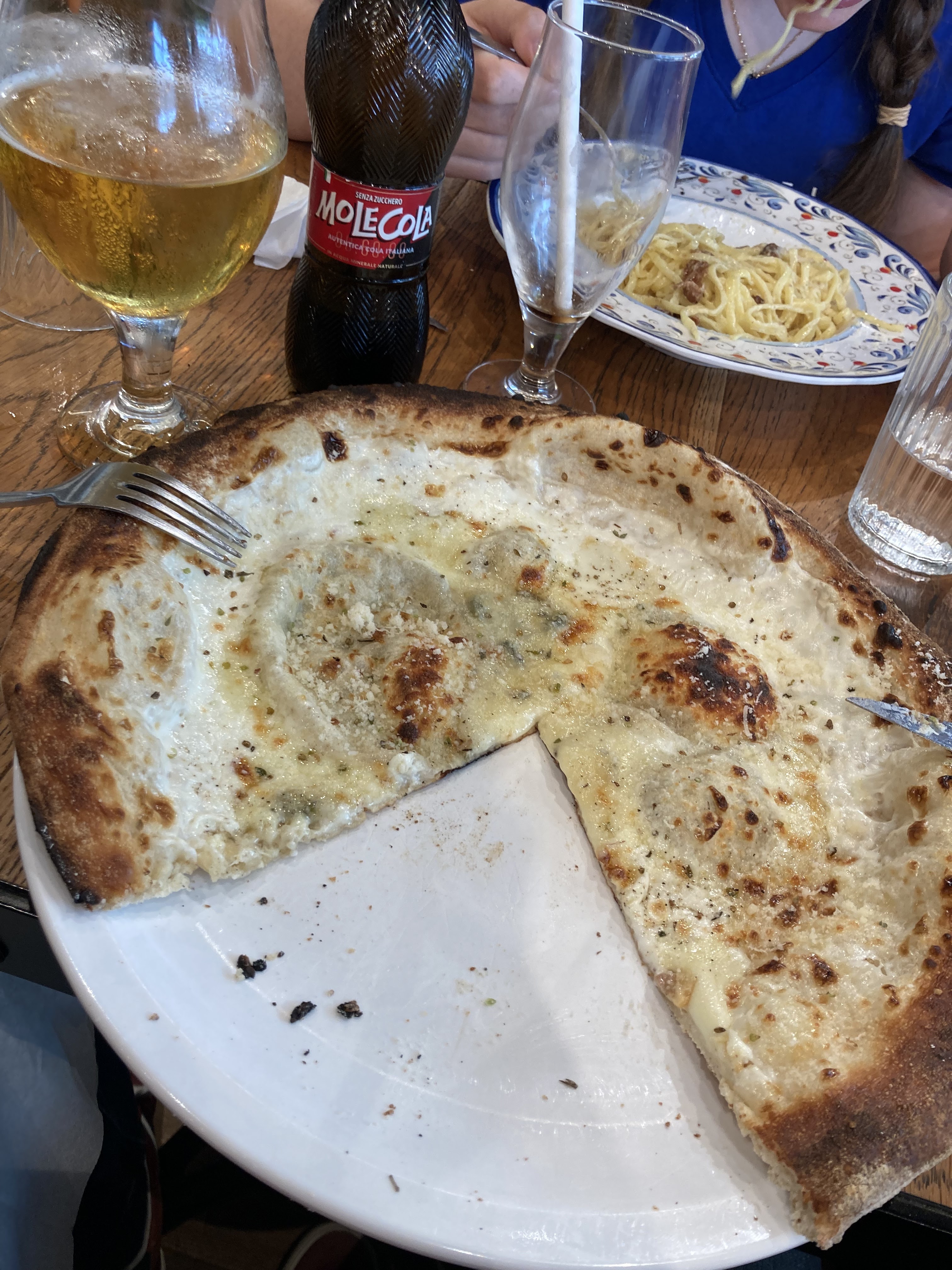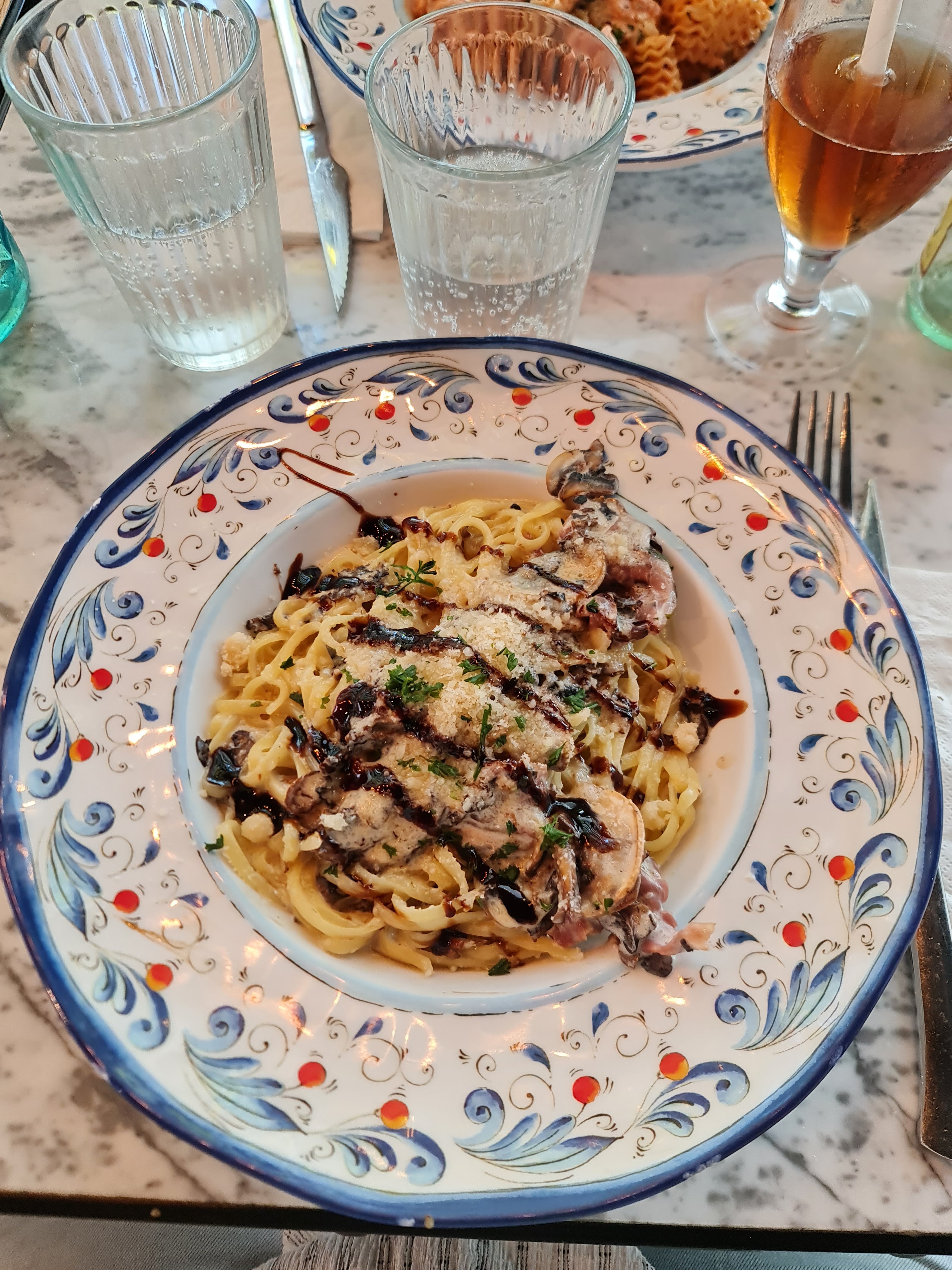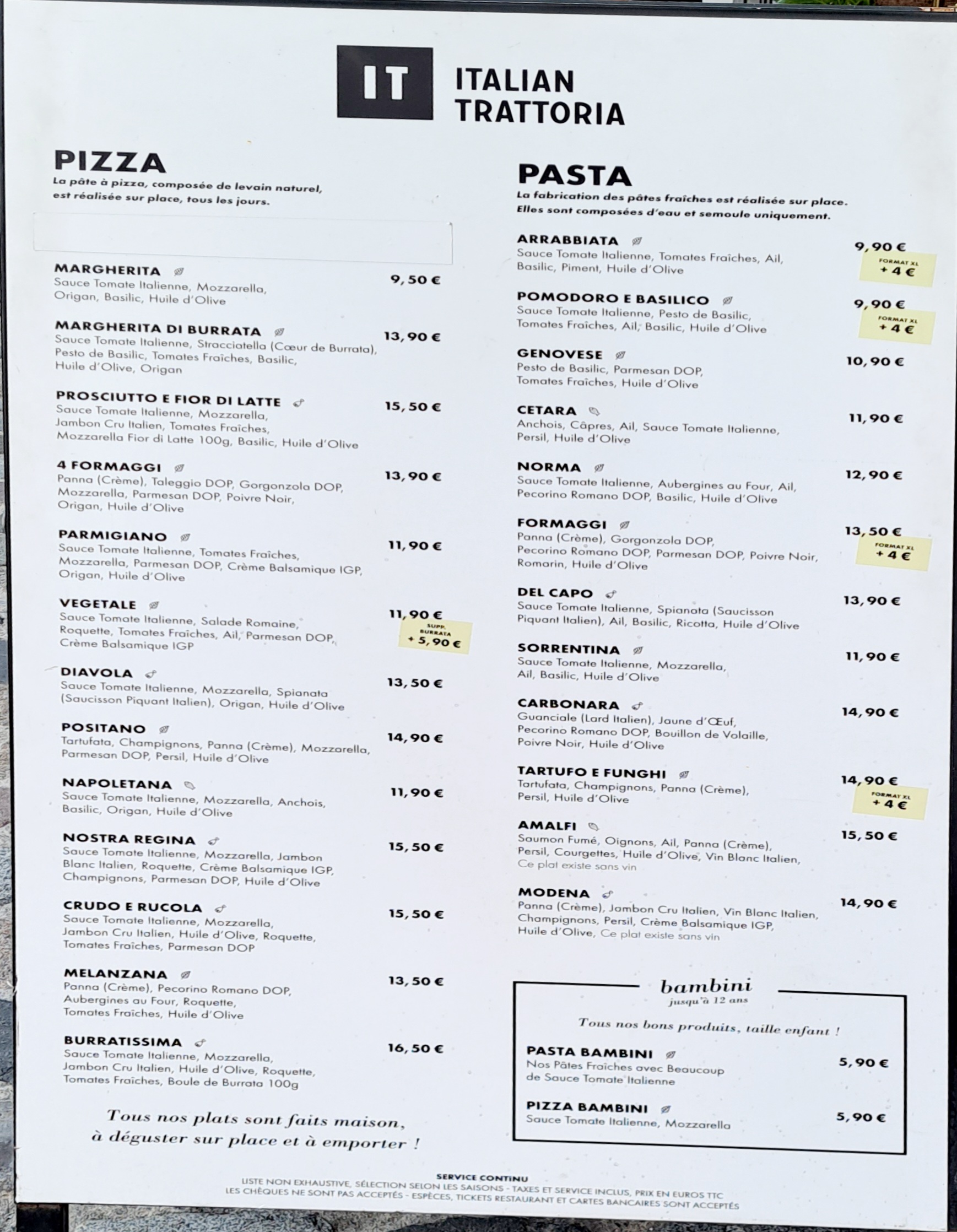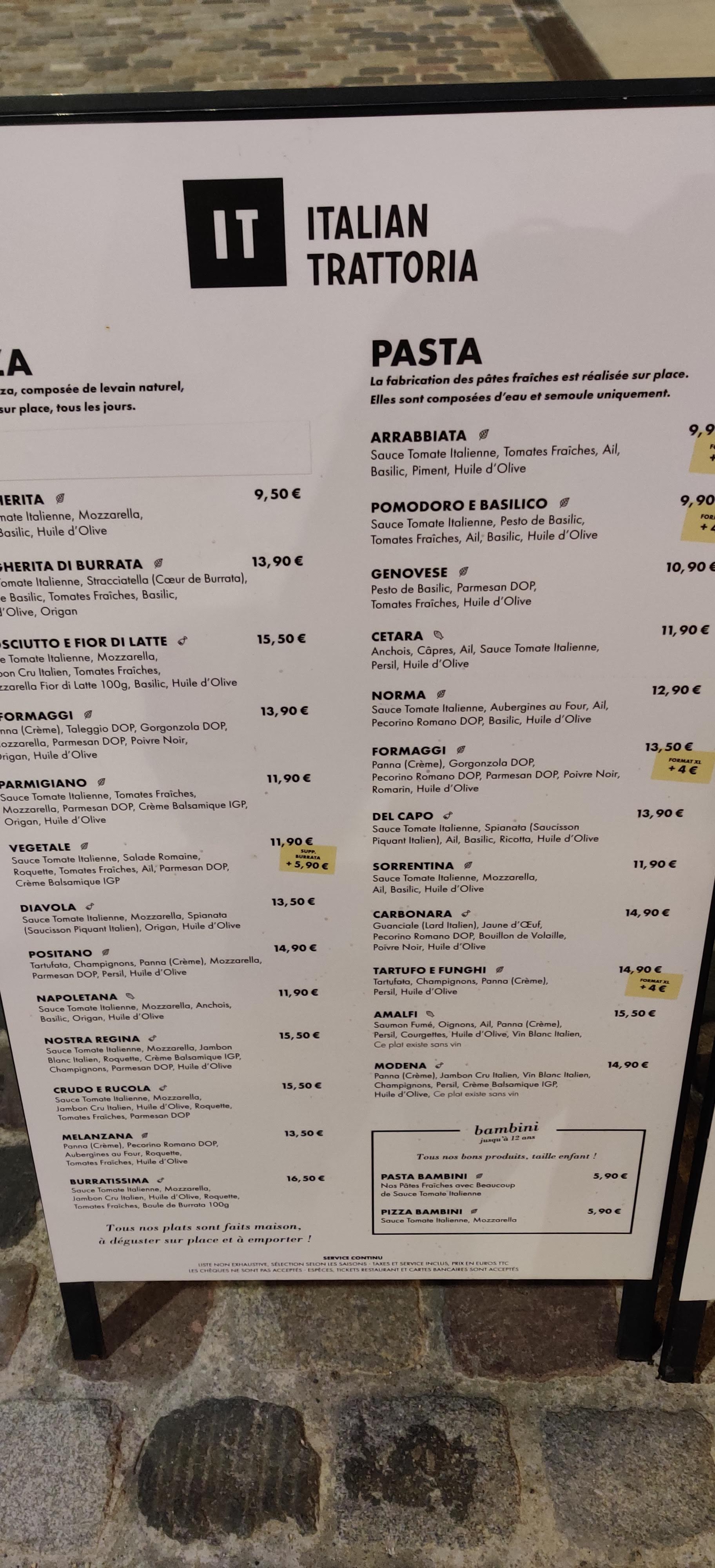 Bonsoir, Nous étions un groupe de six, 4 adultes et 2 enfants et notre serveuse nous a bien accueillie et trouvé direct une table en terrasse. Dés le départ déçus de la carte qui ne dispose pas de photos et ne précise pas quel sorte de pâte se trouve dans les plats.(Notre serveuse nous a expliqué que cela dépend du plat), justement les ingrédients et sauces des plats sont décris, je n’ai pas compris. Nous n’en avons pas pris car entre autre, c’est la forme des pâtes qui nous font choisir. Les pizza sont bien mais trop fines !! La Diavola beaucoup trop de sauce tomate, on ne sentait pas le goût des 2 autres ingrédients. Tandis que la Positano truffe, trop de champignons en visuelle ou en goût. Plus déçus de ne pas en avoir vu au moins 1 fine tranche de truffe, seulement saupoudré mais le goût y était. Ils ont oublié de compléter une commande et pas de proposition d’eau, en été. On nous a débarrassé et nous a même pas demandé, proposé des desserts, même pas expliqué qu’il faut se lever et aller choisir au comptoir. On l’a deviné en regardant les autres, moyen. Les plats enfants 5,90E, au prix des desserts je ne sais pas comment le prendre, de plus pas de glaces, surtout en été gros flop !!! Les chaises en fer trop brillante également c’est dommage. Malgré c’est petits couac les serveurs avait le dynamisme et le sourire, ça fait plaisir. Courage à eux.