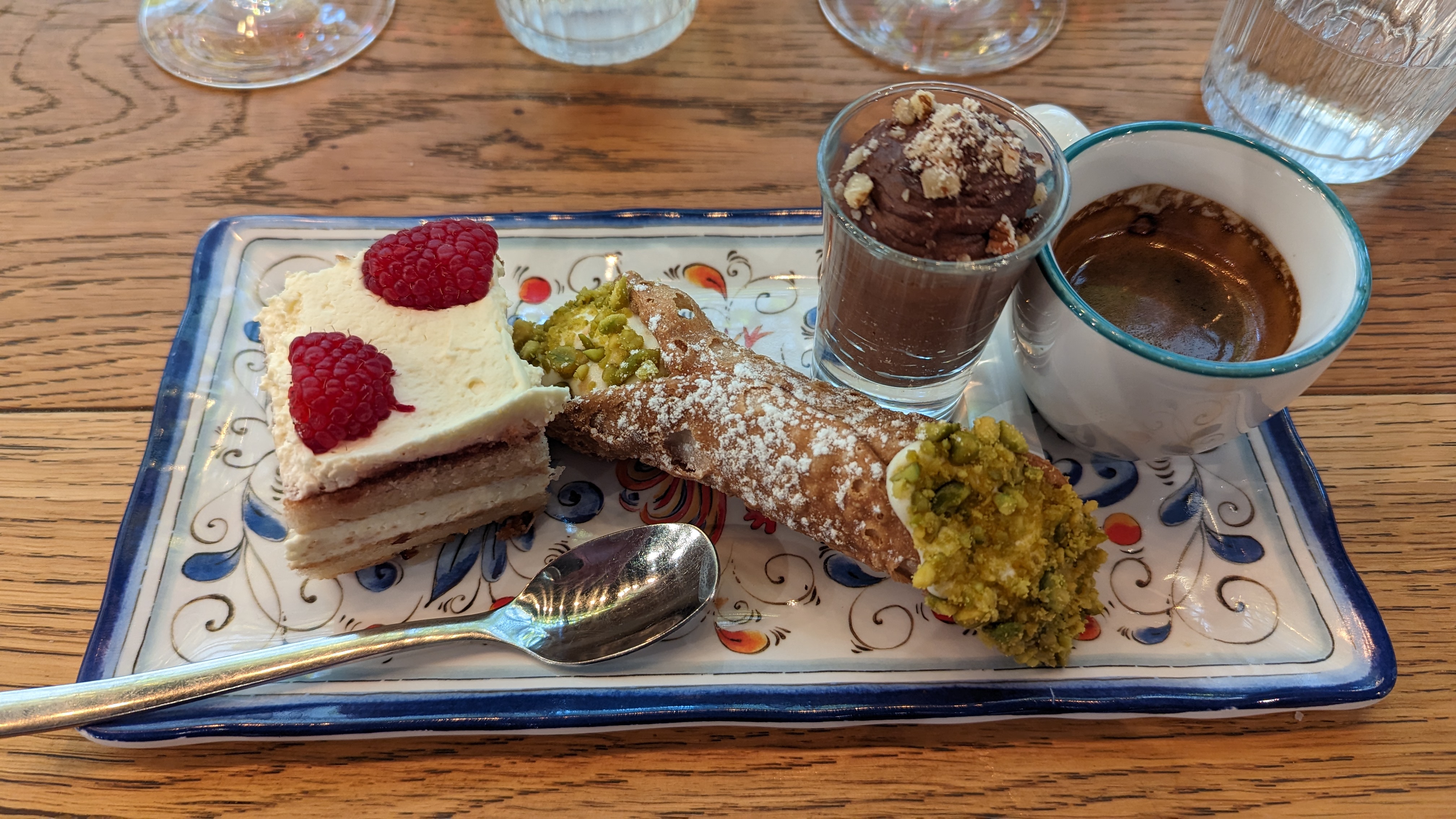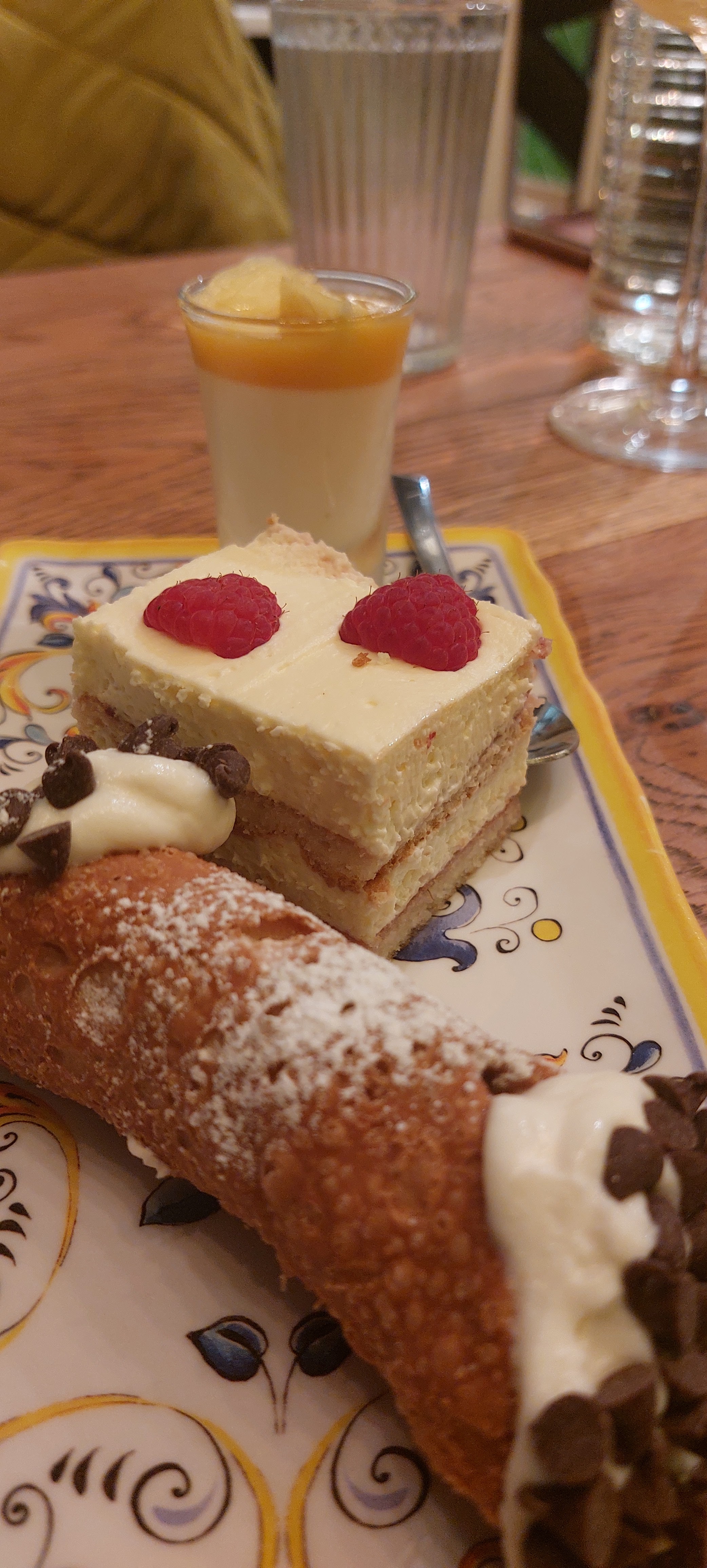 En sortant de la visite des bassins des lumières, à 14h, superbe déjeuner tardif (aucun soucis pour l'arrivée tardive). Accueil sympathique, choix d'une pizza vegetale, de pasta amalfi et de pasta modena : les 3 sont succulents et copieux. On se laisse tenter malgré le ventre bien rempli 😉 par un dessert : gâteau au citron meringué, panna cota aux fruits de la passion avec framboises, et gâteaux Charlotte à la framboise. Total de 81 euros pour 3 (avec boisson, sans café). Je recommande vivement !