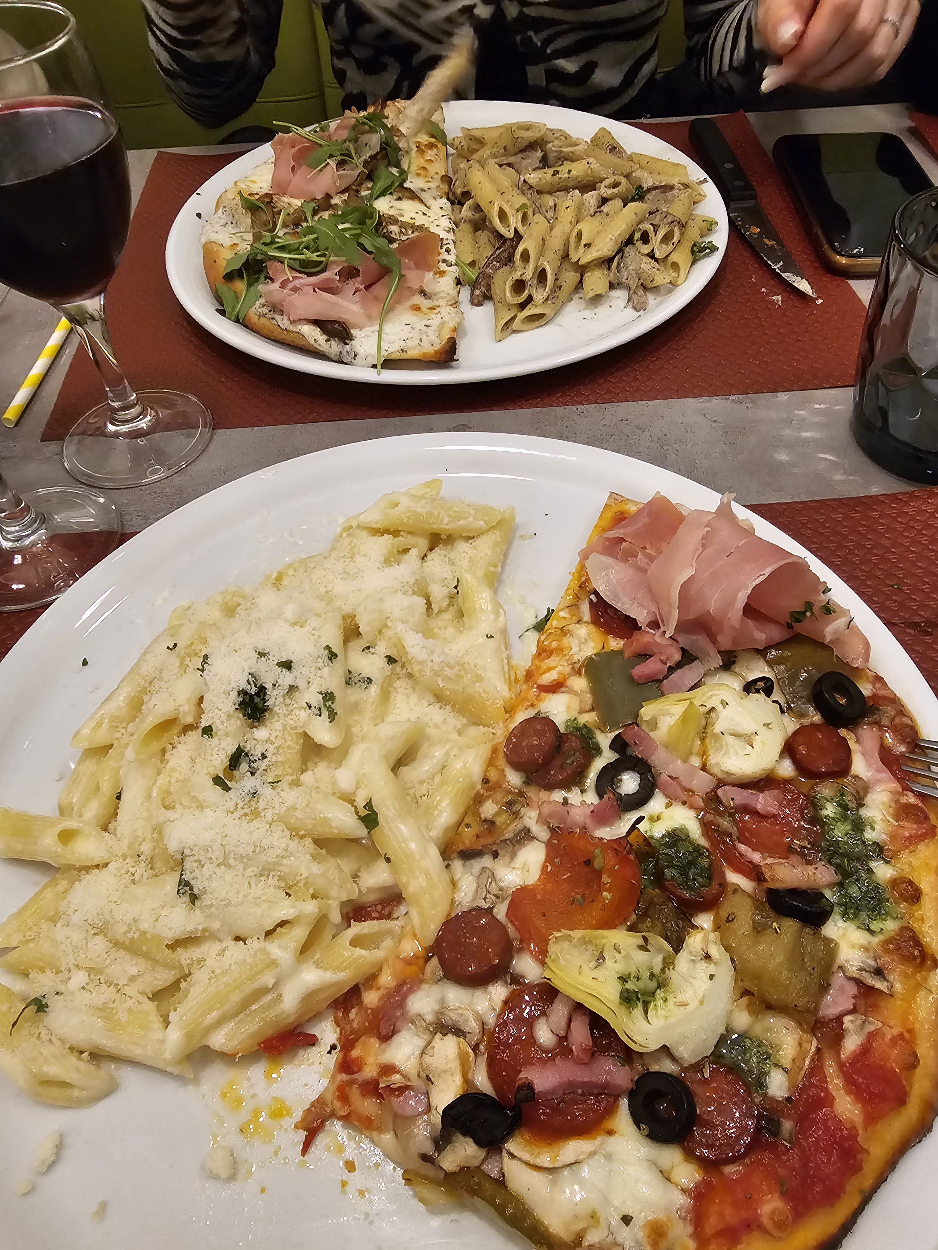 Délicieux restaurant Il propose de prendre 1/2 pizza et des frites ou des pâtes a côté pour le même prix, j'adore le principe