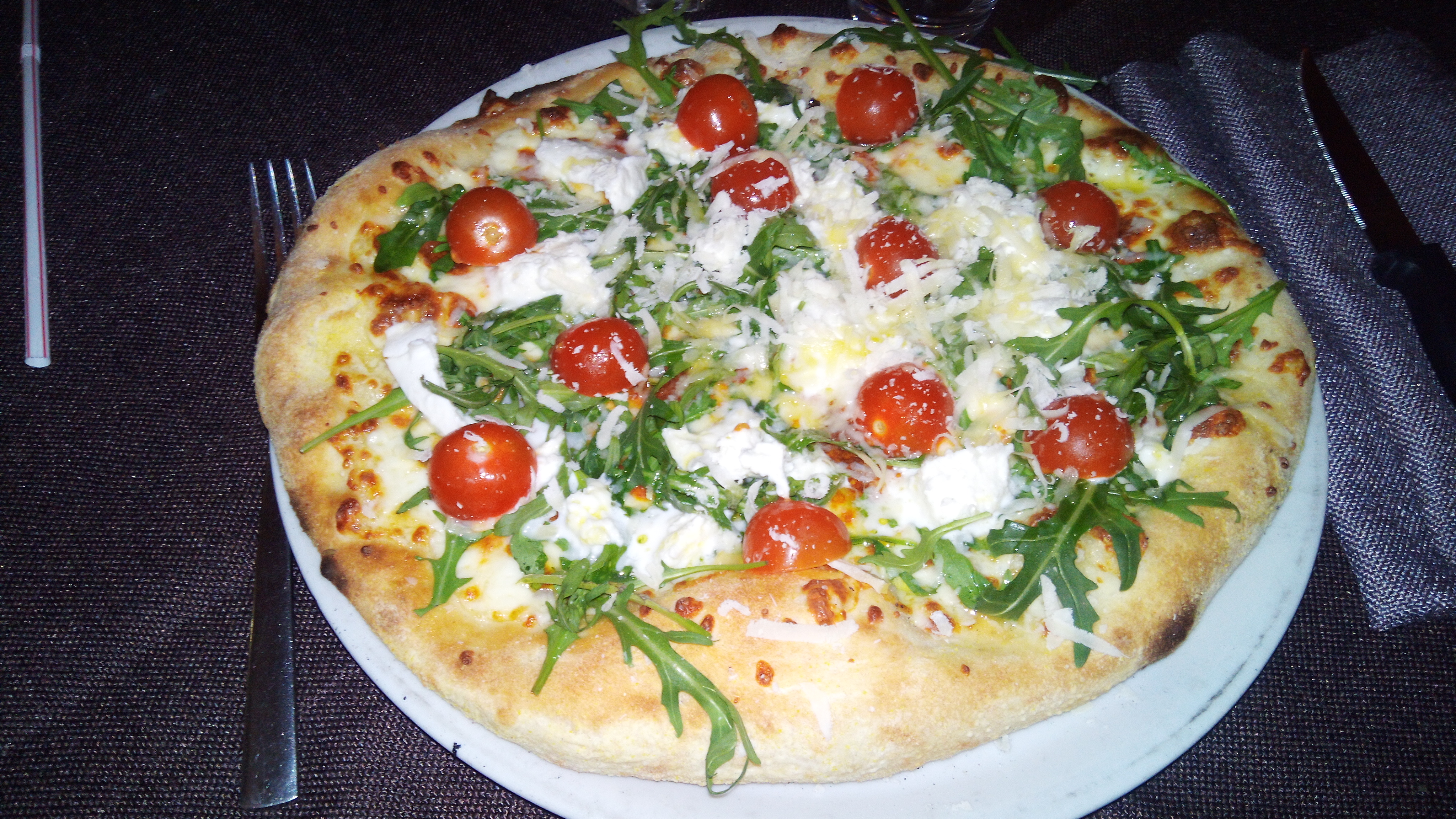 Personnel souriant et aimable. Pate à pizza tourne à la mains et cuite au feu de bois. Plat bon et genereux