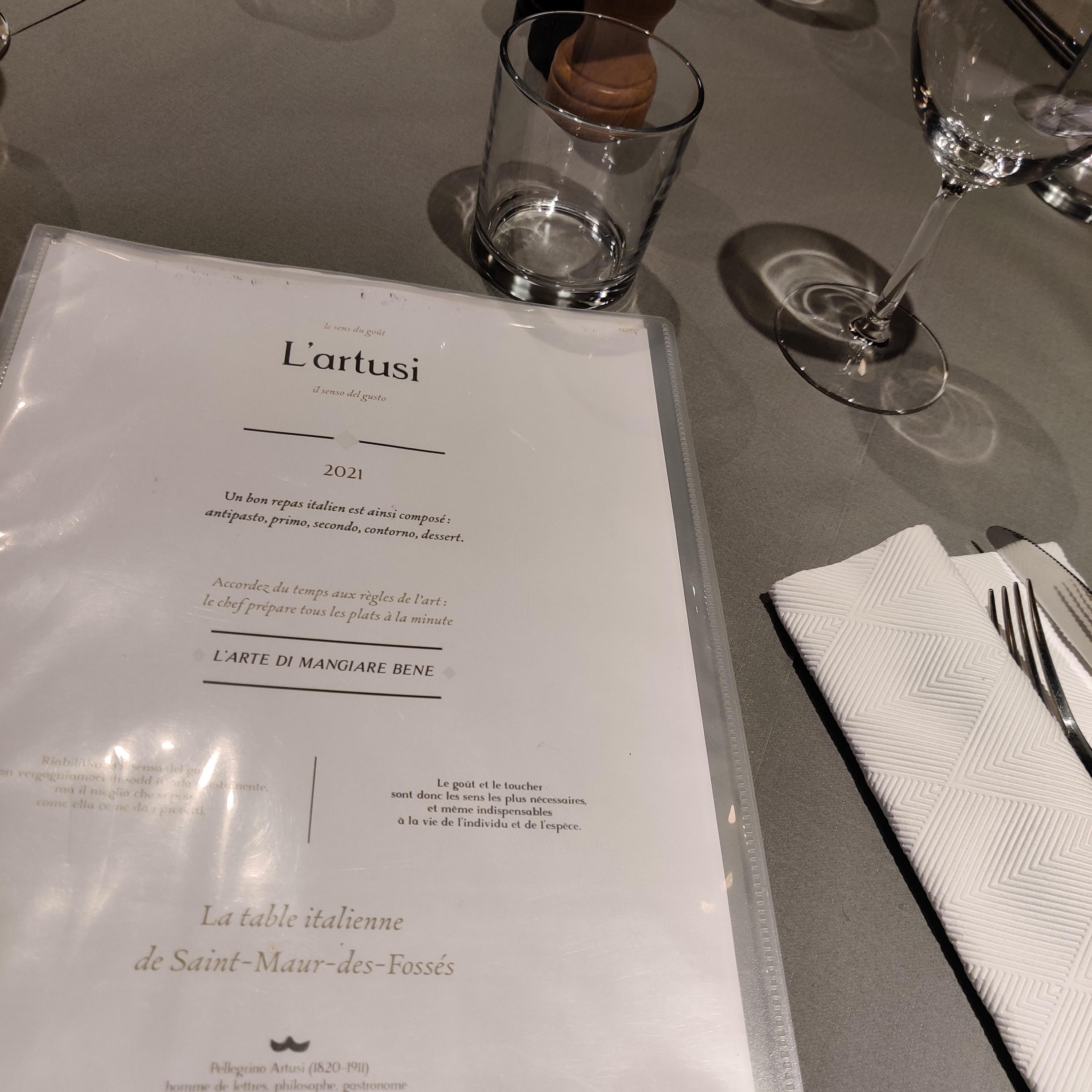 Accueil très chaleureux, des plats fins et copieux, de très bonnes spécialités italiennes, carte cuisine traditionnelle française bien fournie également. Un service aux petits soins avec une petite touche d'humour bien agréable. L'Artusi est une très bonne adresse
