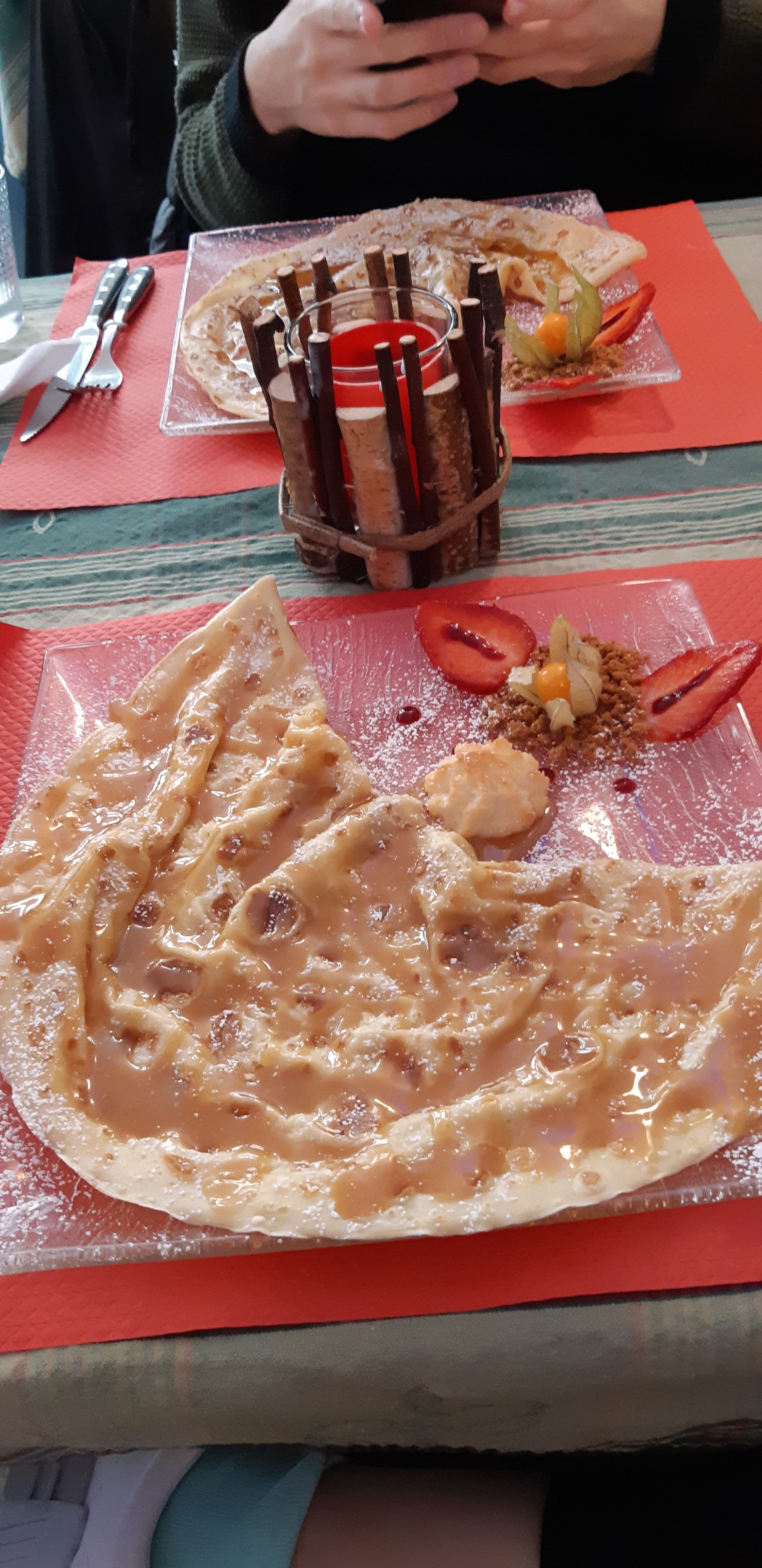 Excellentes crêpes à la crème de grand marnier et cannelle et spéculos émiettés, accompagnées d'un bon cidre, à la fois doux et sec. Belle ambiance chaleureuse et accueillante