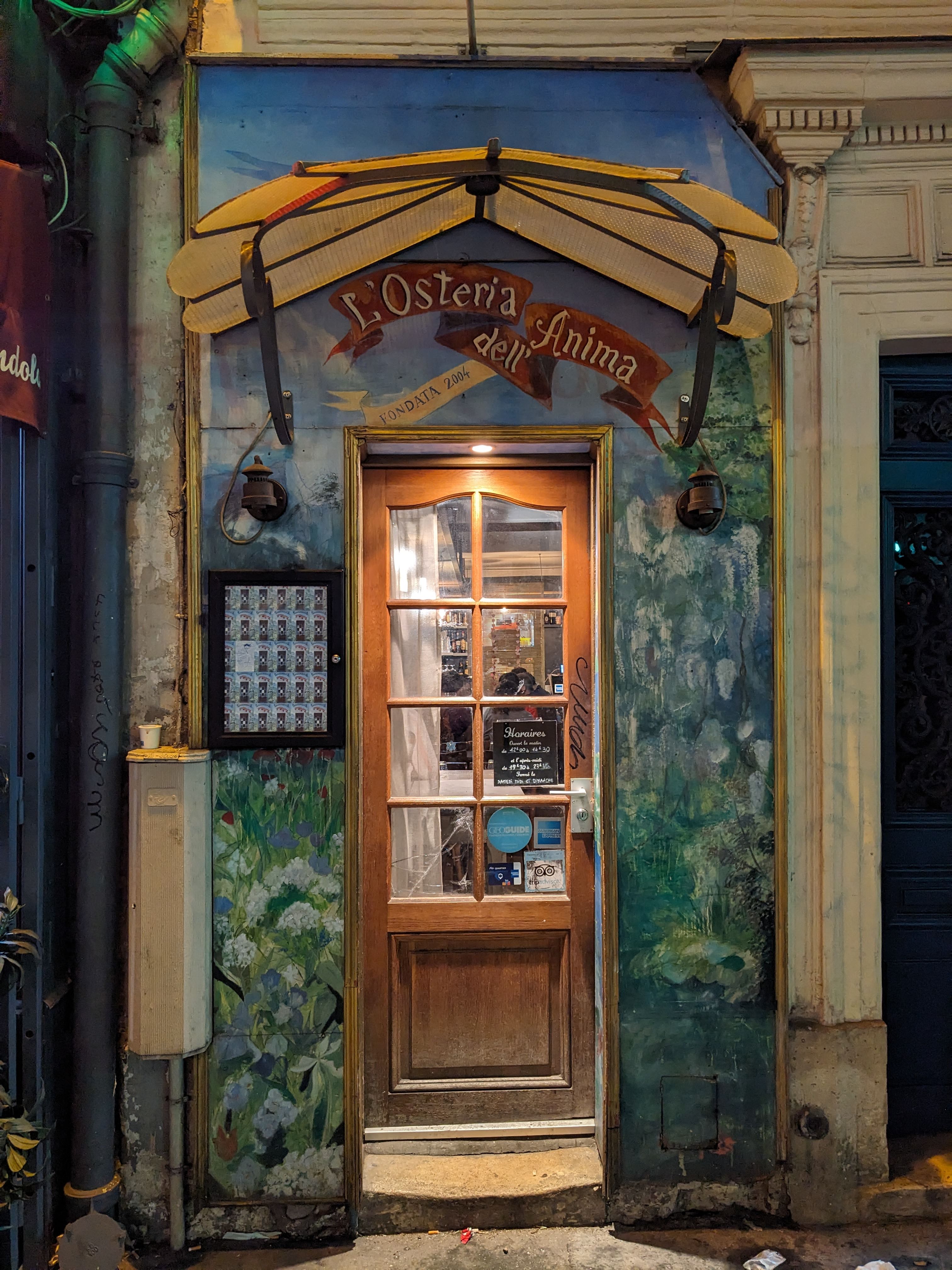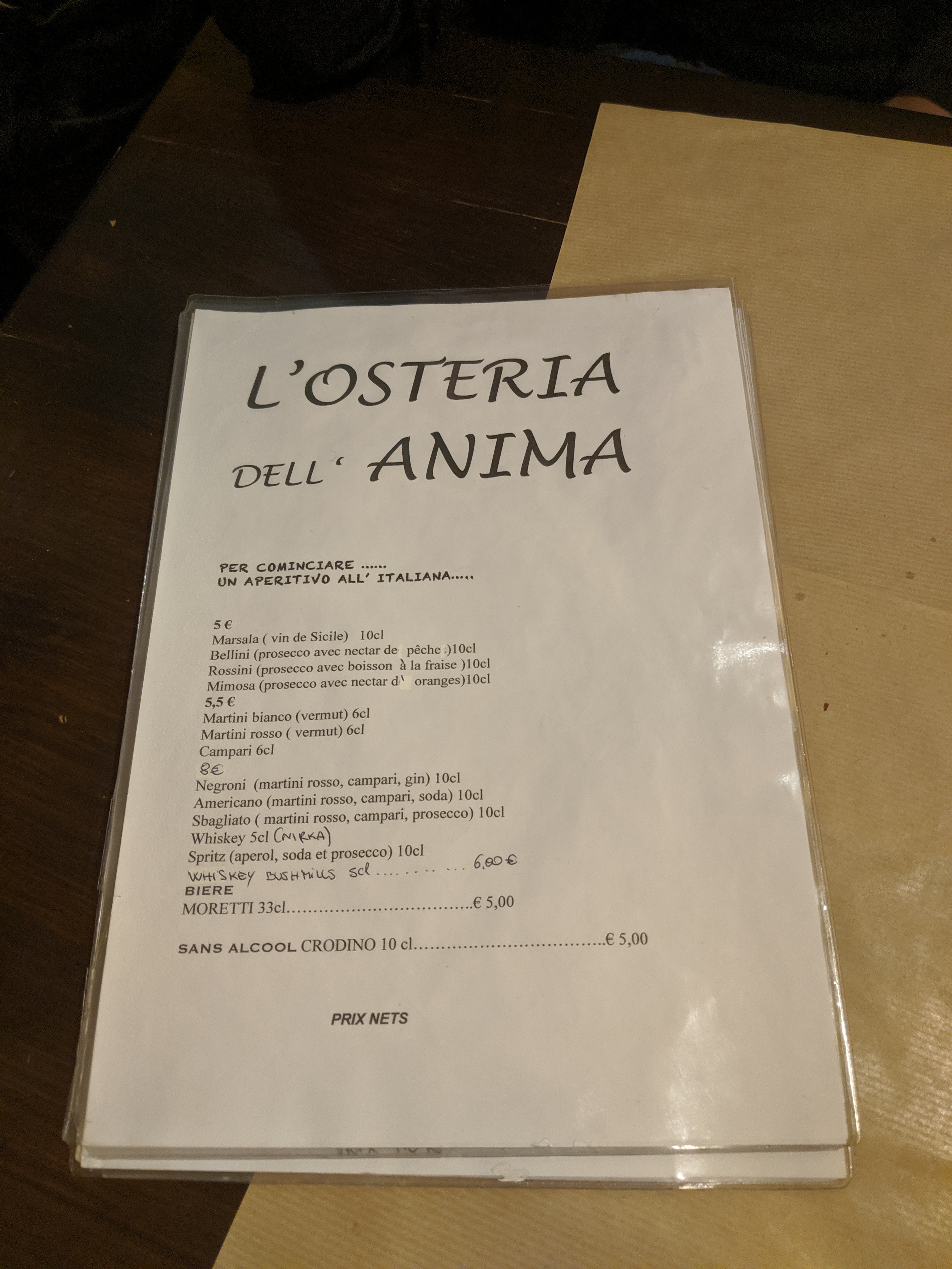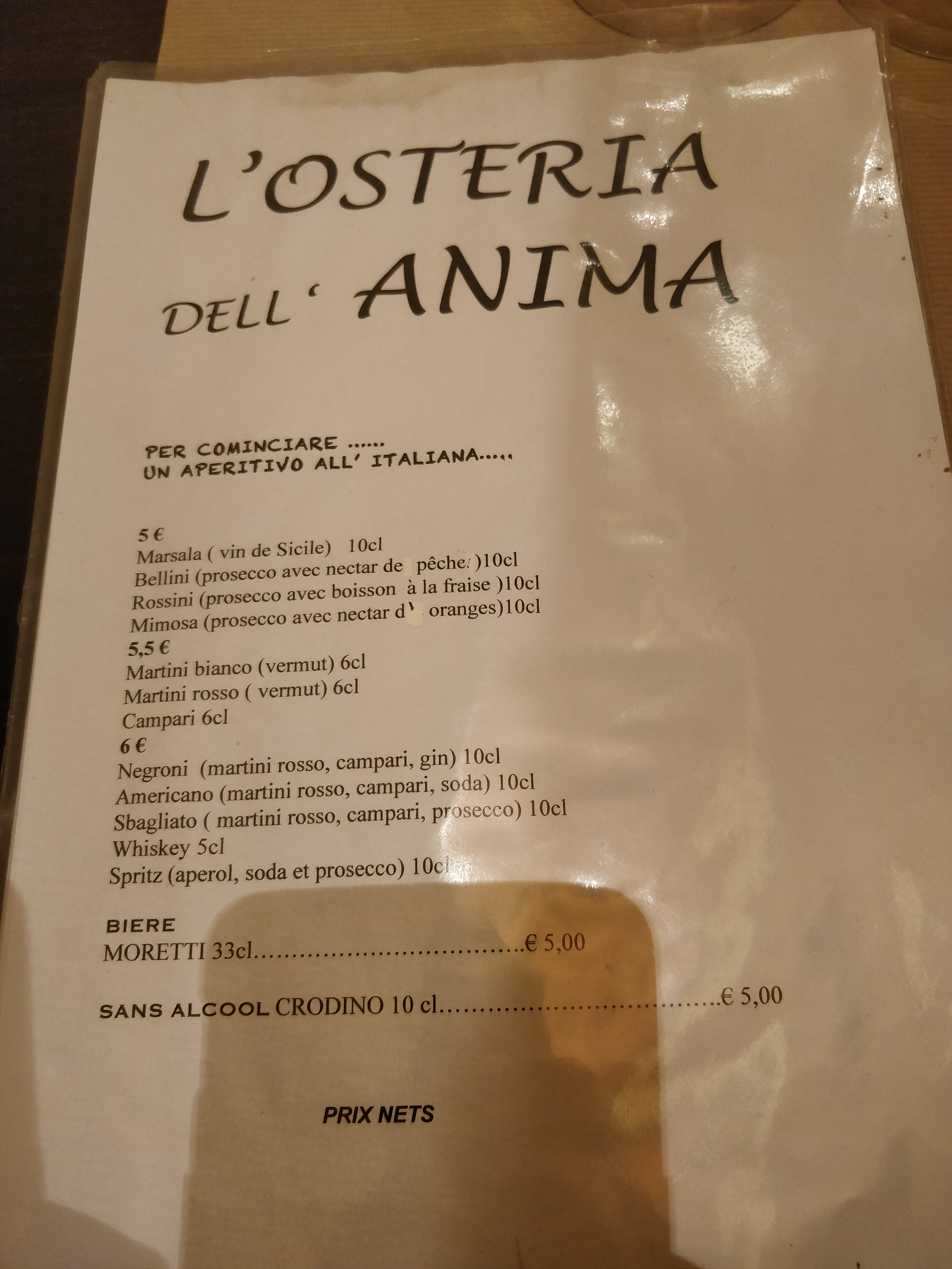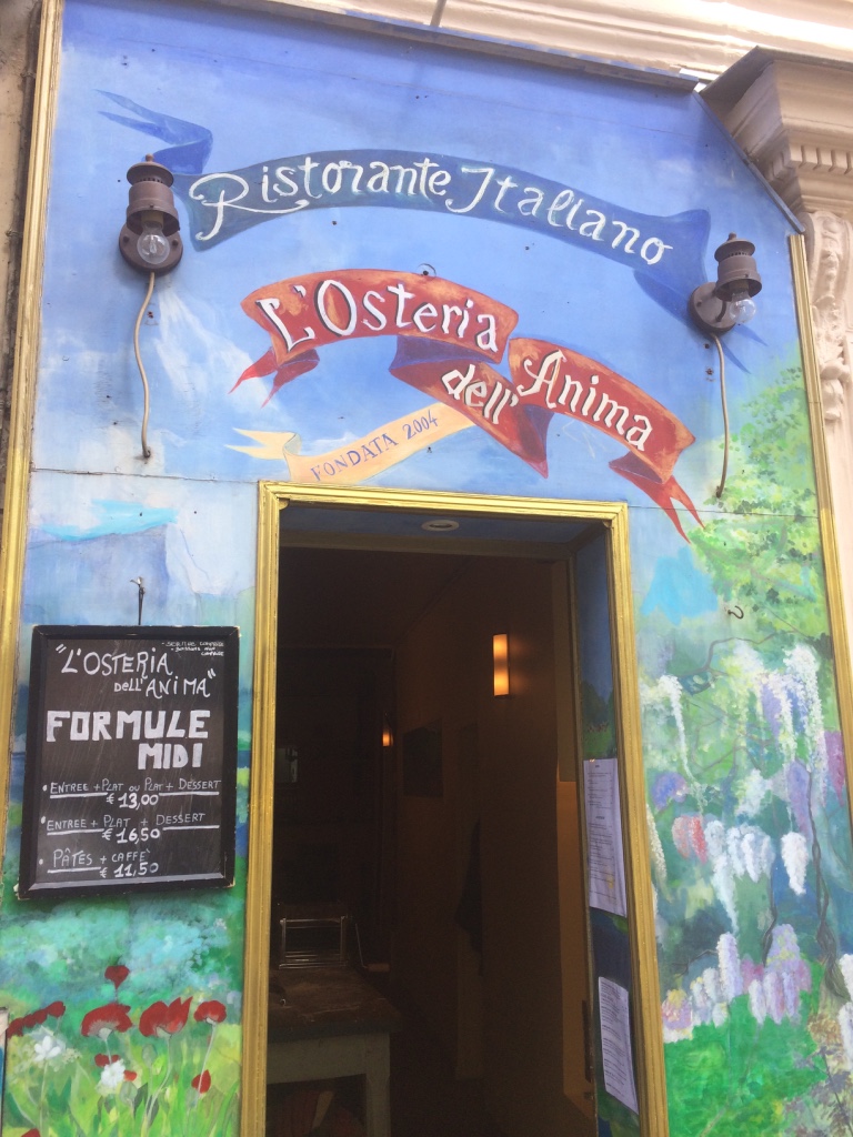 Recommandé par une italienne expatriée, j'ai testé ce restaurant dont le nom signifie l'auberge de l'âme . Le restaurant est minuscule, très intimiste, c'est une adresse réservée aux initiés. Accueil sympathique et chaleureux. Les plats sont composés en majorité de pâtes avec un plat de lasagnes et un (ou deux) plats de gnocchis. La qualité est au rendez-vous, fraîcheur incontestable, c'est gourmand et savoureux. Les quantités sont suffisantes. J'avais envie d'entrées plus originales ou gourmandes, j'ai gardé une place pour le dessert. Dessert qui fut excellent, un véritable tiramisu comme on les aime. Rien à redire, je remercierai la personne qui m'a recommandé et je vous le recommande à mon tour. Attention : pensez à réserver et à être ponctuels, les places se méritent.