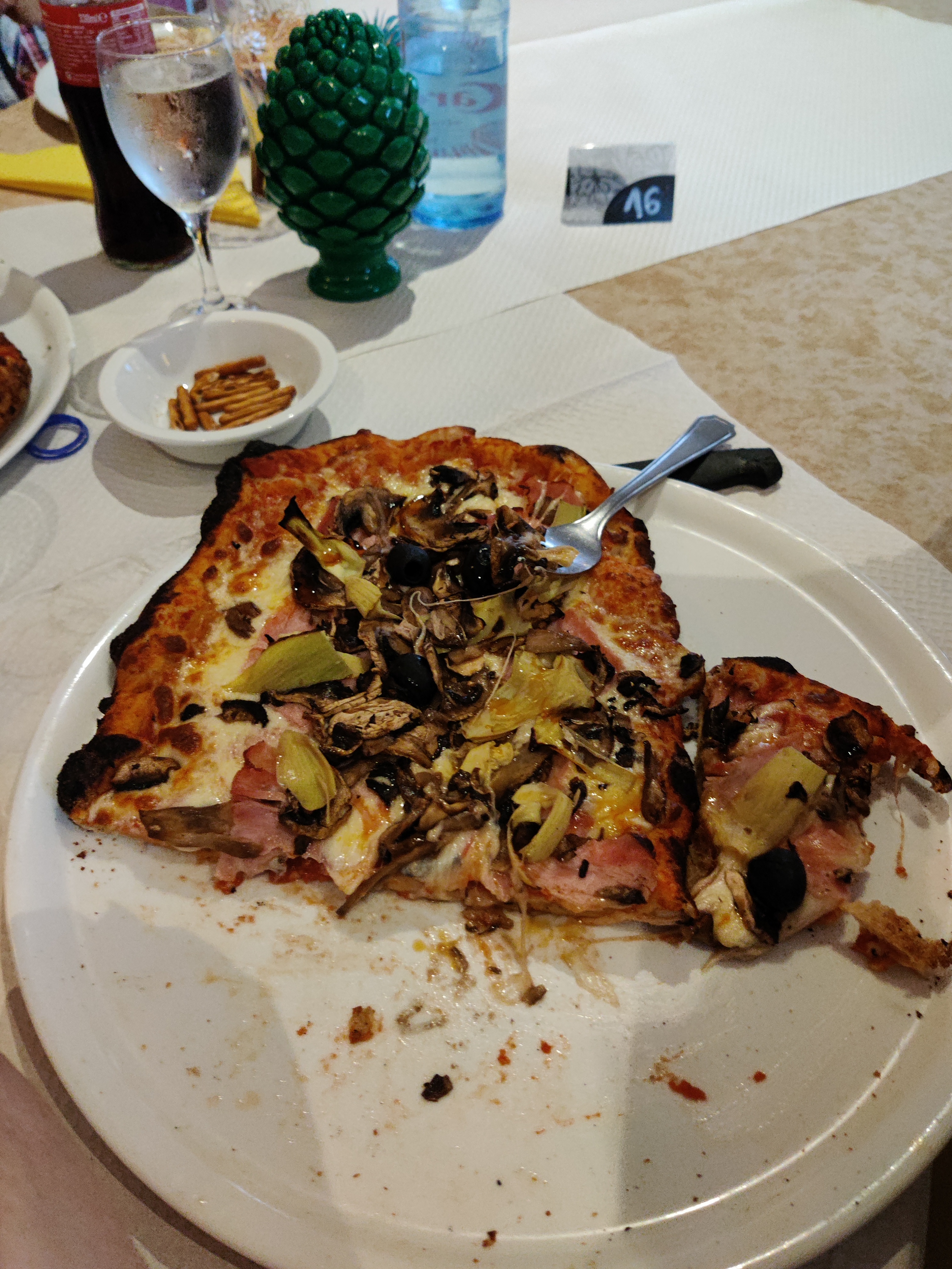 Pour commencer peu de décoration, et rien en rapport avec le thème de la Sicile. Le repas quant à lui n'est pas mauvais, mais la pâte des pizzas est sérieusement dure, très dure à couper. Sans oublier la Forme rectangulaire qui cache en réalité l'idée de 2/3 de pizza pour un prix de 12-16€.
