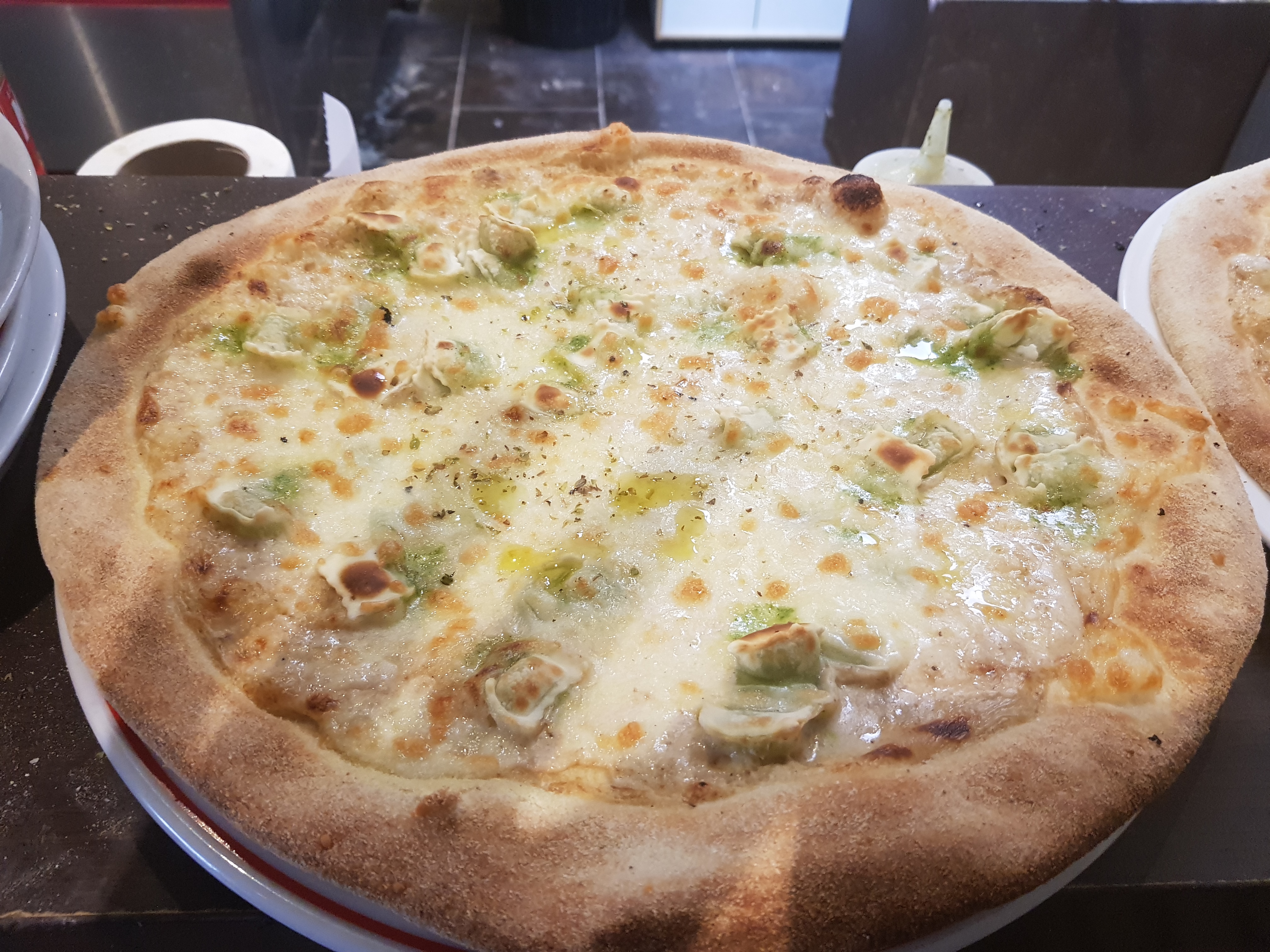 Pizza aux 4 formages très décevante c'était de l'huile d'olive qui baignait sur de la pâte à pizza et très peu de fromage. Quant au gâteau au chocolat il était très écœurant. Bref le tout très décevant.