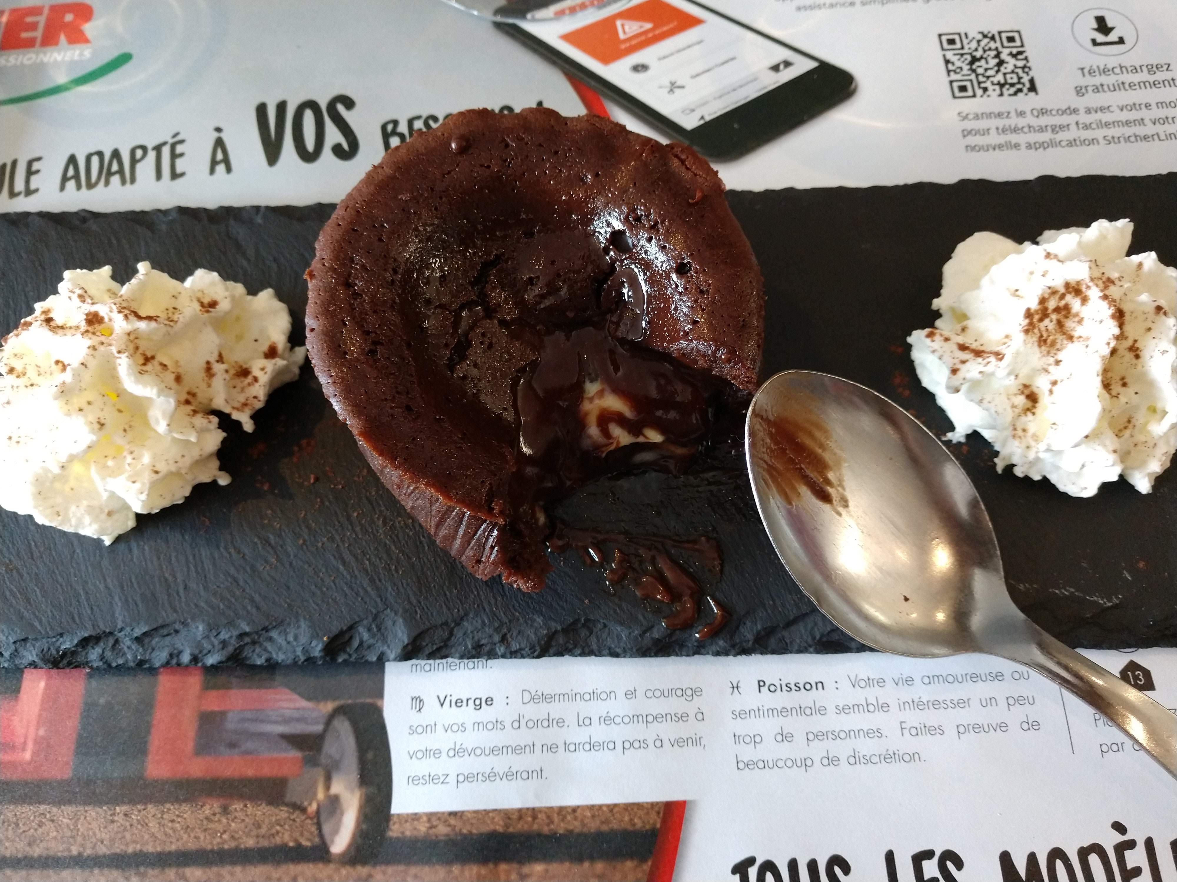 Serveur vraiment sympa, pizzas très bonnes, seul hic : champignons alors que commandé sans... Mais compensé par un très bon moelleux au chocolat noir/blanc. Je recommande !