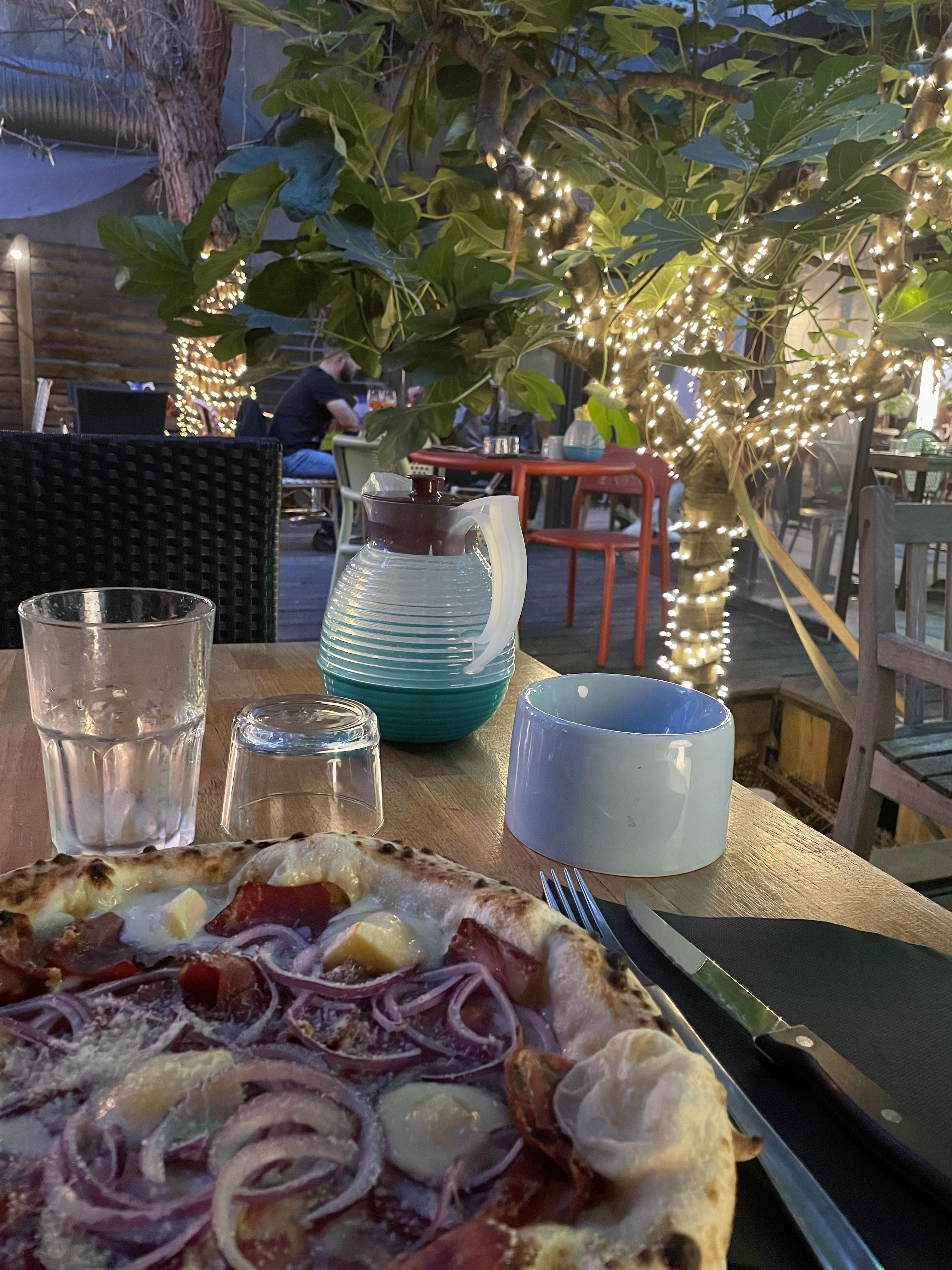 Moment agréable dans le patio sous les bambous pour manger une bonne et vraie pizza italienne accompagnée de vin italien