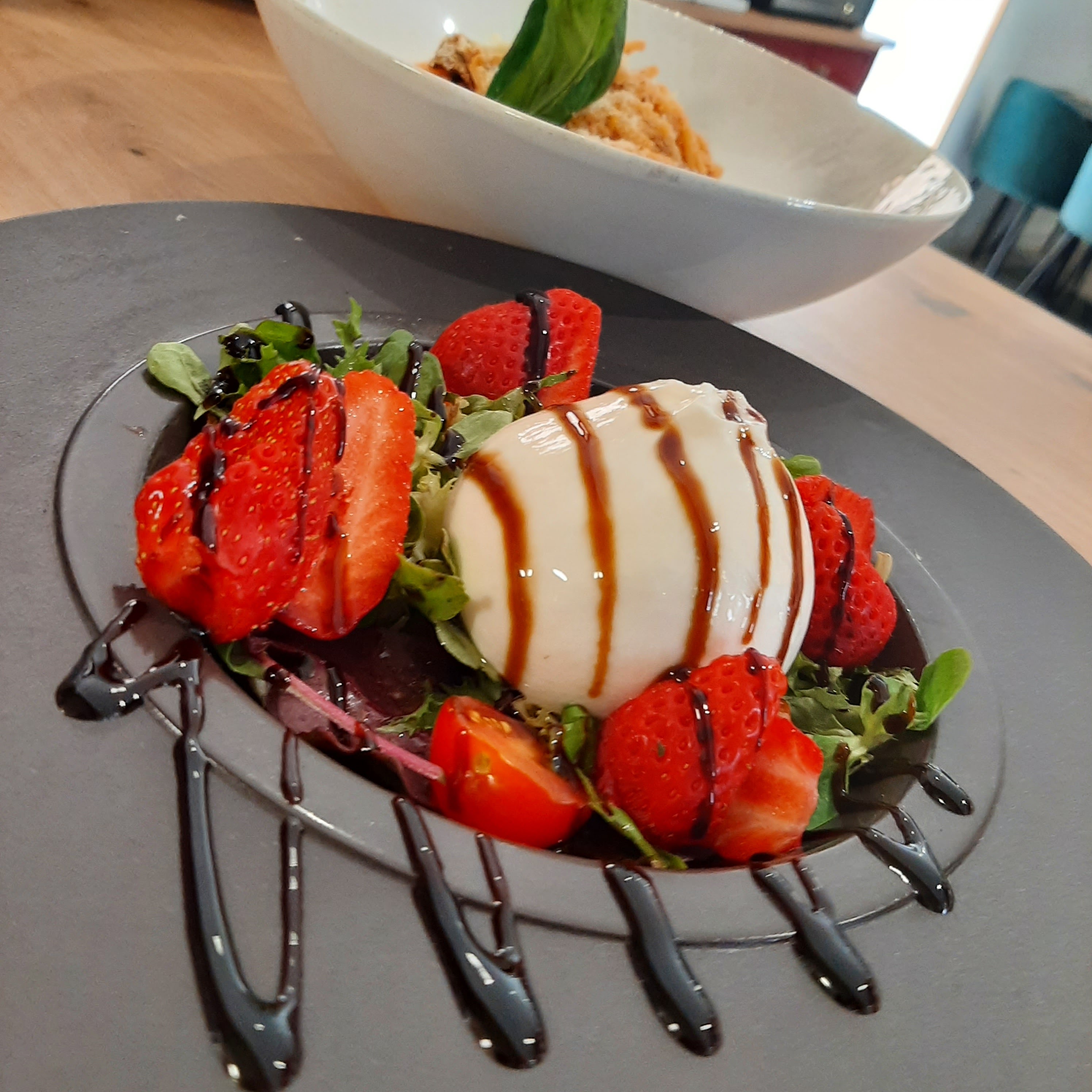 Portion de spaghettis suffisante mais la salade du moment est vraiment très peu remplie, la mozzarella di buffala prends une place importante dans l’assiette donc donne l’effet wow mais seulement 3 tomates cerises et 2 feuilles de salade pour l’accompagner. La salade ne vaut pas du tout son prix. La panacota en dessert était bonne. Service agréable mais minimal, il faut systématiquement demander pour du pain et/ou de l’eau.