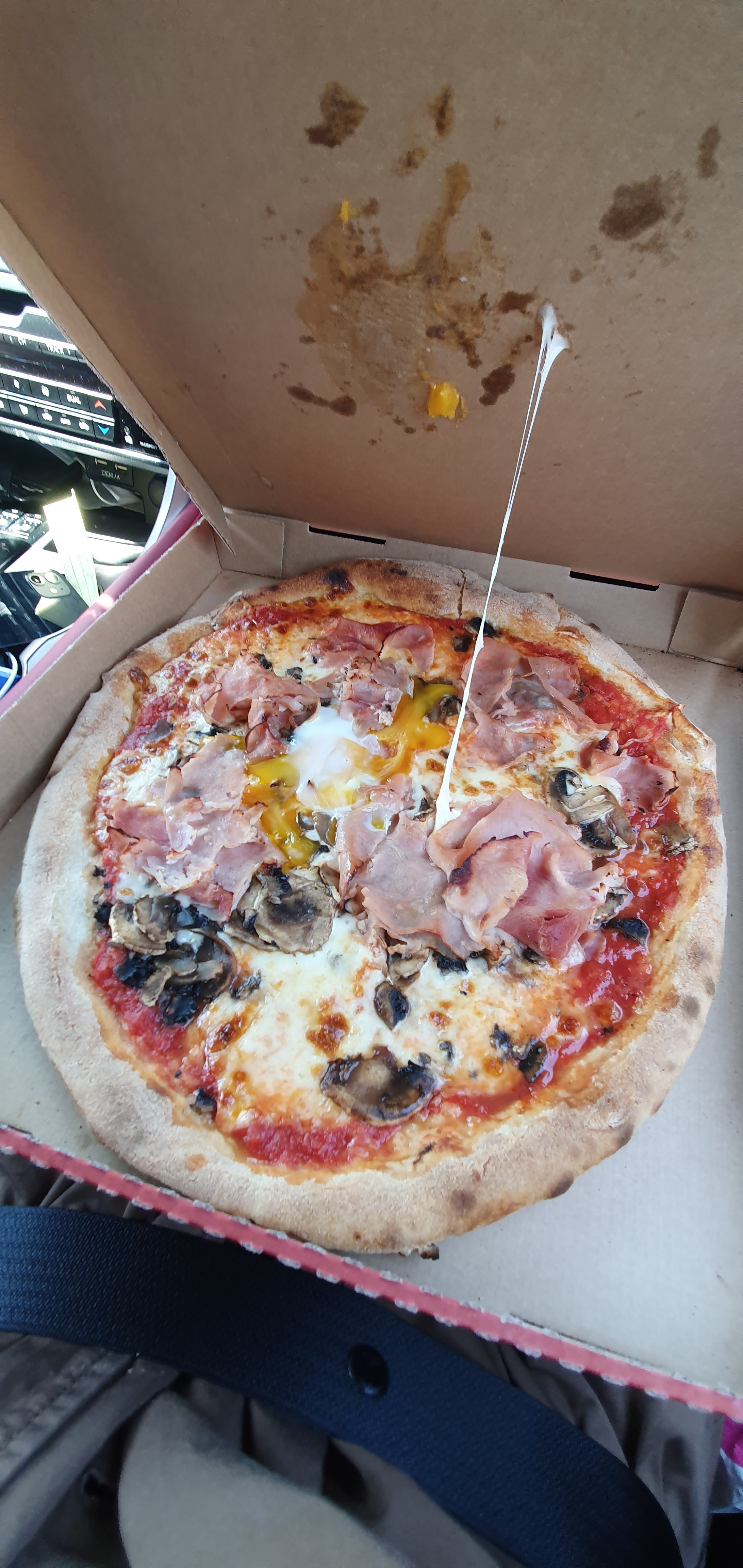 Pizza beaucoup trop grasse. J'habite à 5 min en voiture et toute l'huile de la pizza à eu le temps de traverser la pâte, bien trop fine, imbiber le carton et le siège passager de mon véhicule...