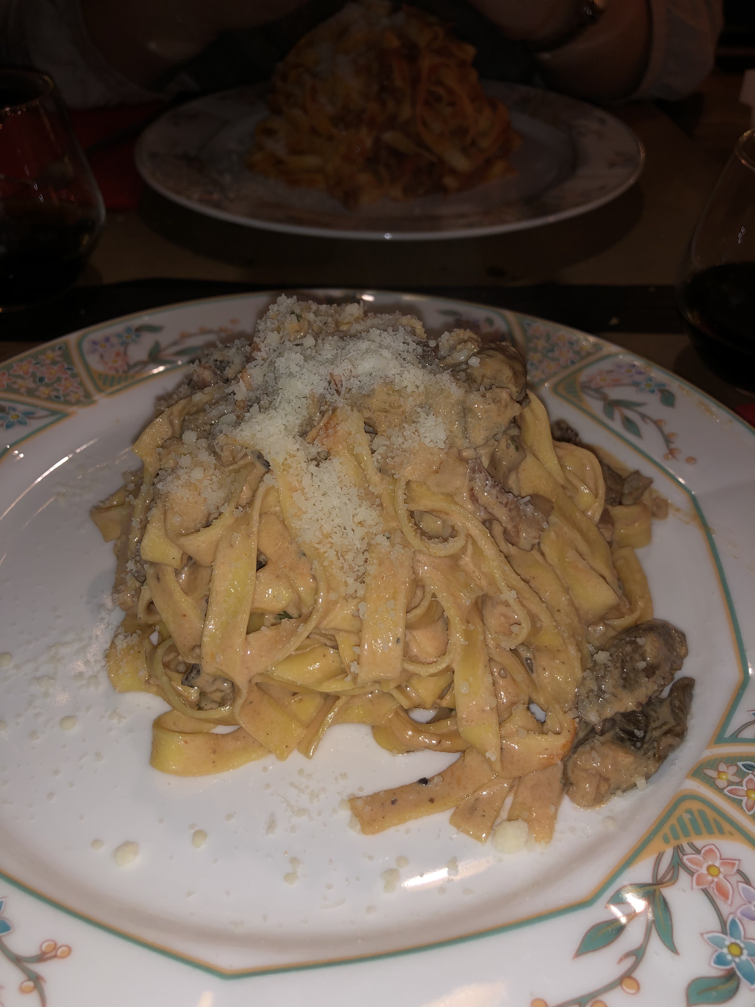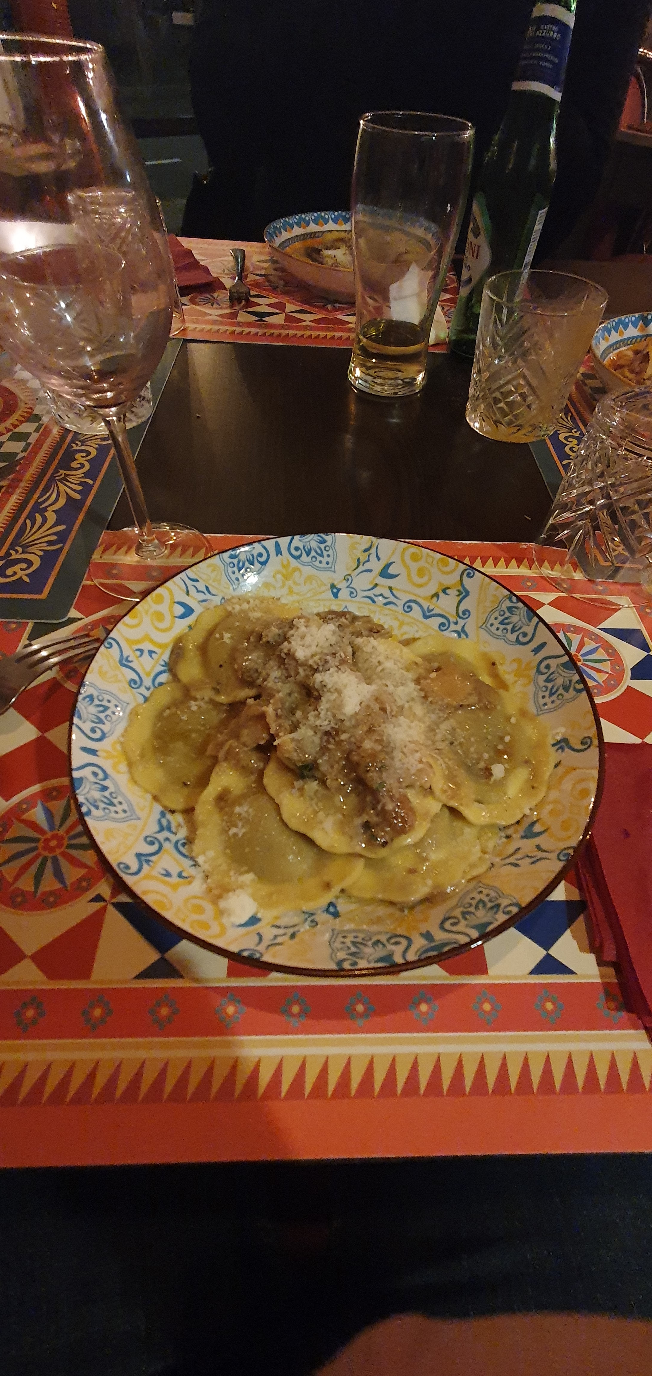 On a mangé chez la mamma 😀 Pur et vrai italien Ravioli aux truffes au top Vin rouge petillant est une dinguerie On a payé 77€ pour 2 avec 2 aperos, 2 plats, 2 desserts et une bouteille de vin. Seul les bouteilles de vin m'on paru un poil cher