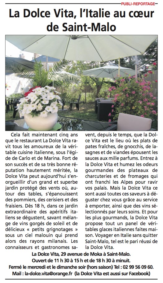 Malouine je suis,et comme beaucoup d'autres malouins j'appécie la cuisine italienne,et en particulier celle de la Dolce Vita tenue par de vrais italiens qui vous concoctent des pàtes succulentes .Par contre il faut du temps pour les préparées avec la petite touche de la mama.Allez au restaurant,c'est prendre son temps,sinon il faut choisir la restauration rapide