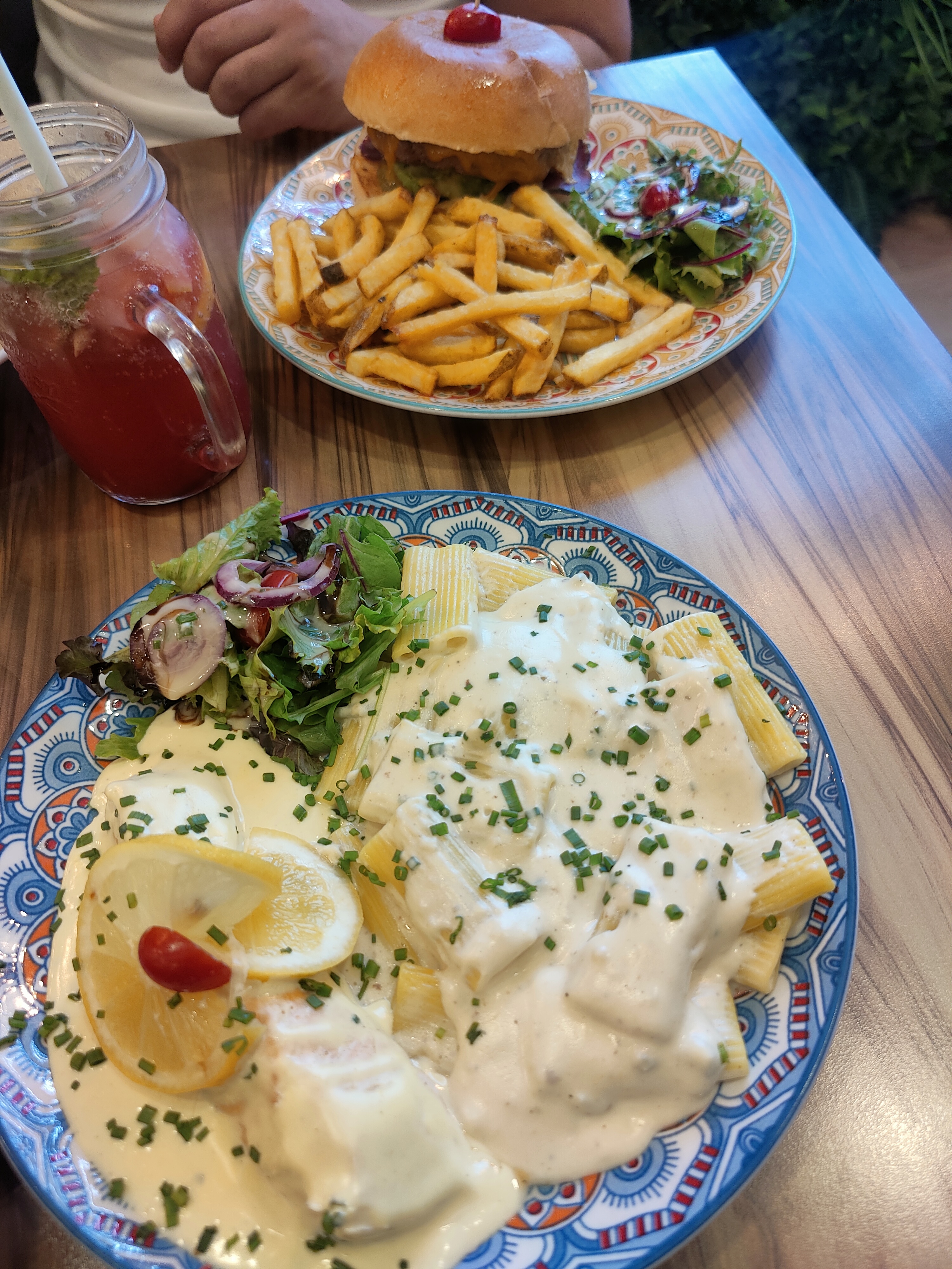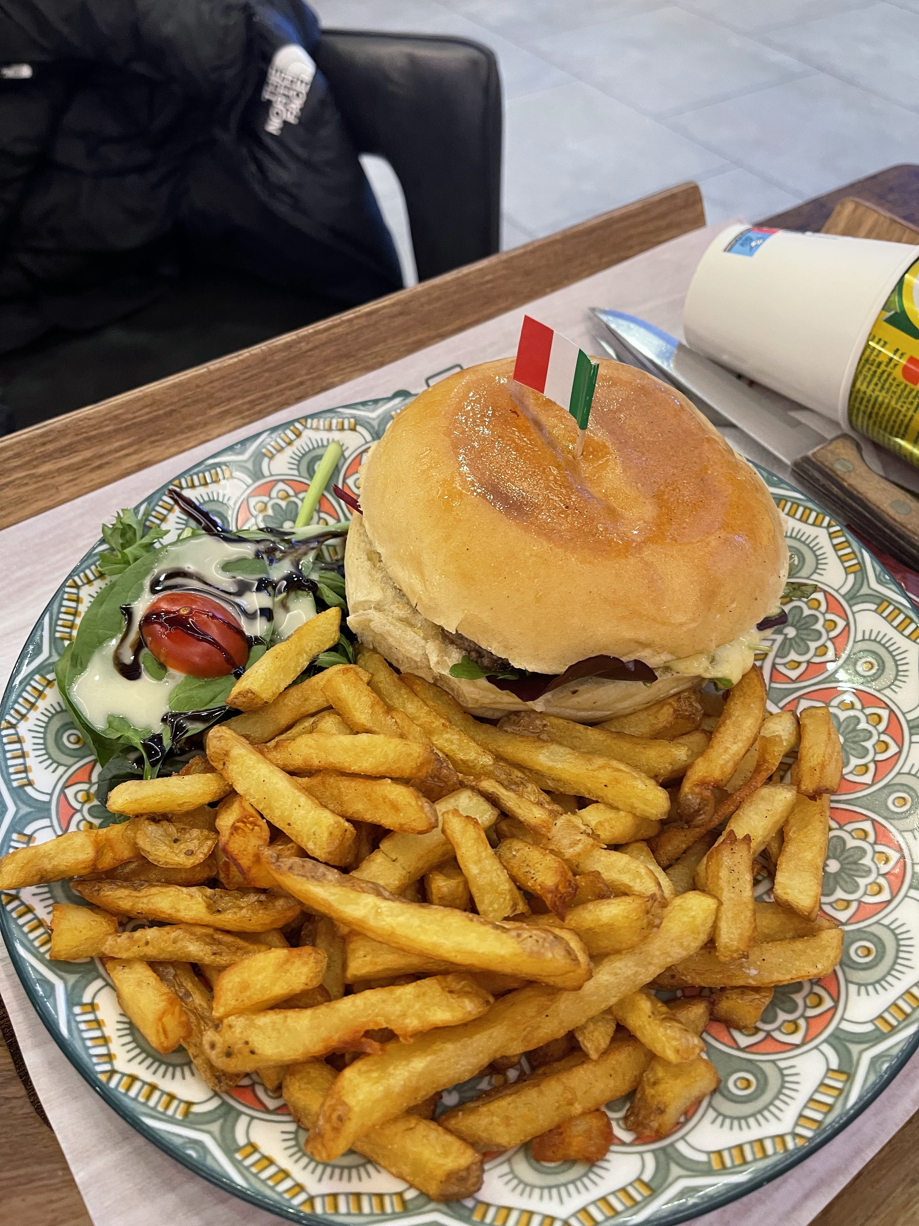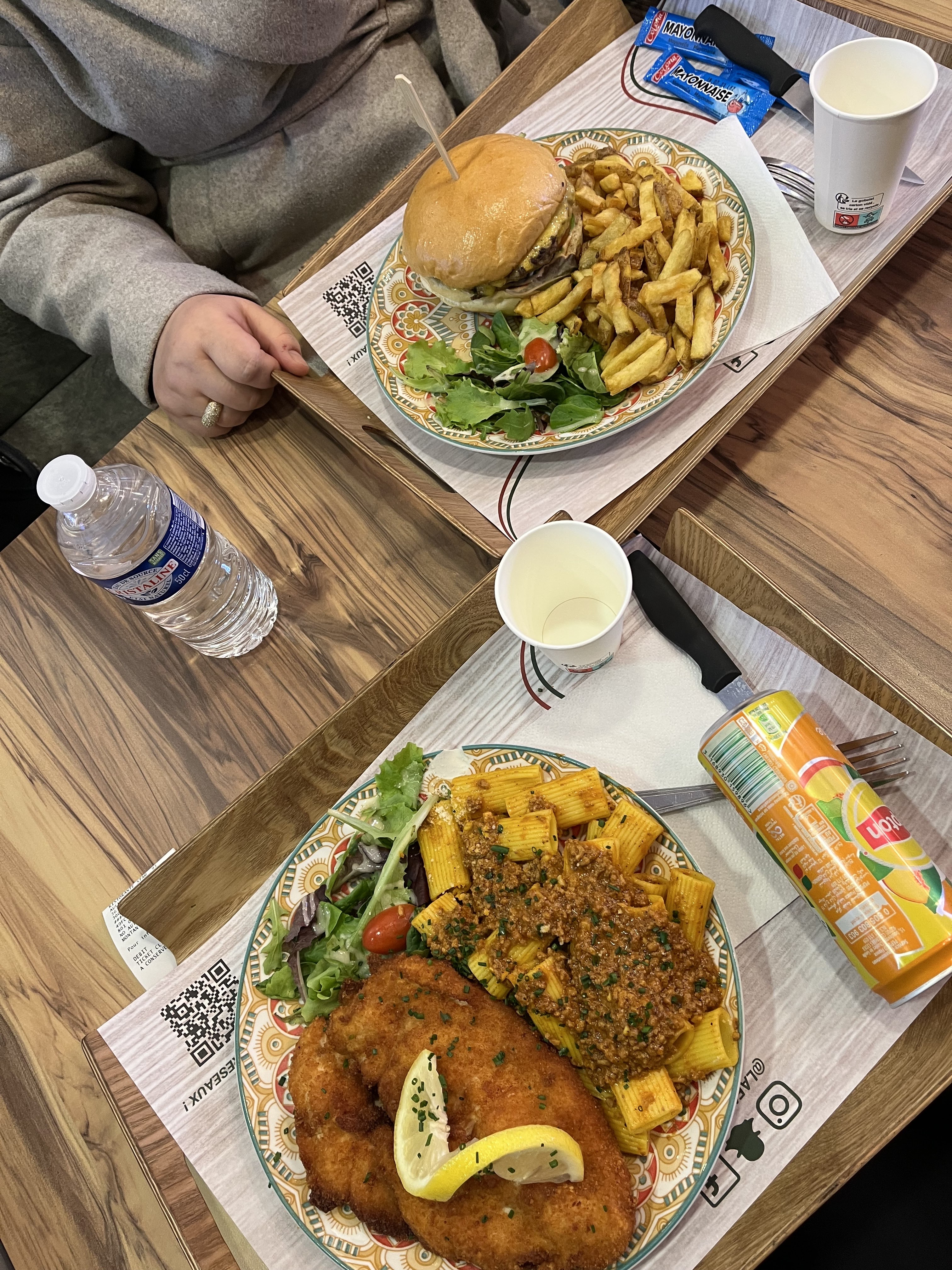 Première visite dans ce restaurant , très belle décoration Restaurant Italien Halal Commande en borne ou en caisse Affichage dès que la commande est en préparation et ensuite prête Présentation des plats très soignés Très beau plateau, dommage que sa fasse restaurant fast-food Burger joli et bon goût mais a moitié cuit malgré la demande de la cuisson en caisse Frites non salées Pizza reine très bonne Déçu par la burrata pas assez coulante mais les légumes sont confies très bon Cocktail sans alcool très bon Italien mais assiette déco orientale
