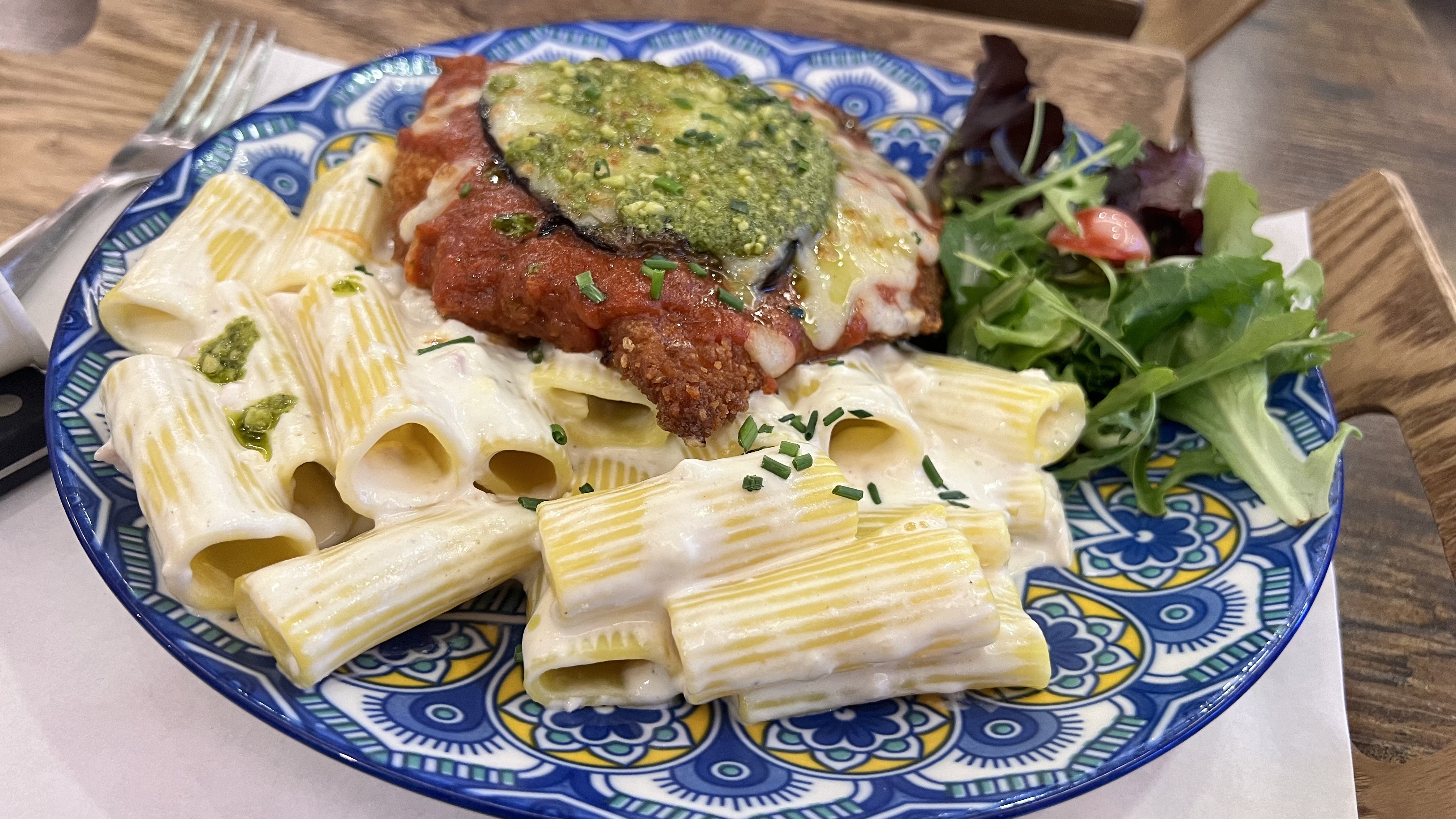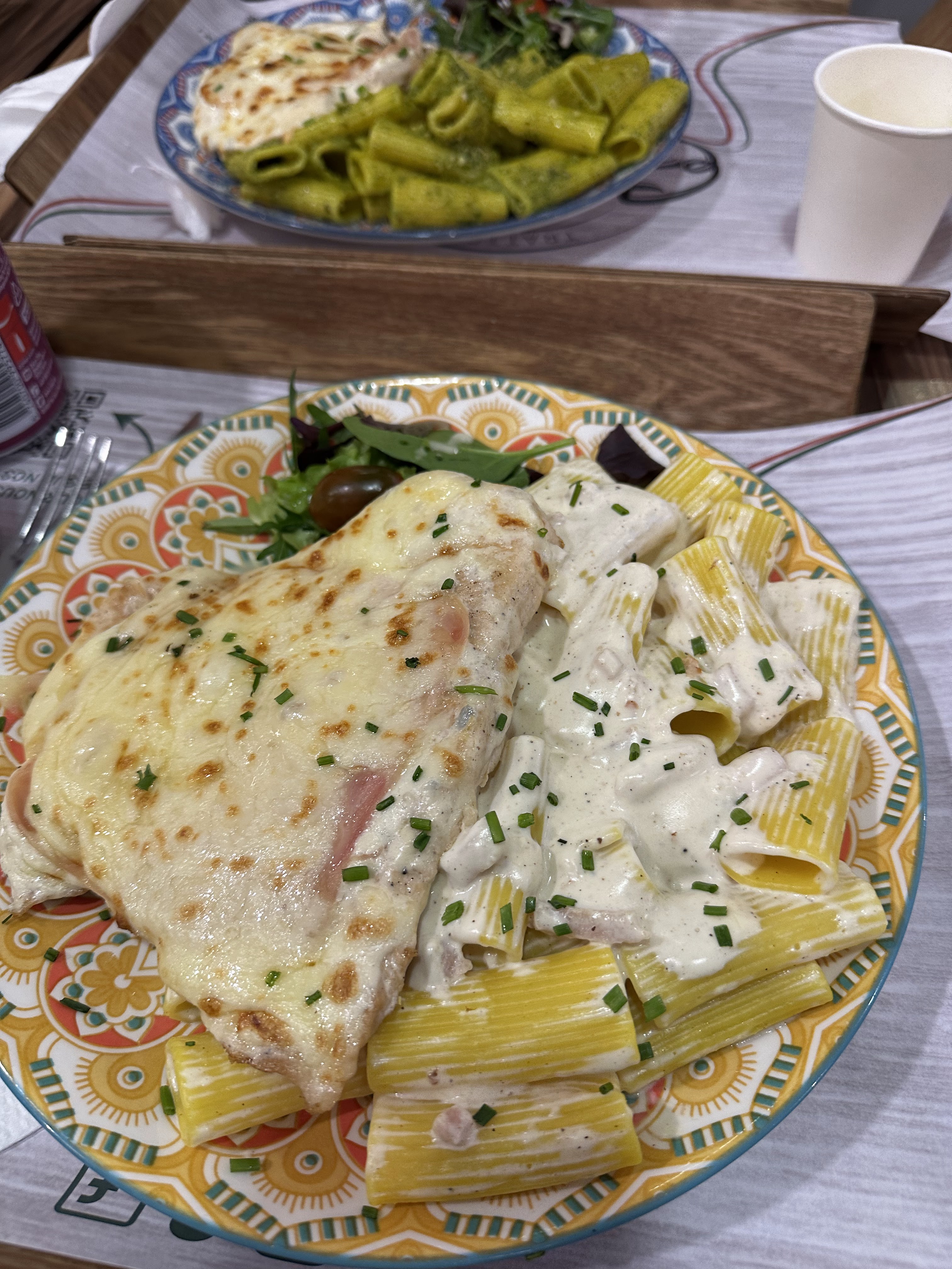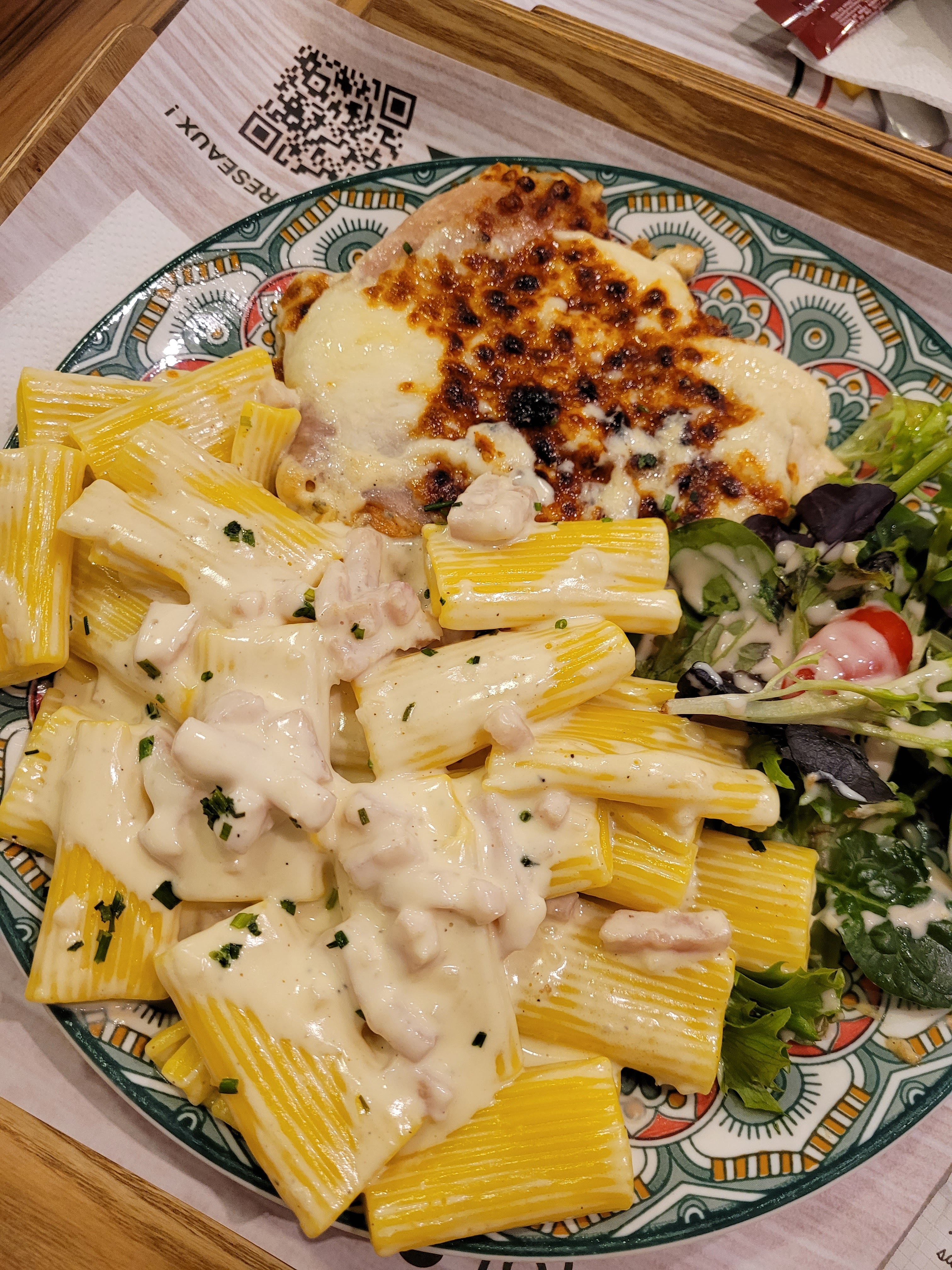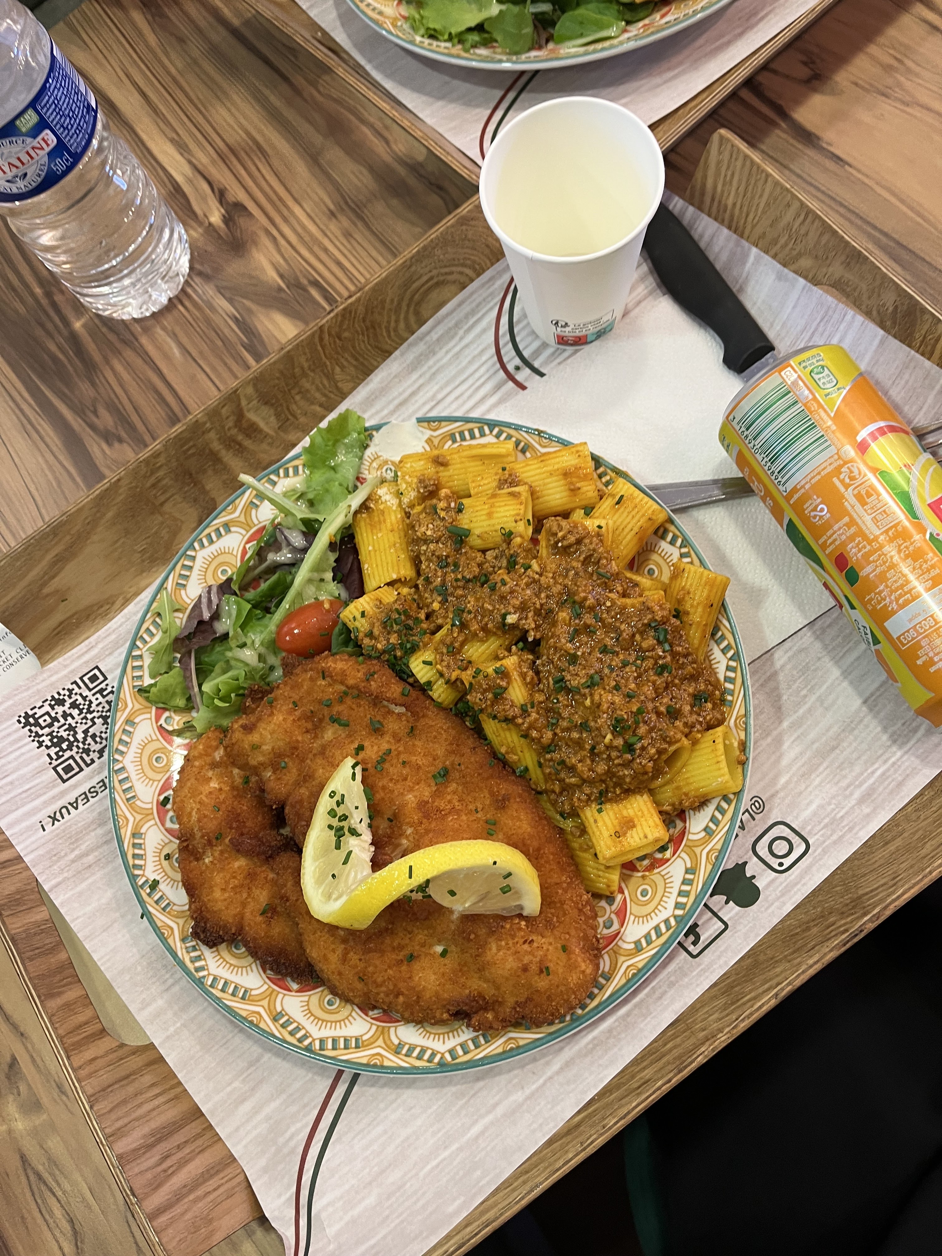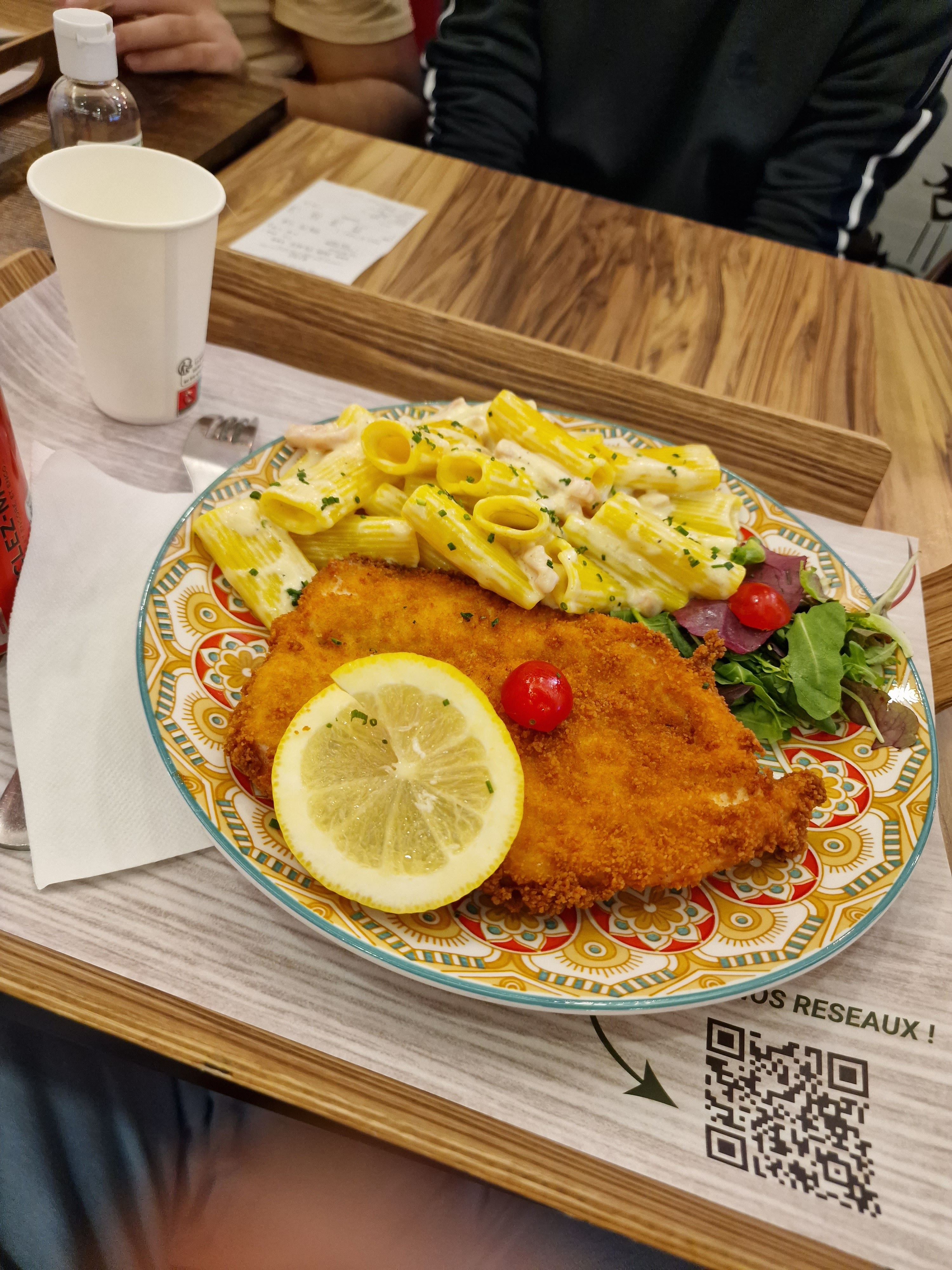 J’ai vu ce restaurant que je ne connaissais pas et j’y suis allée sans m’attendre à quelque chose de fou. Commande sur les bornes, écran d’affichage avec les menus, bcp de choix porter sur des plats italiens. Déco très chic, moderne et agréable. J’ai pris une escalope milanaise avec des rigatoni carbonara. J’ai hésité avec les pizza qui ont l’air incroyable également Je reçois ma commande et visuellement c’est simple et beau, ça donne envie de tout dévoré. Résultat : agréablement surpris. Plat copieux et de bonne qualité, je me suis régalé ! Je recommande