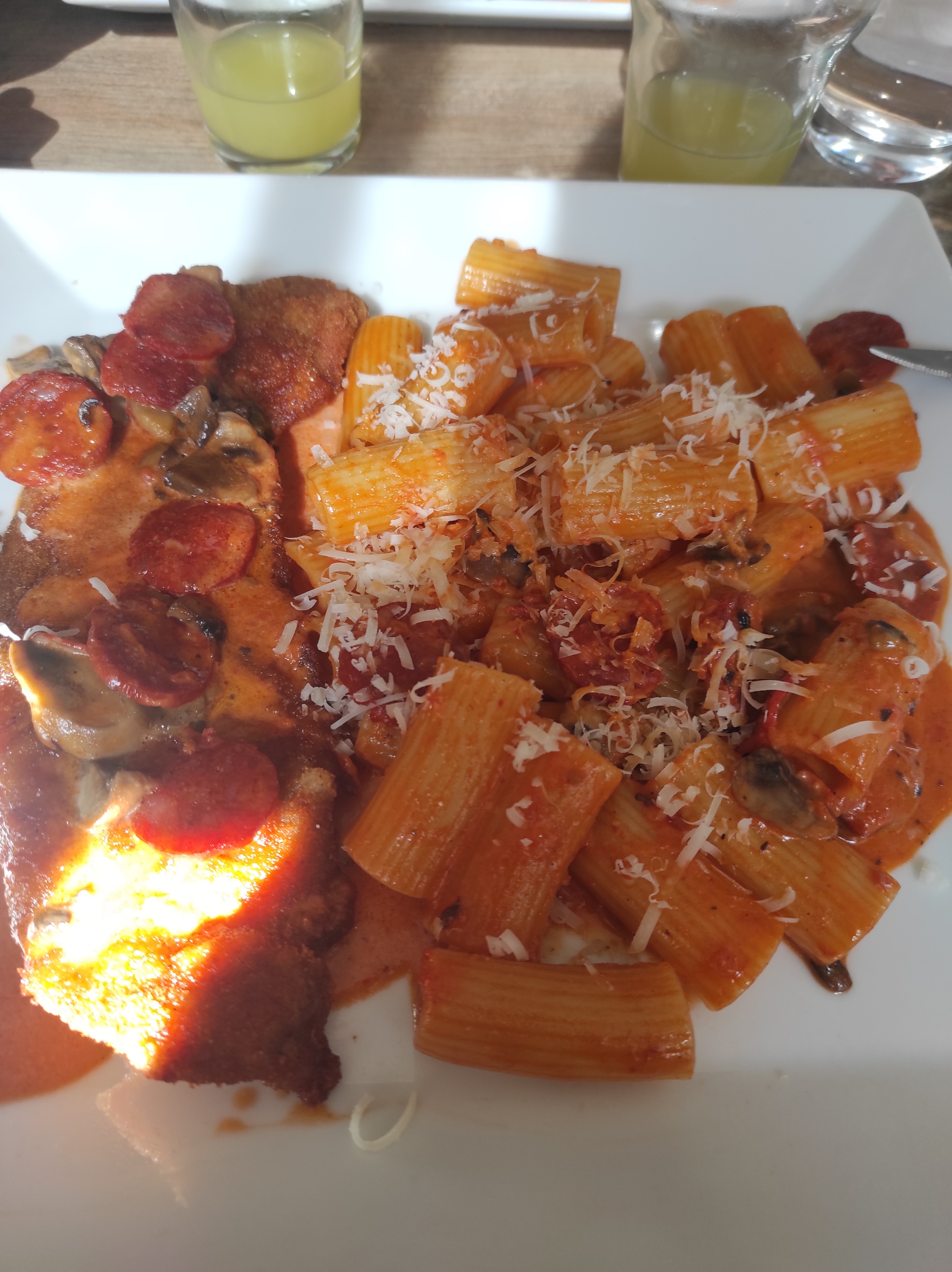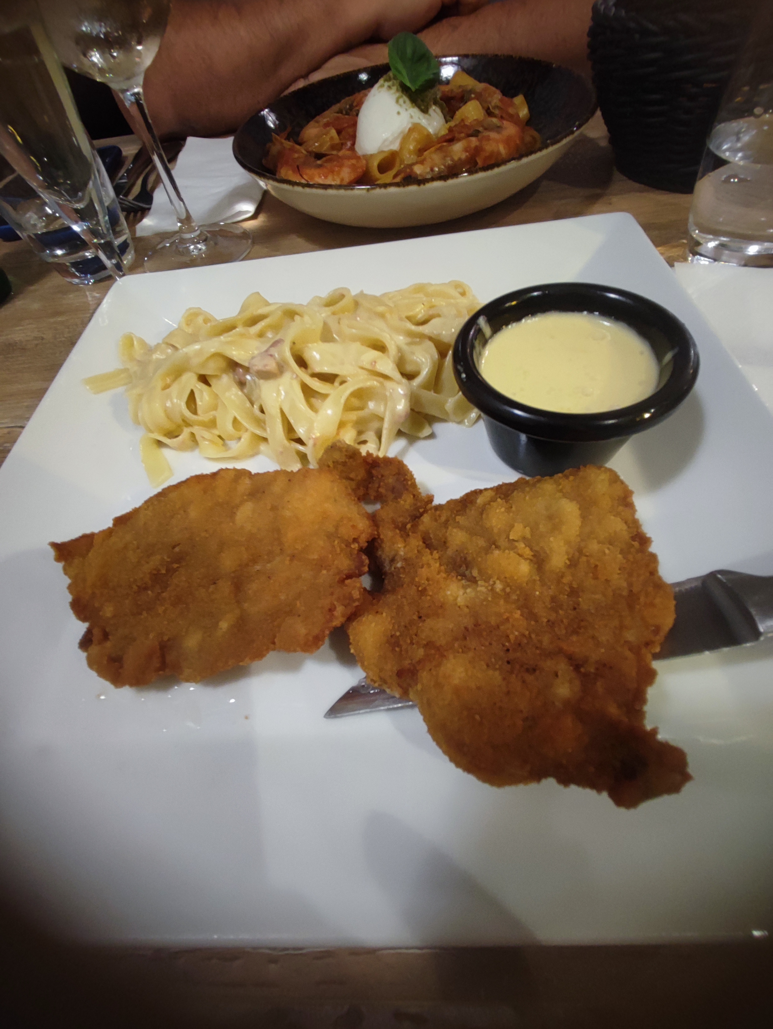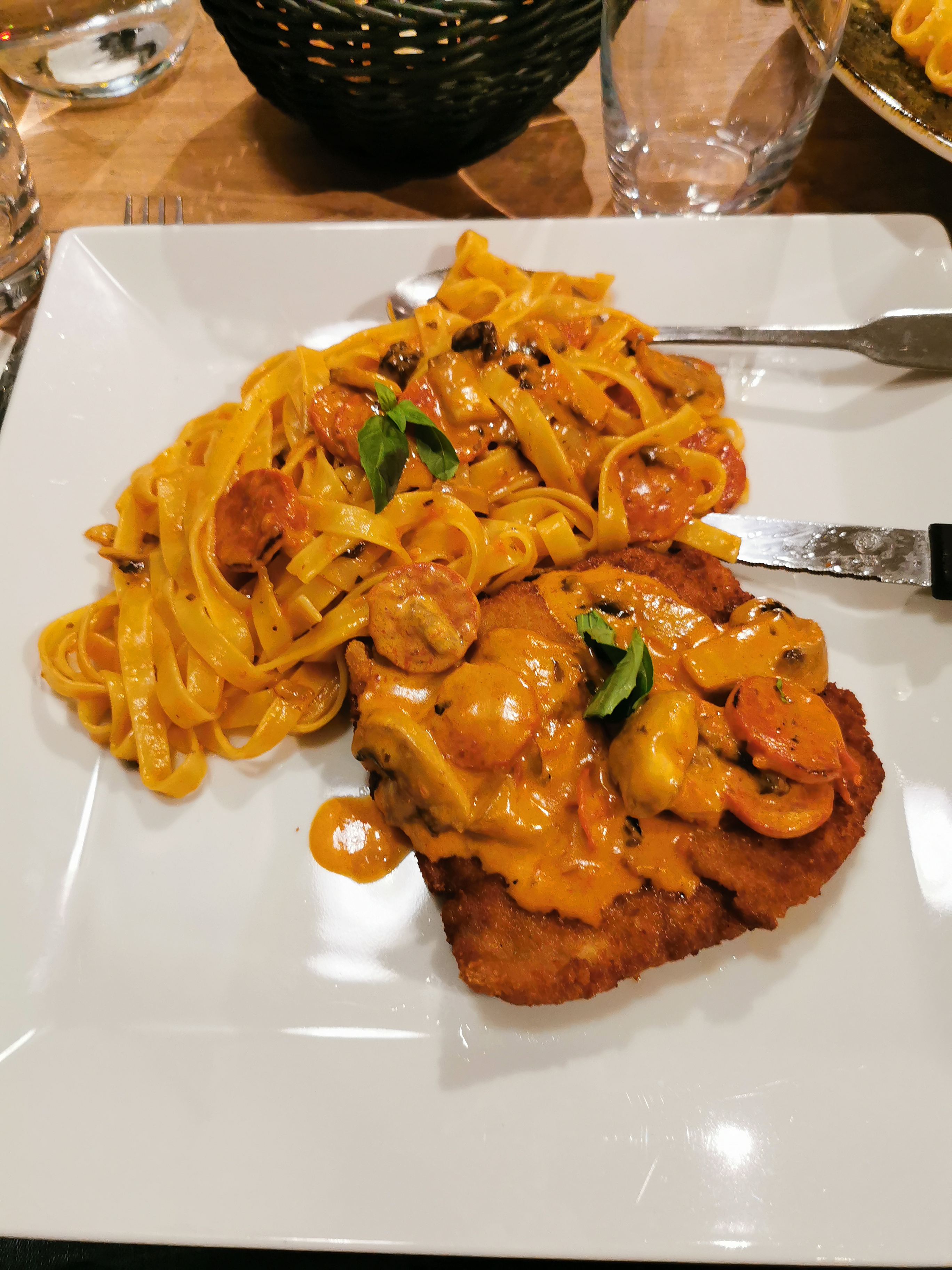 La nourriture était bonne, mais nous avons dû attendre 1h30 pour que nos plats principaux arrivent (nous avons eu de la bruschetta en entrée qui a également mis 45 minutes à arriver). L'une des escalopes nageait dans la sauce, tandis que l'autre (exactement le même plat) avait très peu de sauce, bizarre. Le serveur n'était pas vraiment accueillant. Nous avons également commandé des tagliatelles mais reçu des spaghettis.