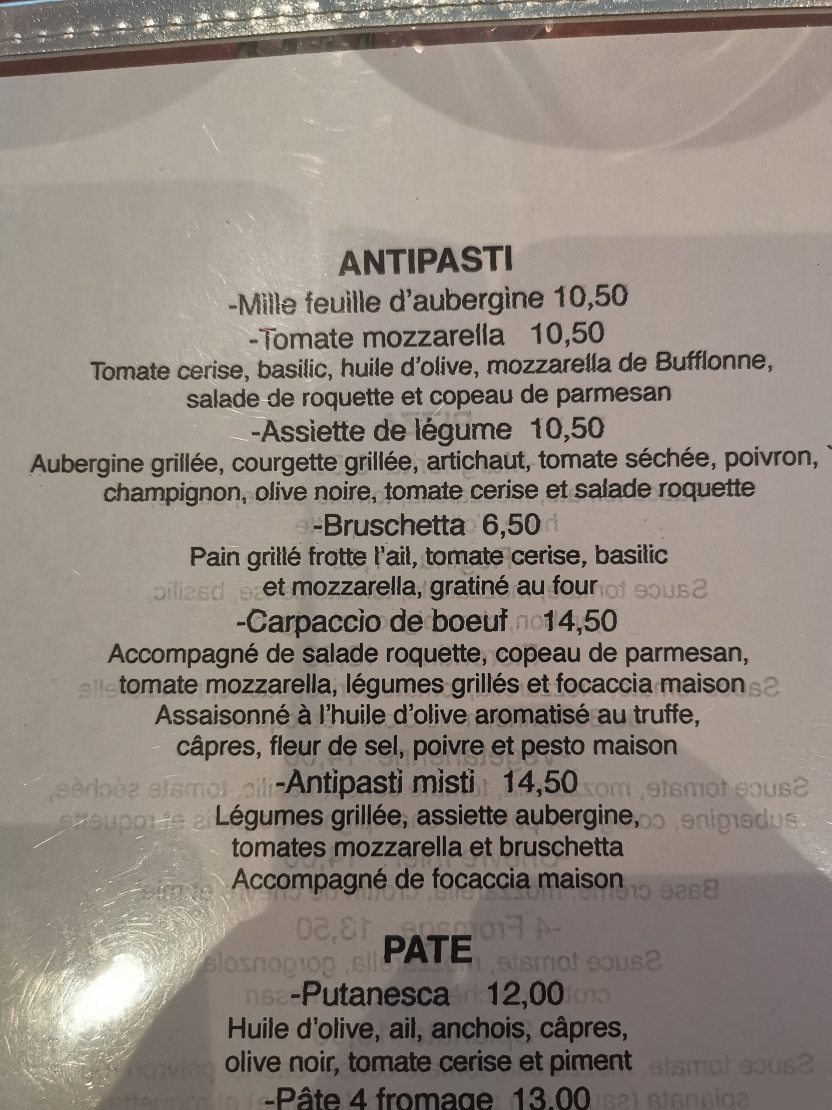 Nous n'avions pas mangé car au bout de quasiment 25 min personne n'est venu prendre notre commande. De plus les distances de sécurité pas respectées (voisin était collé à nous littéralement),la table était dégoûtante... Finalement ça ne donnait pas envie et quand je voyais aussi les plats de pâtes....tant mieux si l'on peut dire
