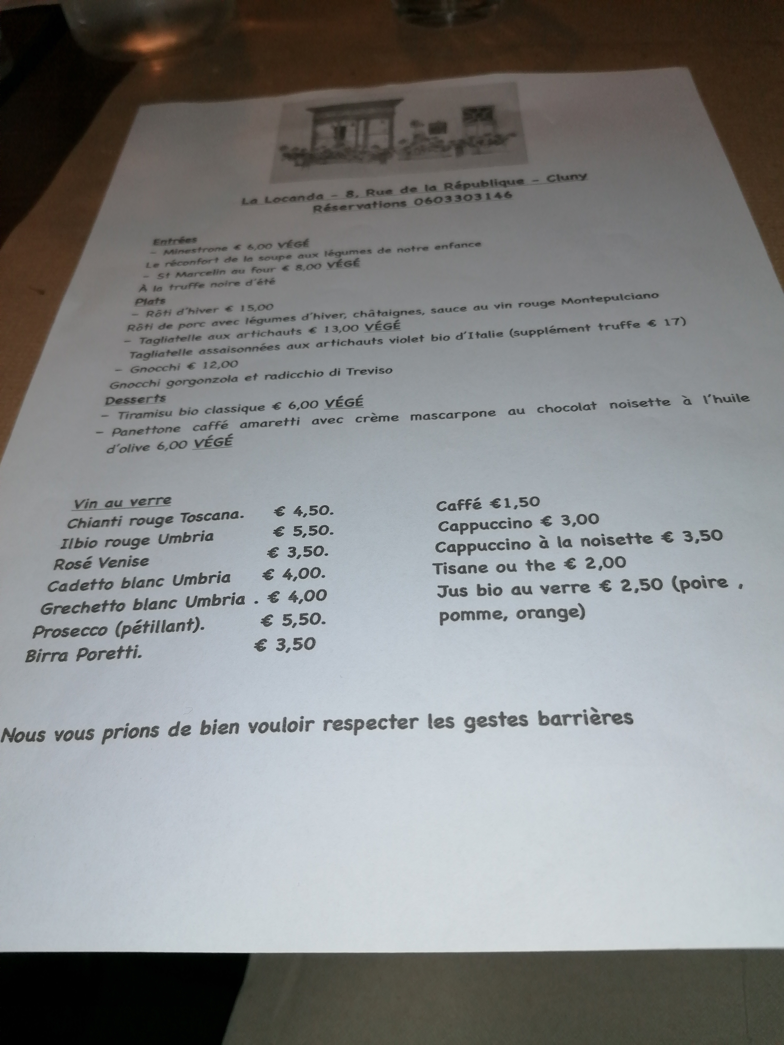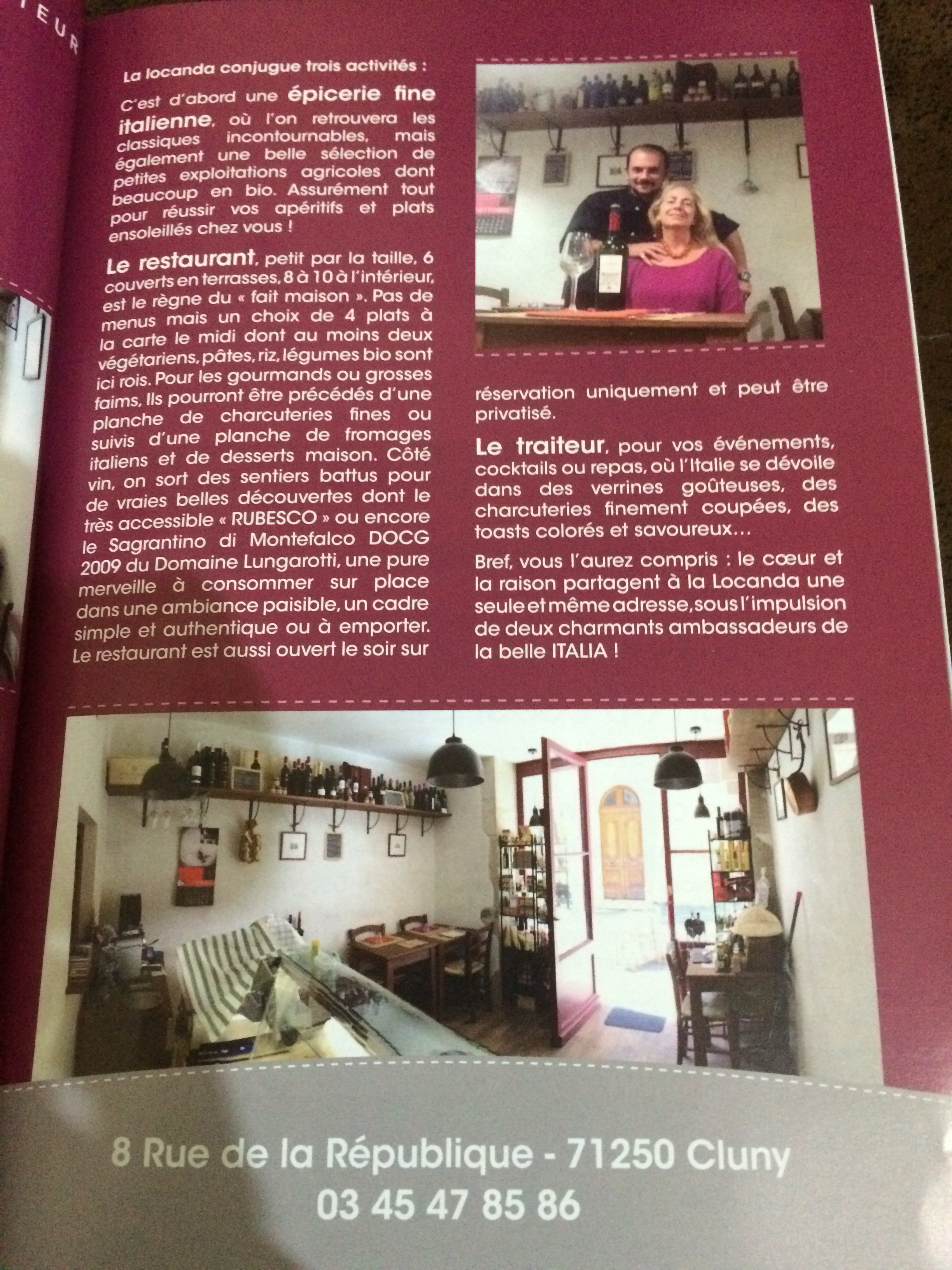La locanda est un restaurant (très) intimiste. Un petit bout d'Italie au cœur de Cluny. Ne cherchez pas de pizzas, ce sont là des plats italiens traditionnels cuisinés sur place comme il se doit. Pas de chihis, la cuisine est familiale. Cet esprit se retrouve dans l'initimité du lieu (5 tables seulement). Pensez donc à réserver 2 à 3 jours à l'avance.