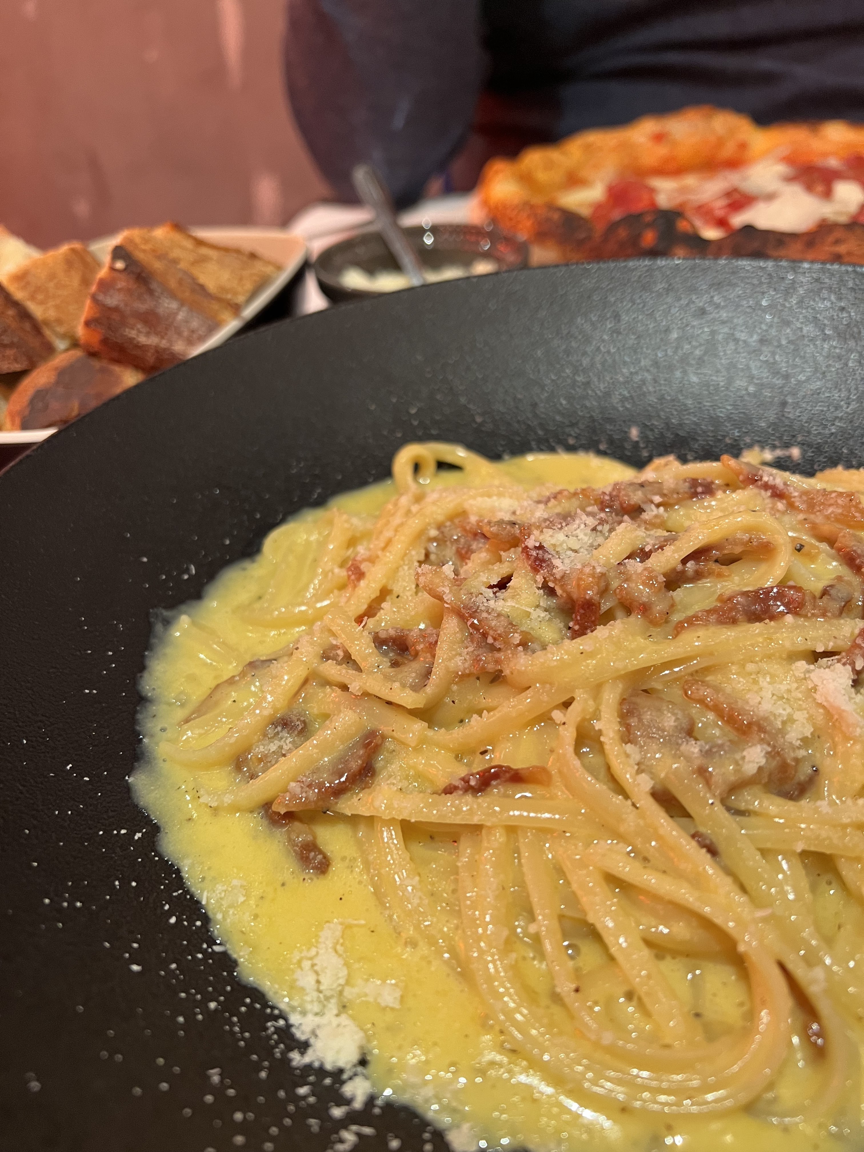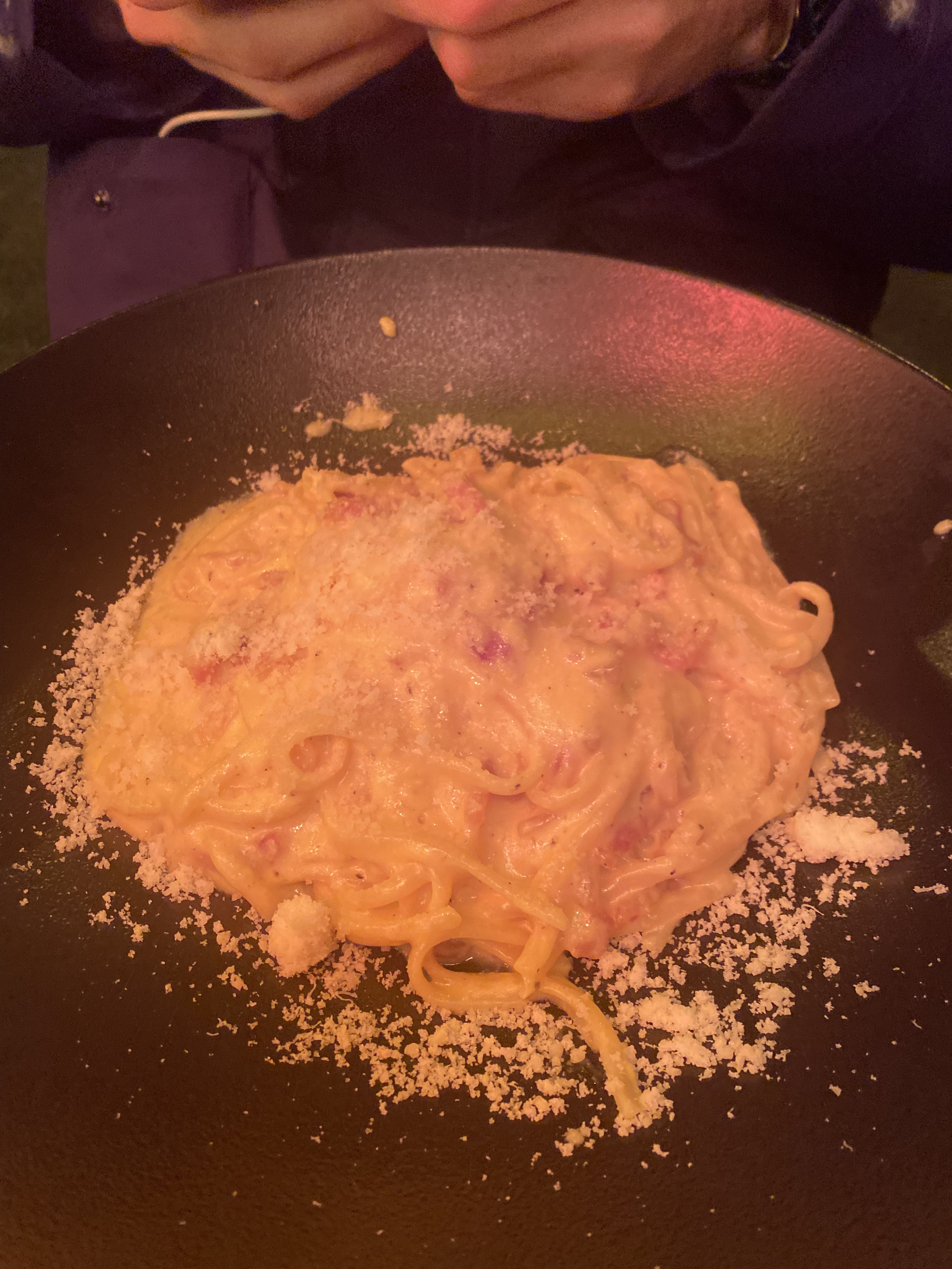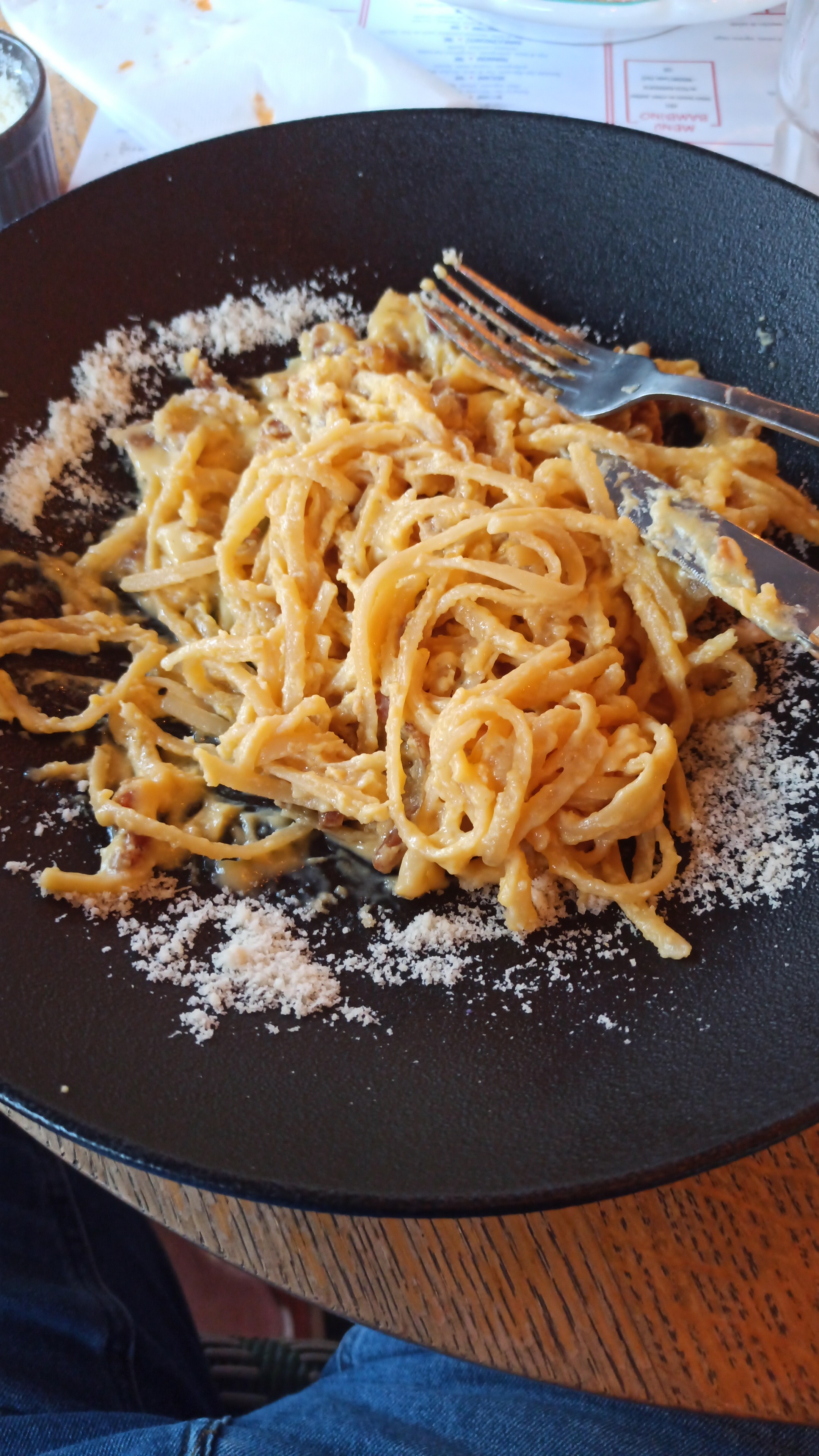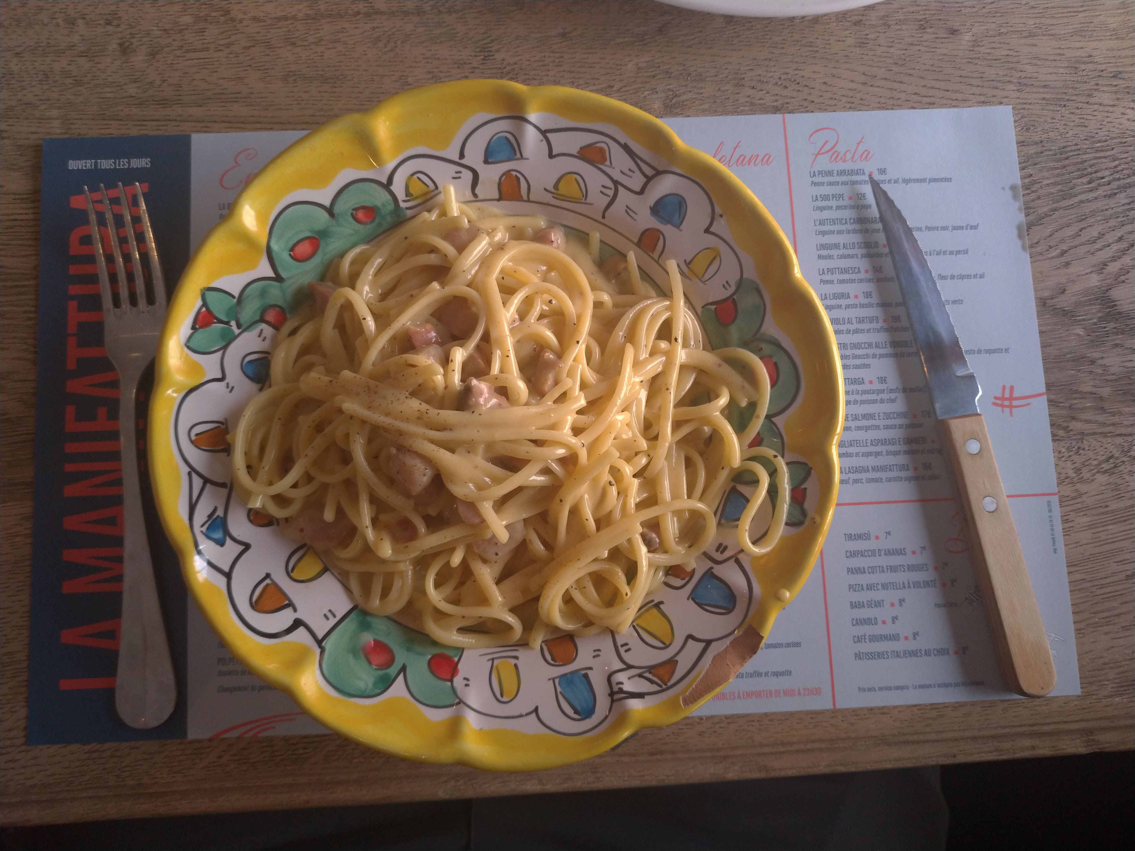 Les meilleures pâtes carbonara que je n’ai jamais goûté ! Seule ombre au tableau les pensées à voix hautes d’une membre de l’équipe lors de l’arrivée de notre groupe : « oh la la tout ça » ça n’est pas une réaction professionnelle. Je mets 5 étoiles, car c’est la 1ère fois que j’y étais, durant le repas le service était top, et je mets la réaction à haute voix sur le coup du creux estivale et de la jeunesse. Je recommande à 100%