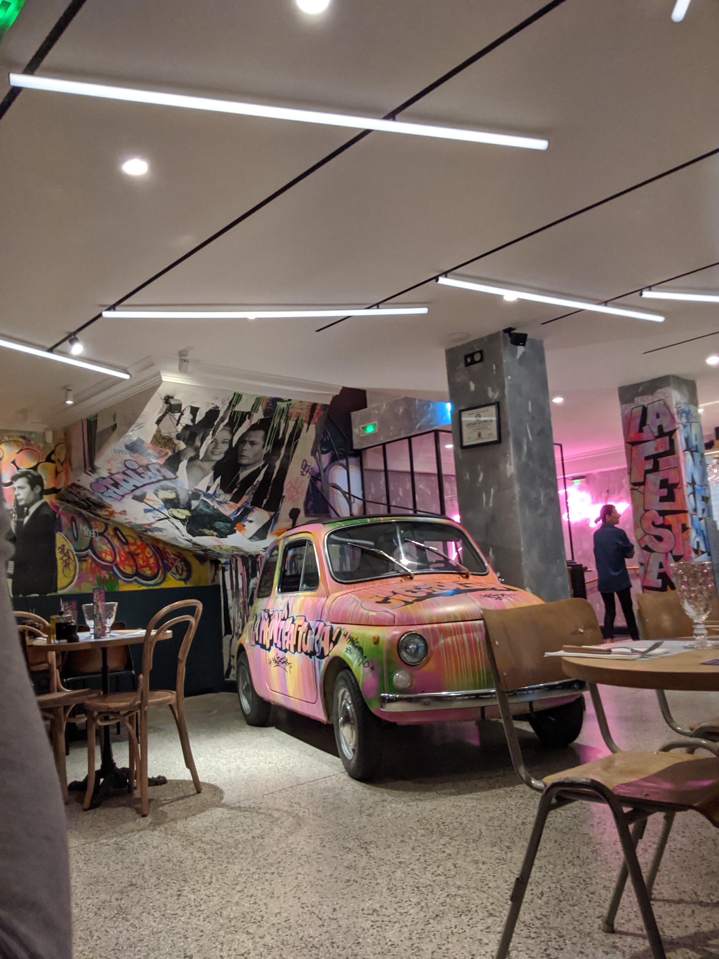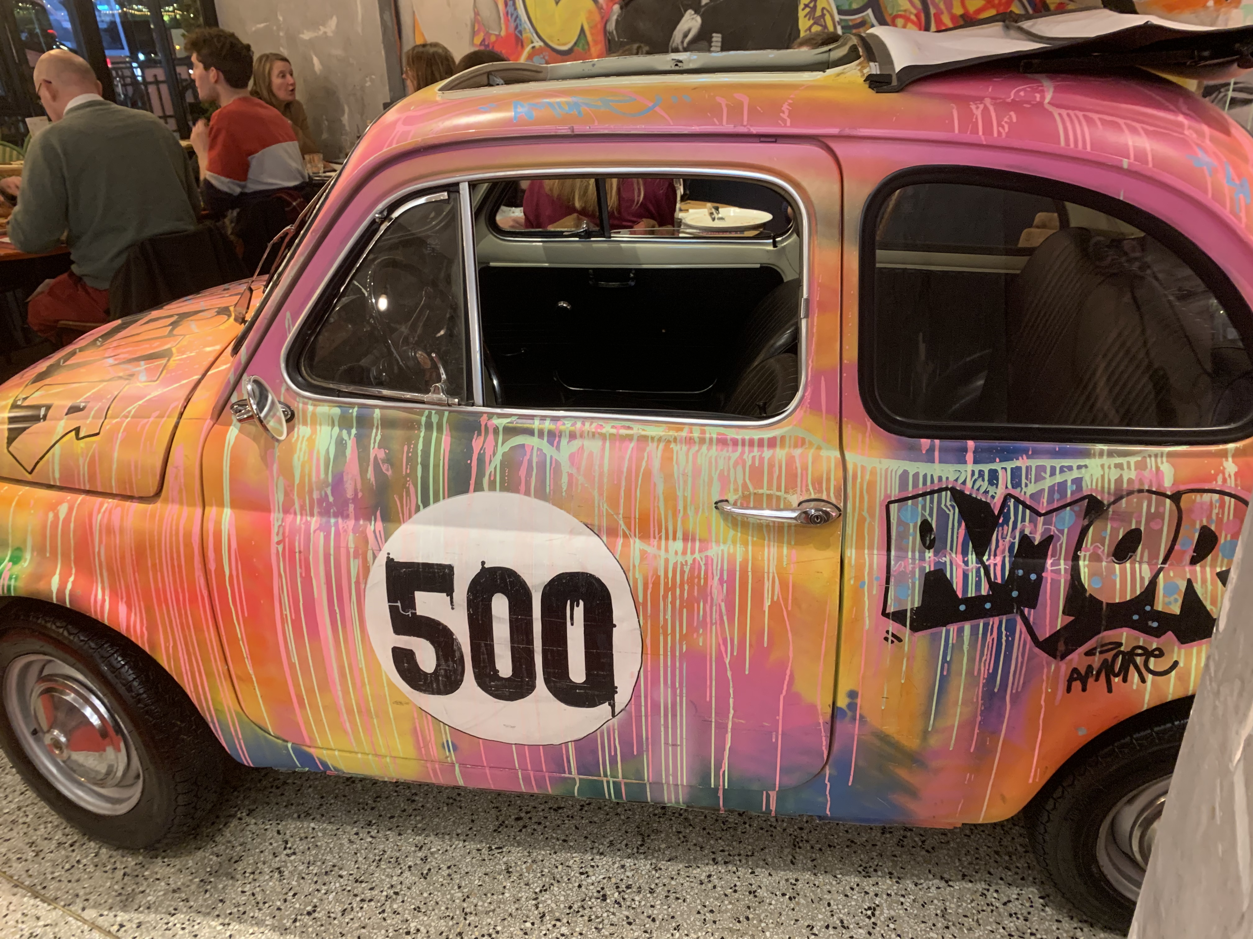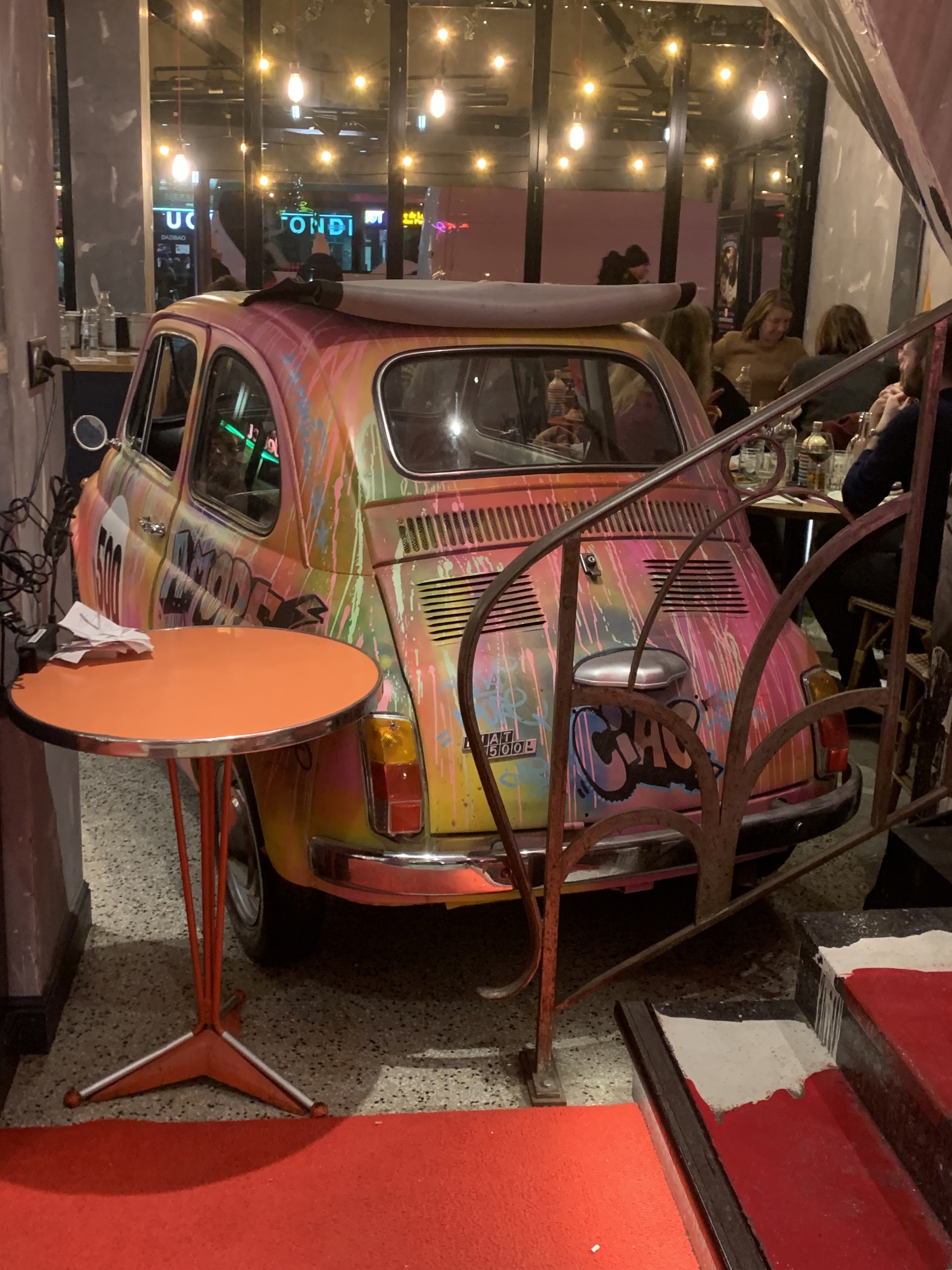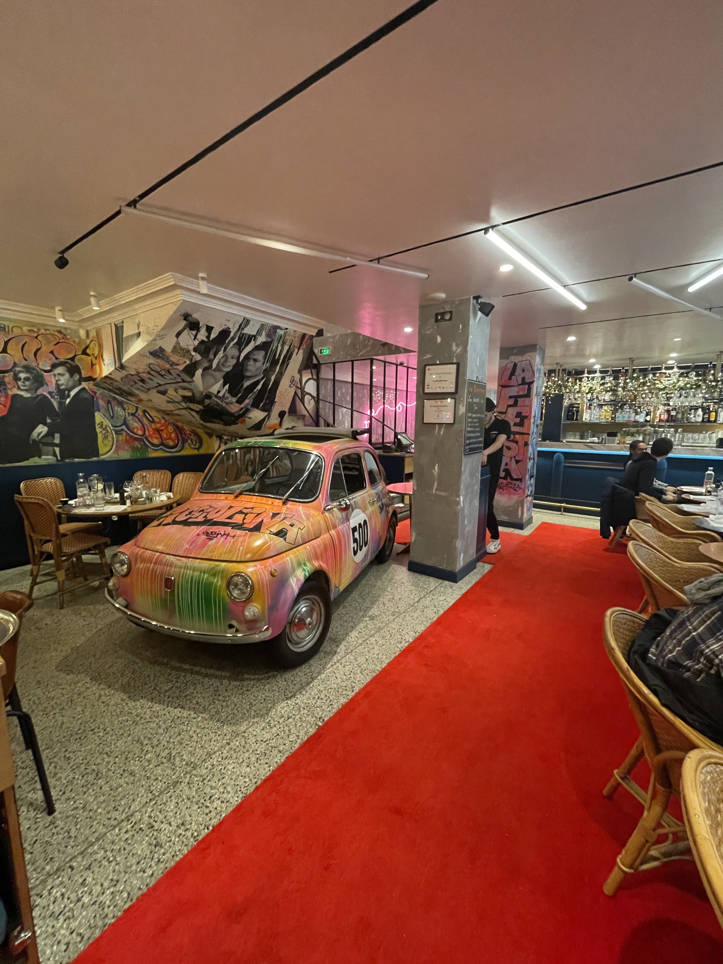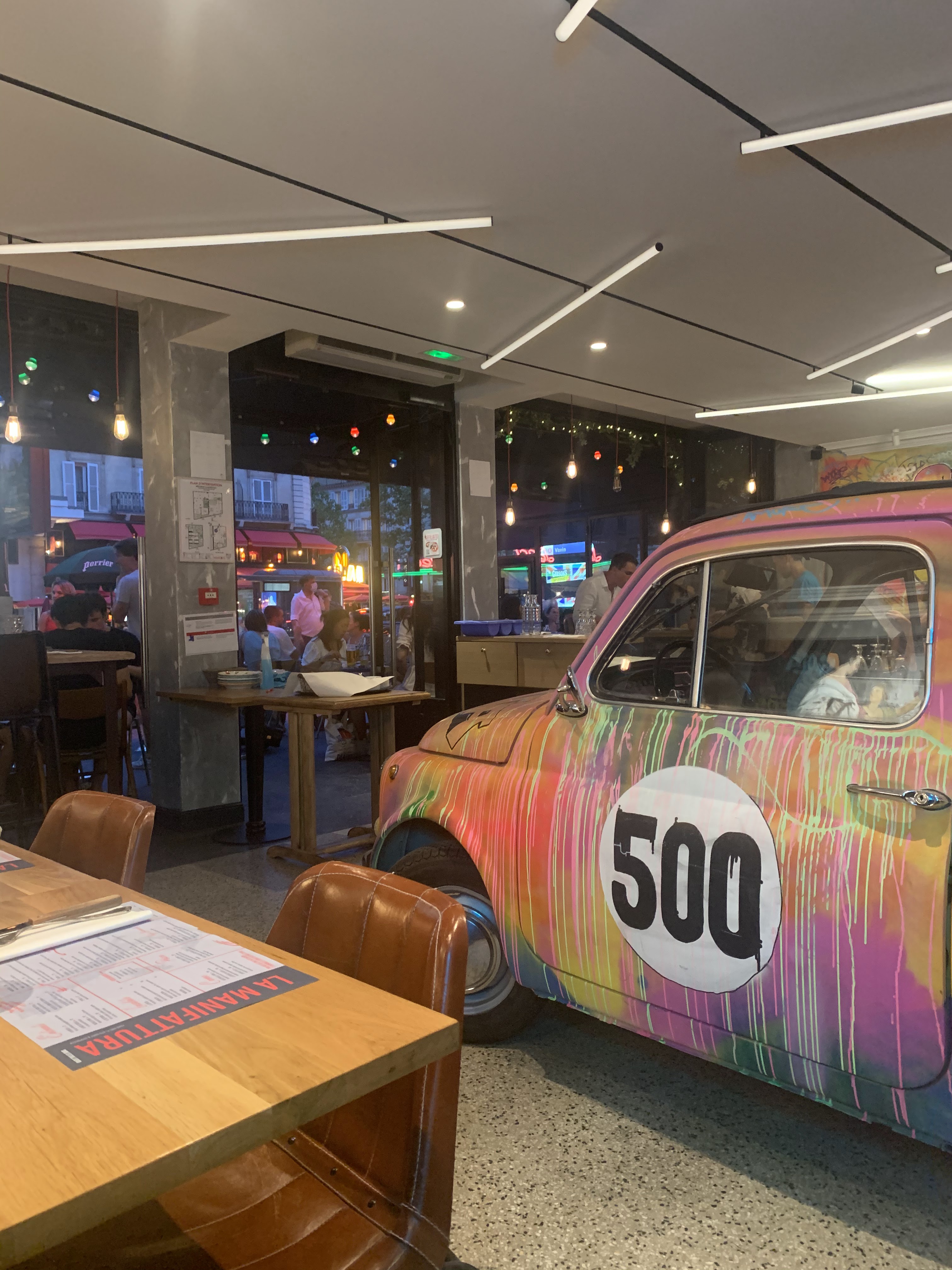 Côté repas : Pizza 4 fromages bien garnie avec une pâtes fines et pas trop cuite. Meilleure pizza de Paris, je ne sais pas mais elle était bonne. Le Tiramisu était de bonne qualité également. L'étoile en moins vient du service qui est par contre à améliorer : On a demandé 3 fois une caraffe d'eau qu'on a jamais eu, les cocktails, plutôt bons d'ailleurs, sont arrivés après la pizza et pas de chance, le paiement par carte ne fonctionnait pas quand on a voulu payer, on a dû aller faire un retrait pour payer en liquide. Victime de leur titre de meilleure pizza de Paris, ils ont du monde et ils ne sont sans doute pas assez nombreux ou mal organisés mais la qualité de la pizza mérité quand même le détour. Côté prix, un peu élevé pour les pizzas mais elles sont aussi mieux garnies donc ça vaut les 15€ la pizza 4 fromages ( la plus chères avec des truffes est à 24€), 8€ le tiramisu et autour de 10€ pour le cocktail fiat 500.