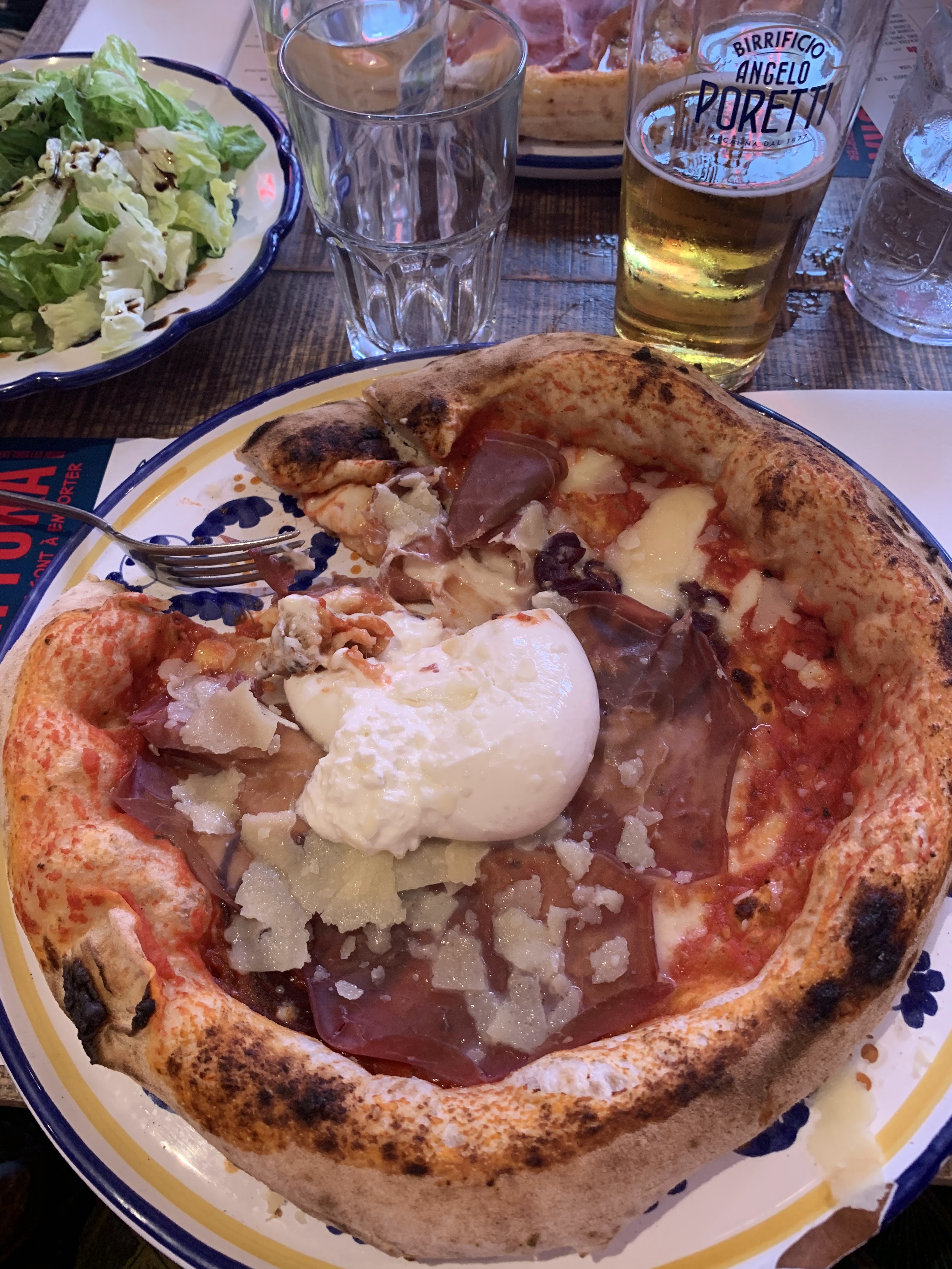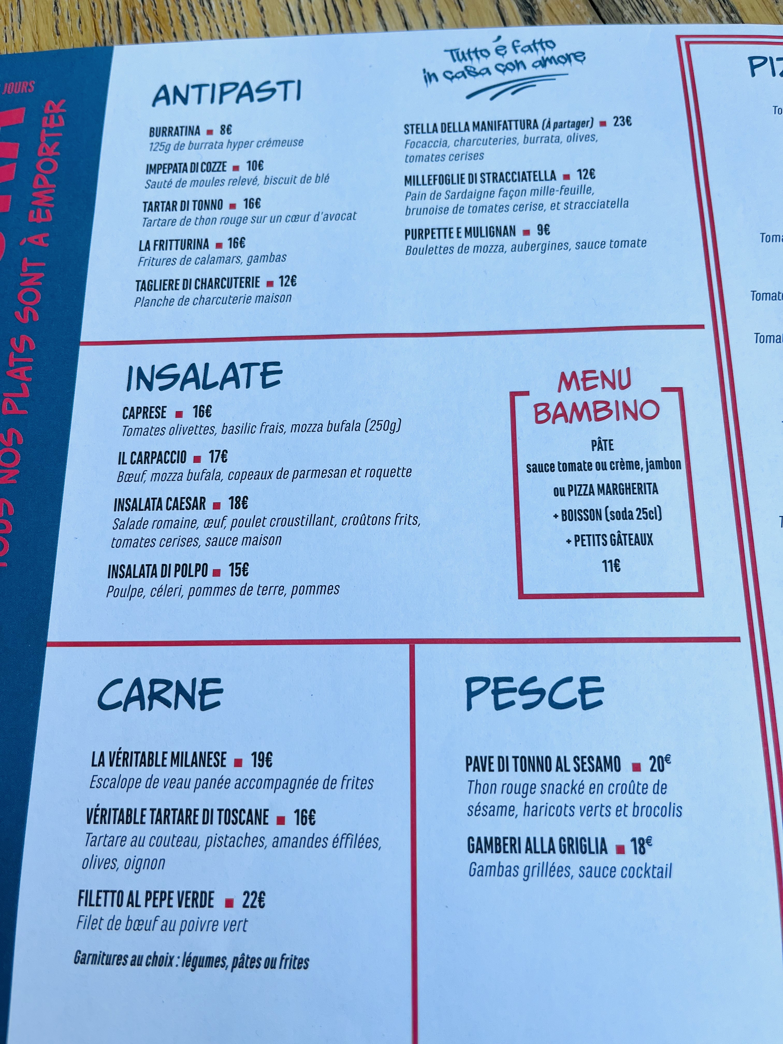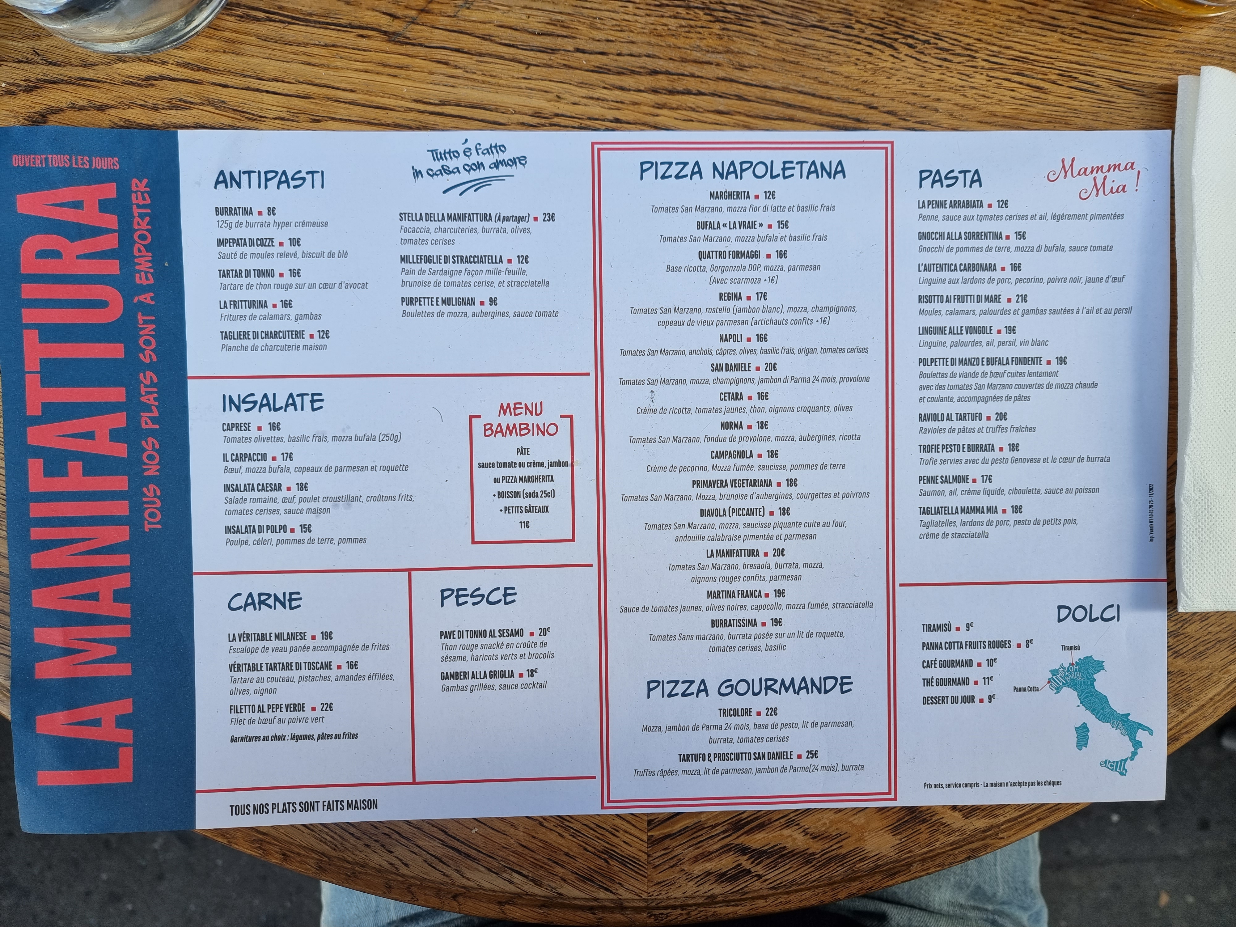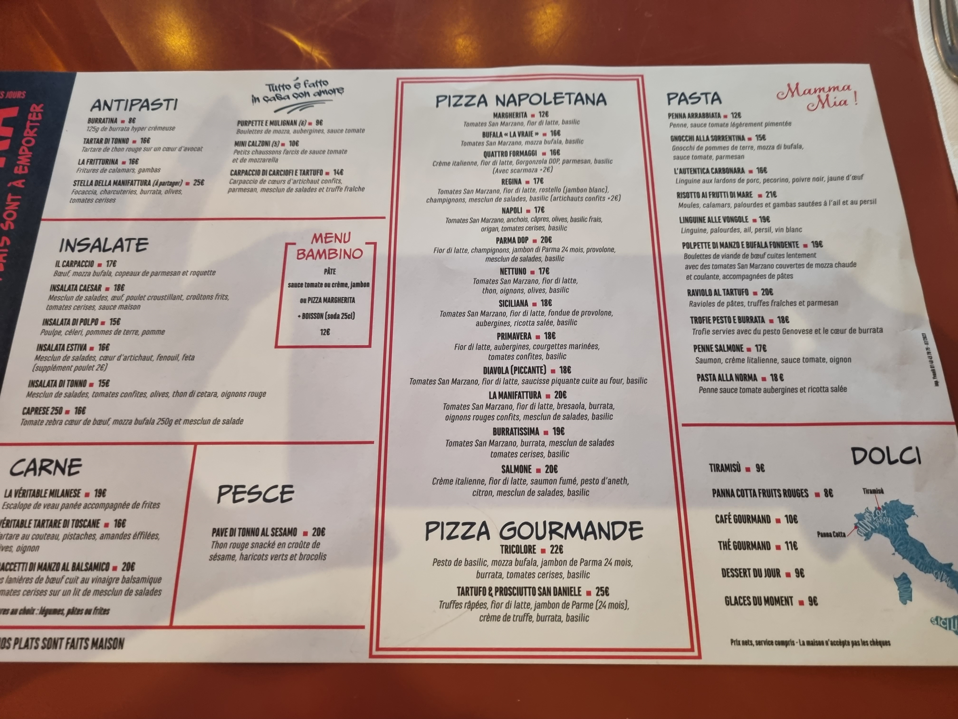 Une belle carte. Les pizzas sont généreuses et très bonnes. La déco est vraiment super sympa, un peu rétro. Très bon desserts également. Seul bémol, la bière pression « manifattura » n’avait rien de spécial ; qui plus est à 10 euros la pinte…