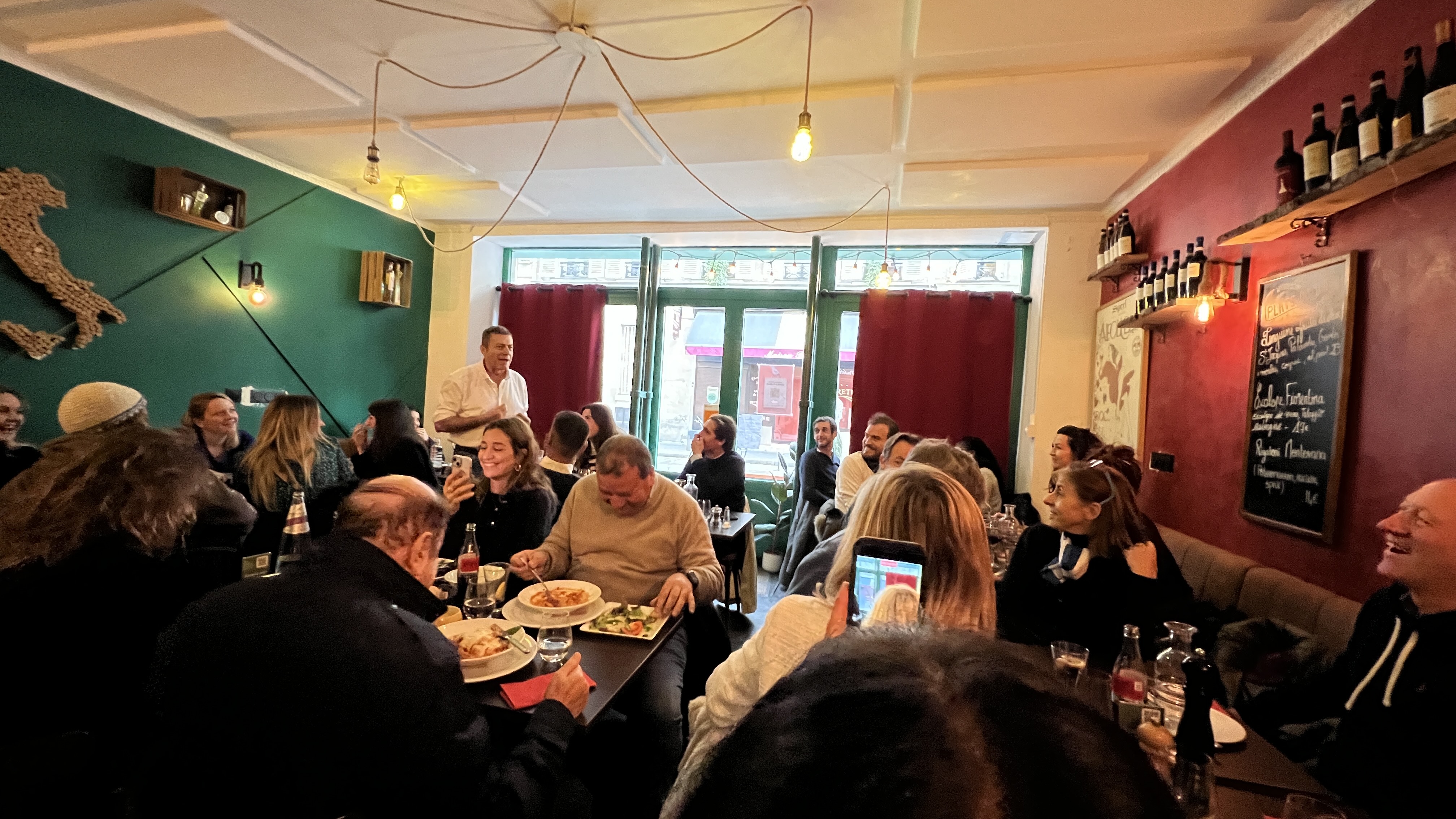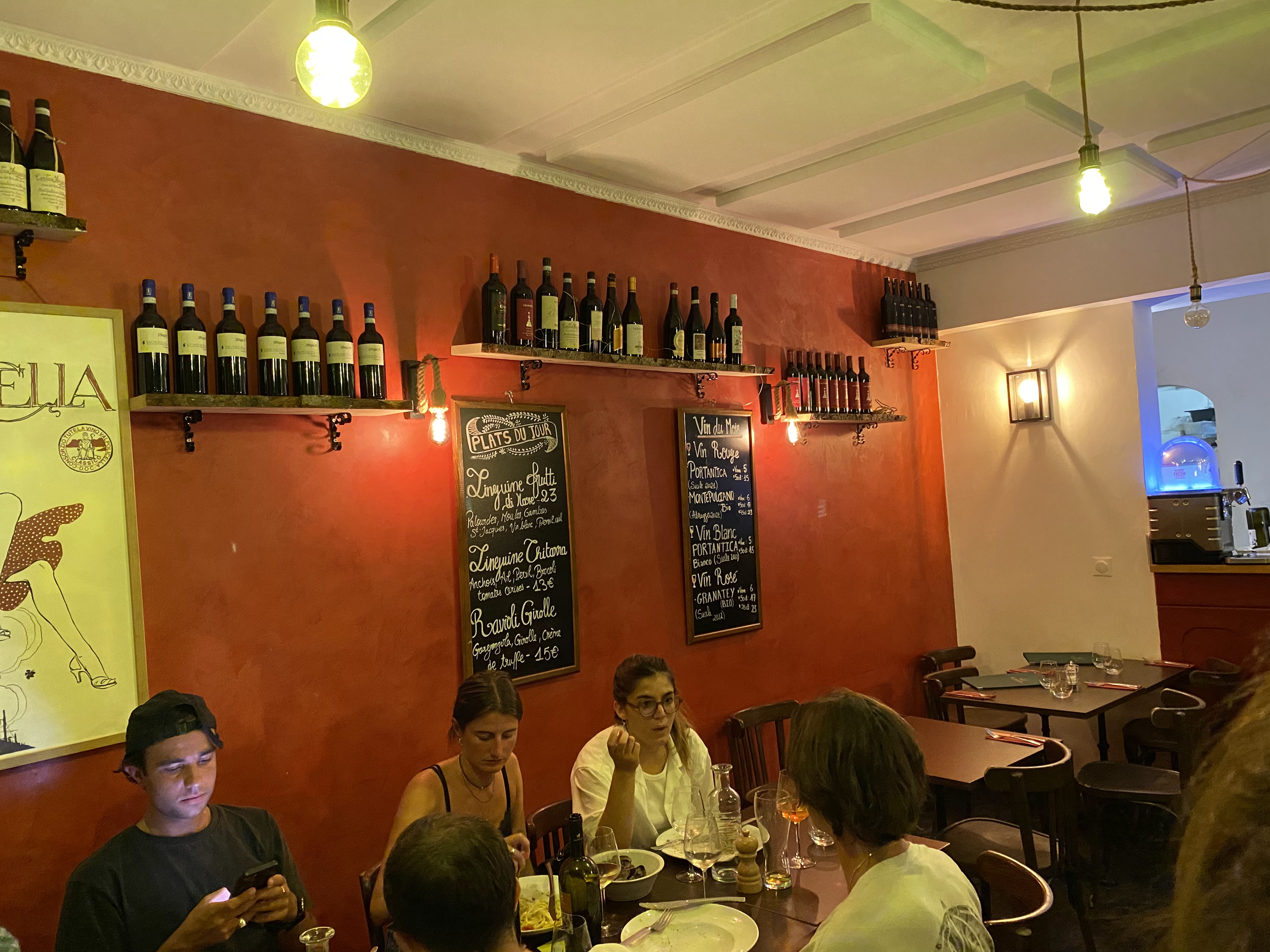 La cuisine est excellente, ils ont une carte de vin cohérente et intéressante. Nous avons été servis rapidement, et les plats sont copieux. Seul bémol, mon amie assise à ma droite s'est vu gratifié de quelques gouttes de vins sur ces vêtements lors du service de celui ci. L'ambiance est intéressante, il est clair que si vous souhaitez dîné dans le calme en toute intimité cela n'est pas adapté. Ici vous êtes plutôt dans un lieu plein de vie et très italien, ça parle fort, et ça chante fort également. Cependant ce lieu est sympathique et le patron a le mérite de proposer quelque chose de différent qui mérite d'être salué.