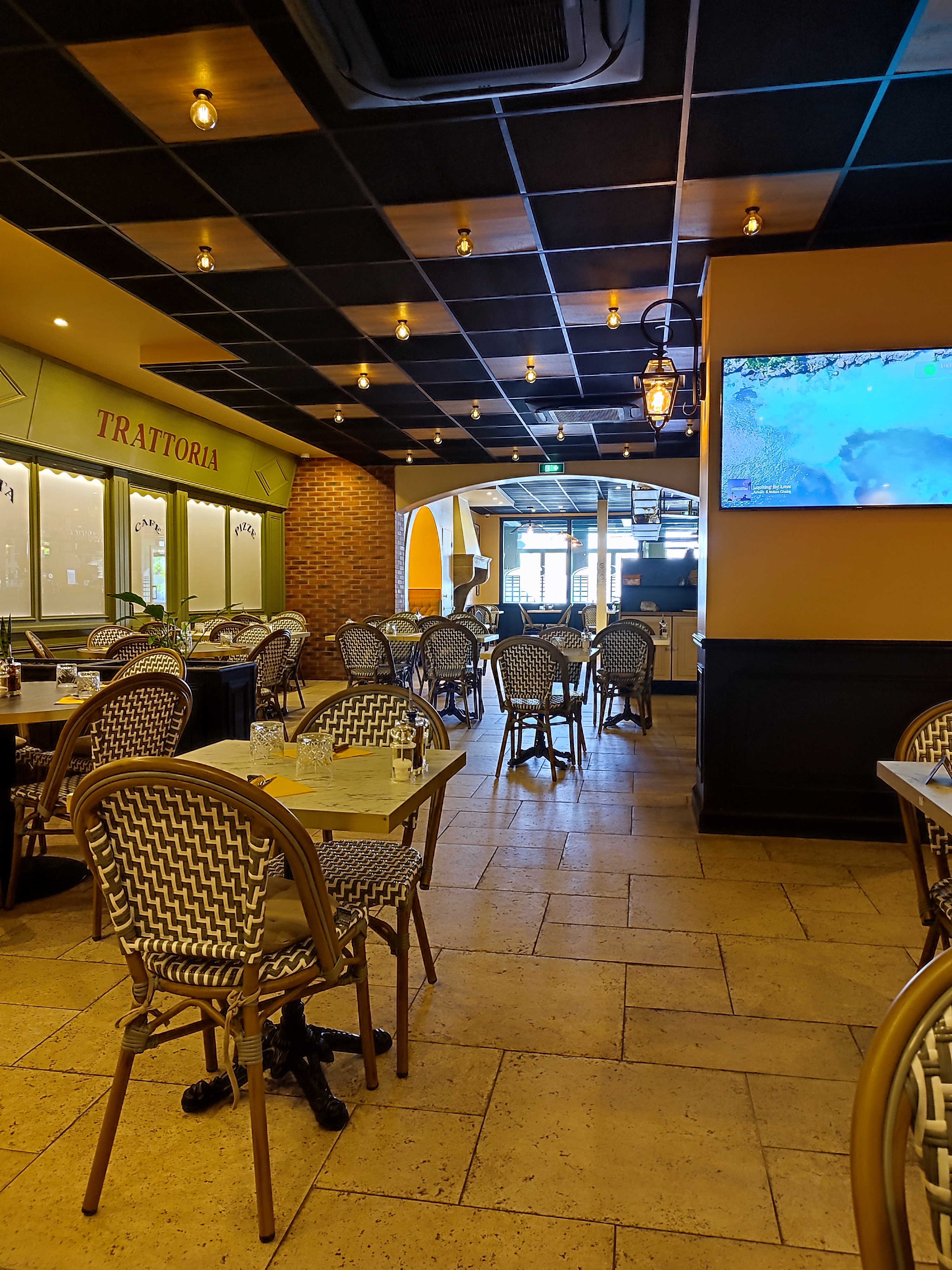 L’accueil est chaleureux. Le cadre est agréable rappelant une rue avec des enseignes. Mais on déchante assez vite. Tout d’abord l’assiette de charcuterie et de fromages n’a pas le goût de charcuterie italienne. Le pain fourni avec est sec; sans doute coupé depuis un petit moment. L’eau en carafe sent la javel. Par contre les pizzas sont bonnes et bien garnies ; il faut le souligner; Passez le tiramisu qui n’est que du sucre et n’a pas d’intérêt ;