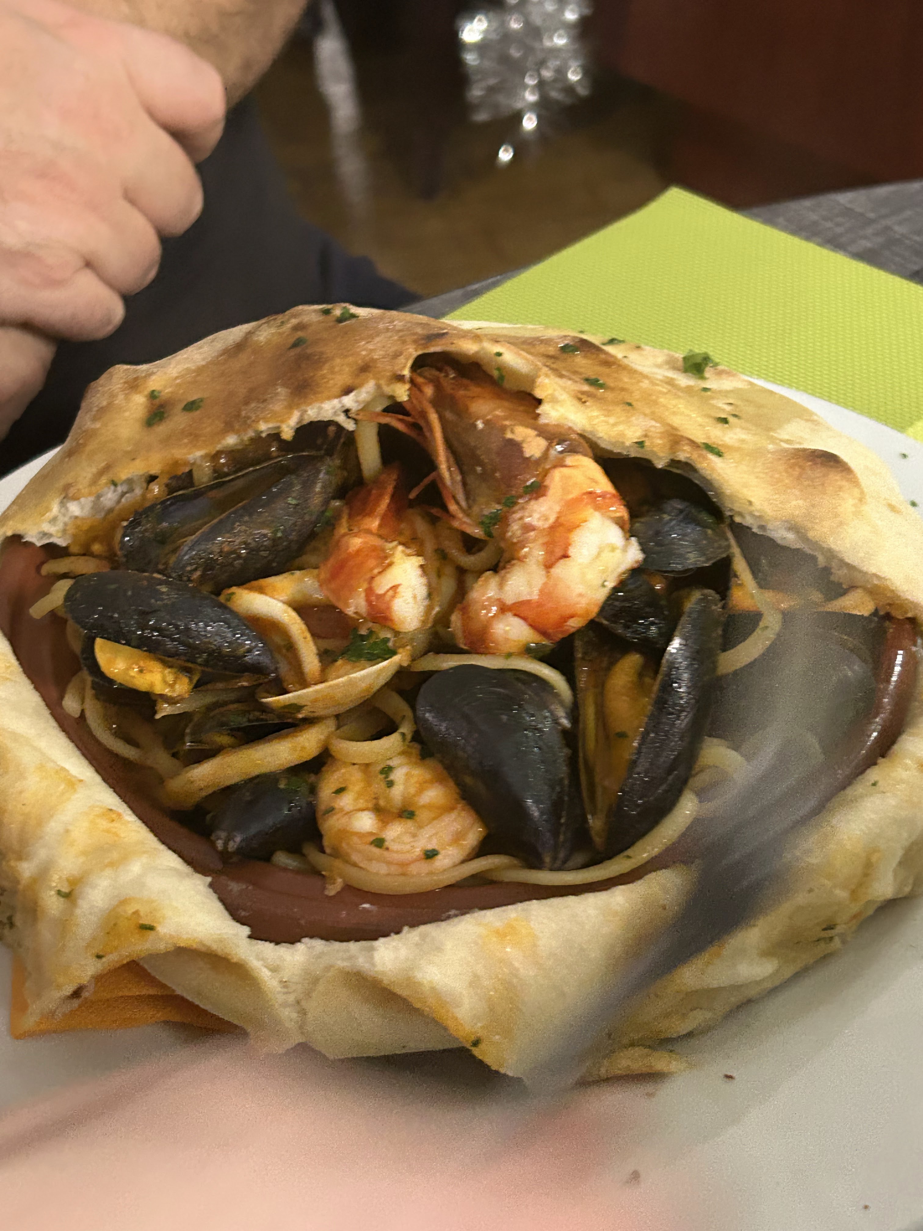 Super repas . Spaghetti au fruits de mer Avec sa pâte à pizza .un vrai régal . Félicitations .👍👍👍n
