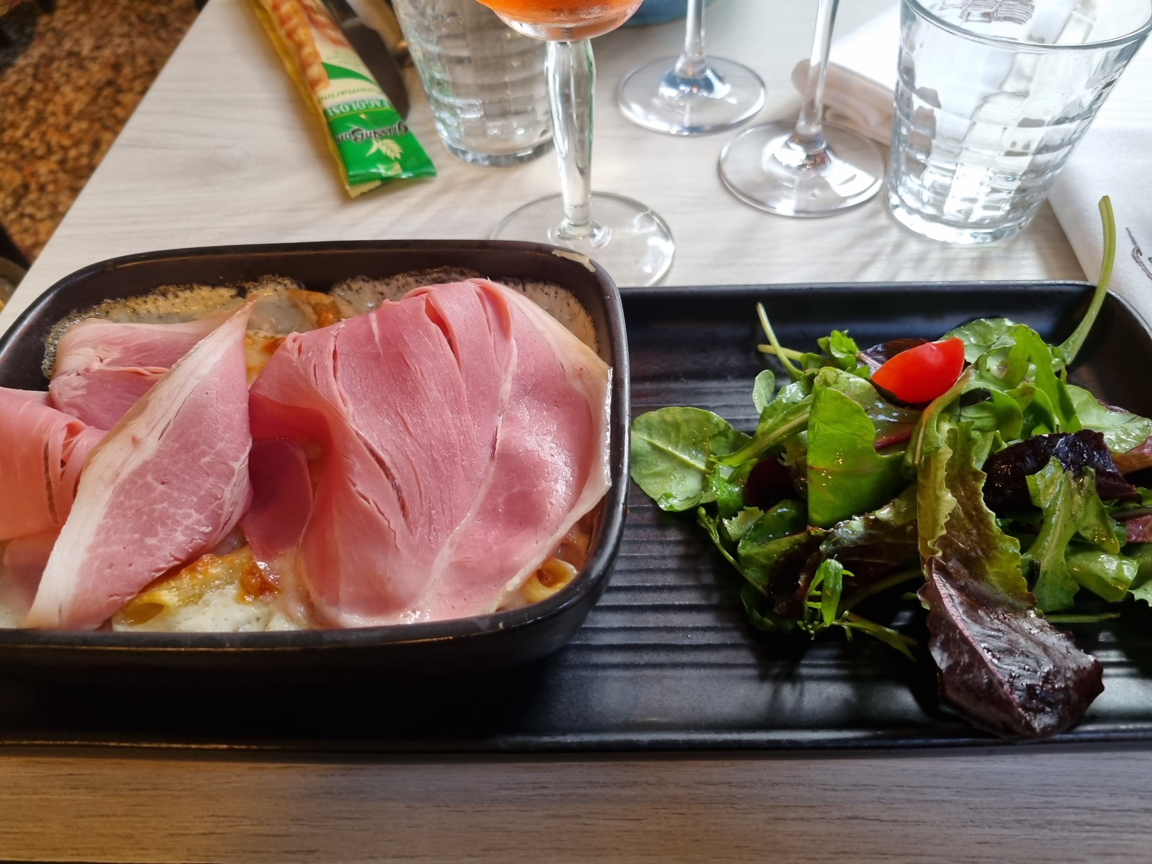 Déjeuner agréable dans ce restaurant. Nous avons pris des plats à la carte. L escalope de veau est très copieuse et ce plat était très bon. En revanche decue par le tagliata (bœuf tranché), bien moins copieux que le veau et la viande était trop cuite. Le tiramisu café est très bon. Bon service. Les tarifs à la carte sont assez chers je trouve.