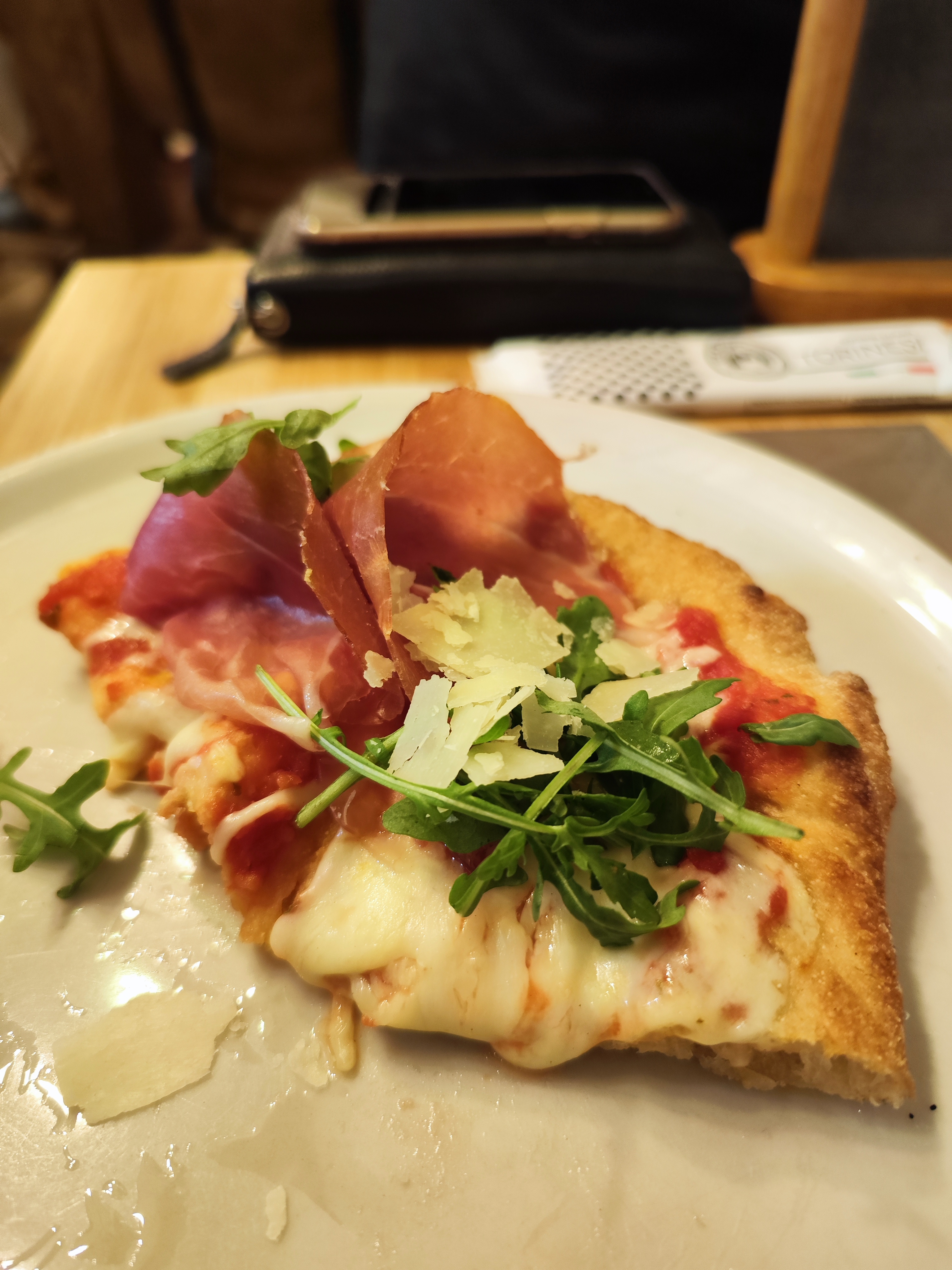 Super de dépenser de l'argent pour une pizza parma pour avec 3 copeaux de parmesan et une pâte brûlé et ultra dure. Immangeable