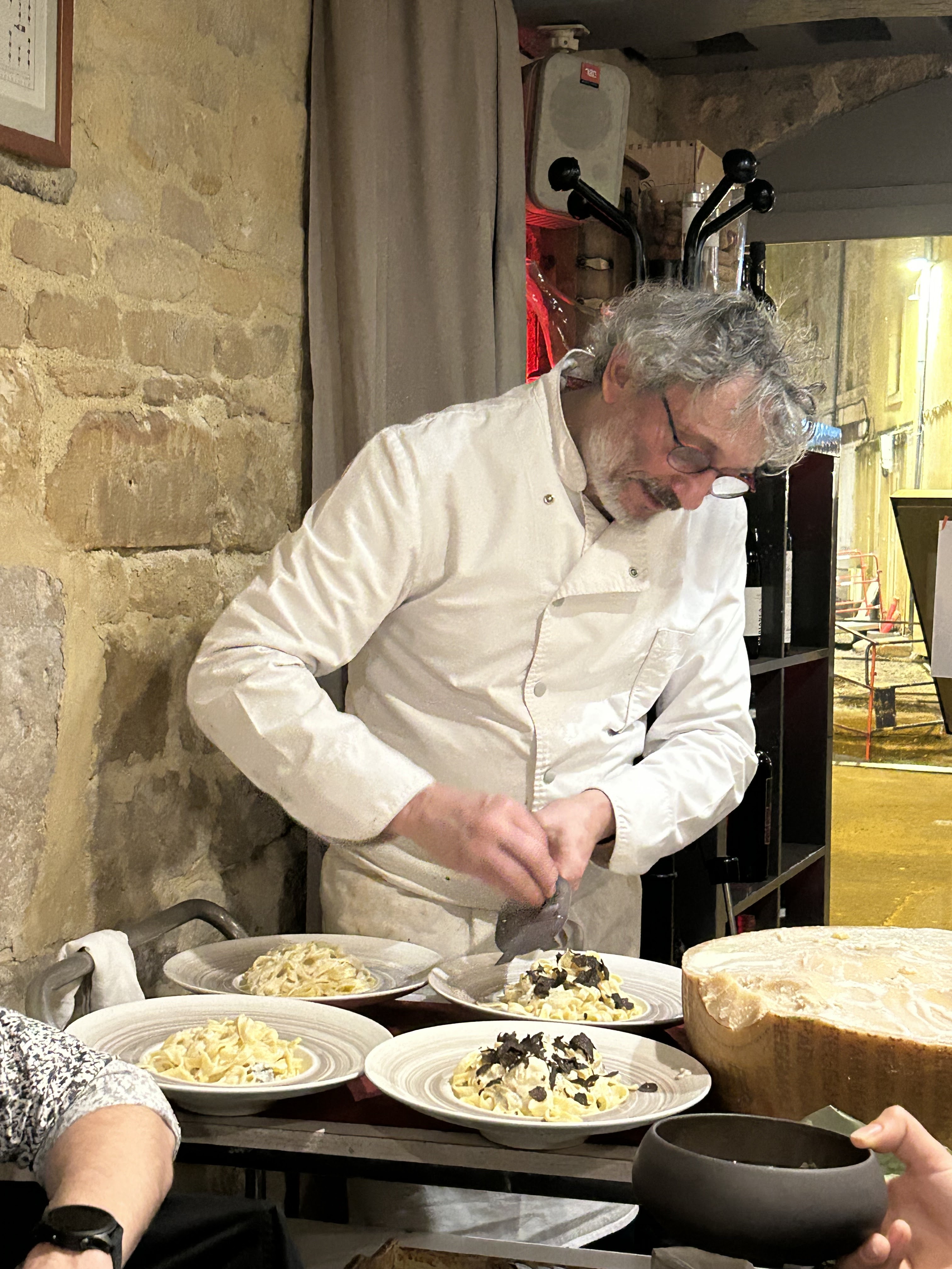 Le fait que le chef prépare les Tagliatelles Trattoria dans la meule de parmesan devant nous, tout en nous proposant des anecdotes (sur les truffes ou son expérience personnelle) est vraiment un plus !