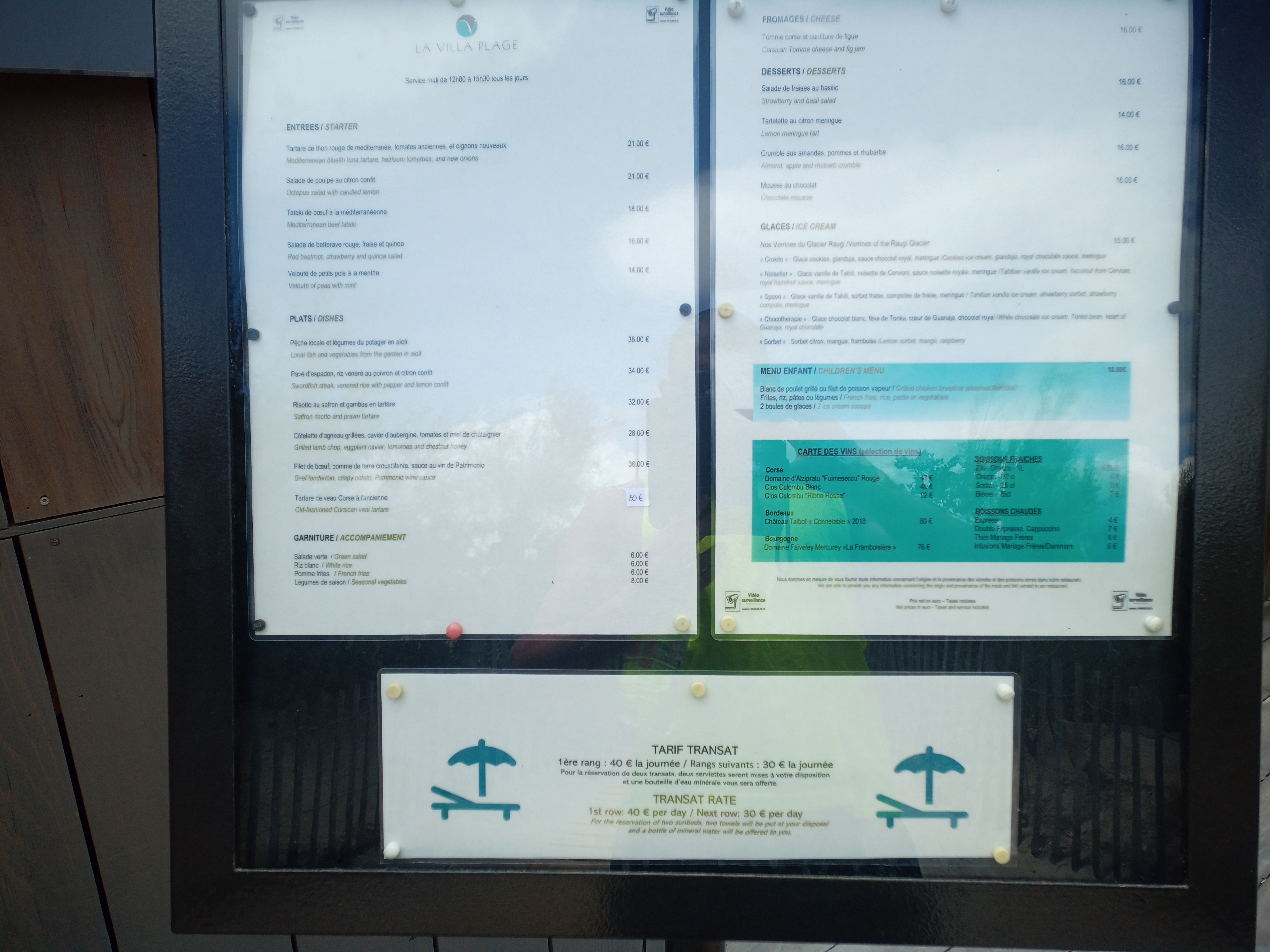 Pour info c'est le restaurant de plage de l'hôtel 5 étoiles la Villa qui se situe à Calvi. Endroit très agréable où on s'y sent bien. L'emplacement au bord de mer est juste parfait. Les prix peuvent paraître élevés ( comptez 30 euros pour un plat) mais ceux ci sont justifiés. On y mange très bien et les produits sont frais. Le personnel est très agréable et à nos petits soins. Nous recommandons cet endroit :)