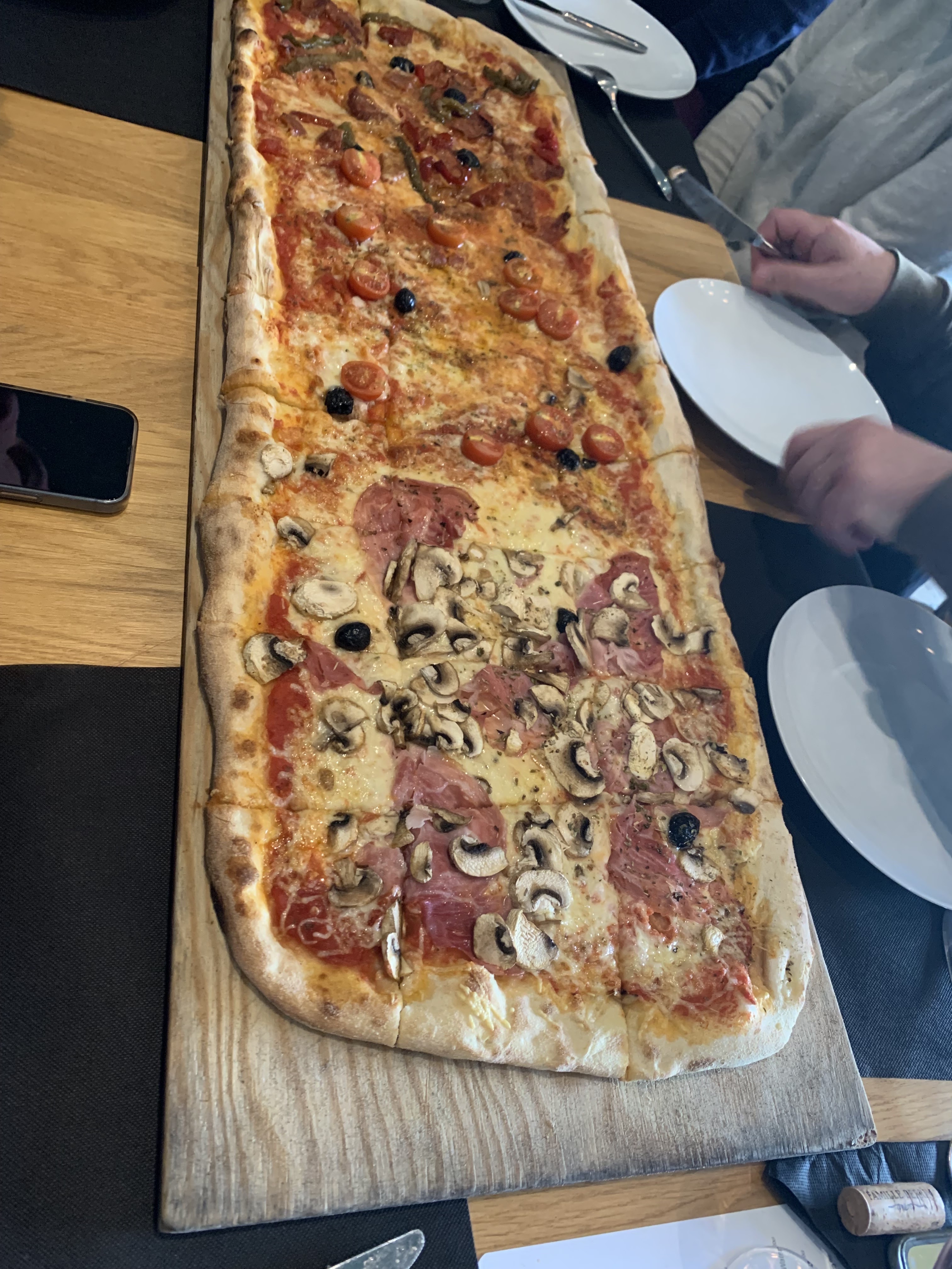 Cadre sympa et une première pour moi Pizza au mètre. Géante et très bonne