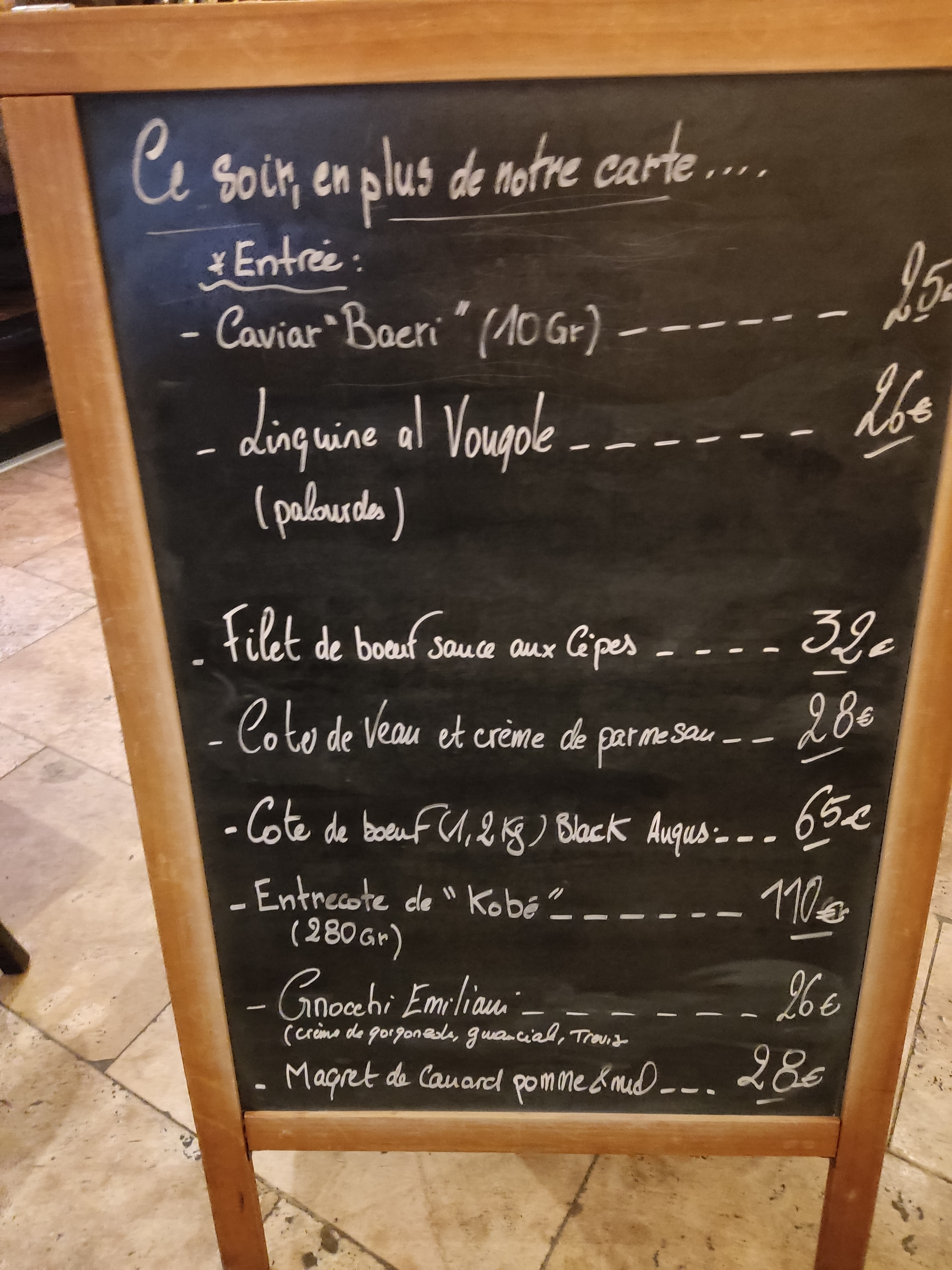 On prend 2 menus dont la gardiane proposée en menu du jour, finalement plus disponible donc 1 des personnes à table bascule sur un plat à la carte. A l’arrivée en caisse on nous avait facturé 2 menus + les plats à la carte. La note a été rectifiée mais si nous n’avions pas vérifié, l’écart était de 30€