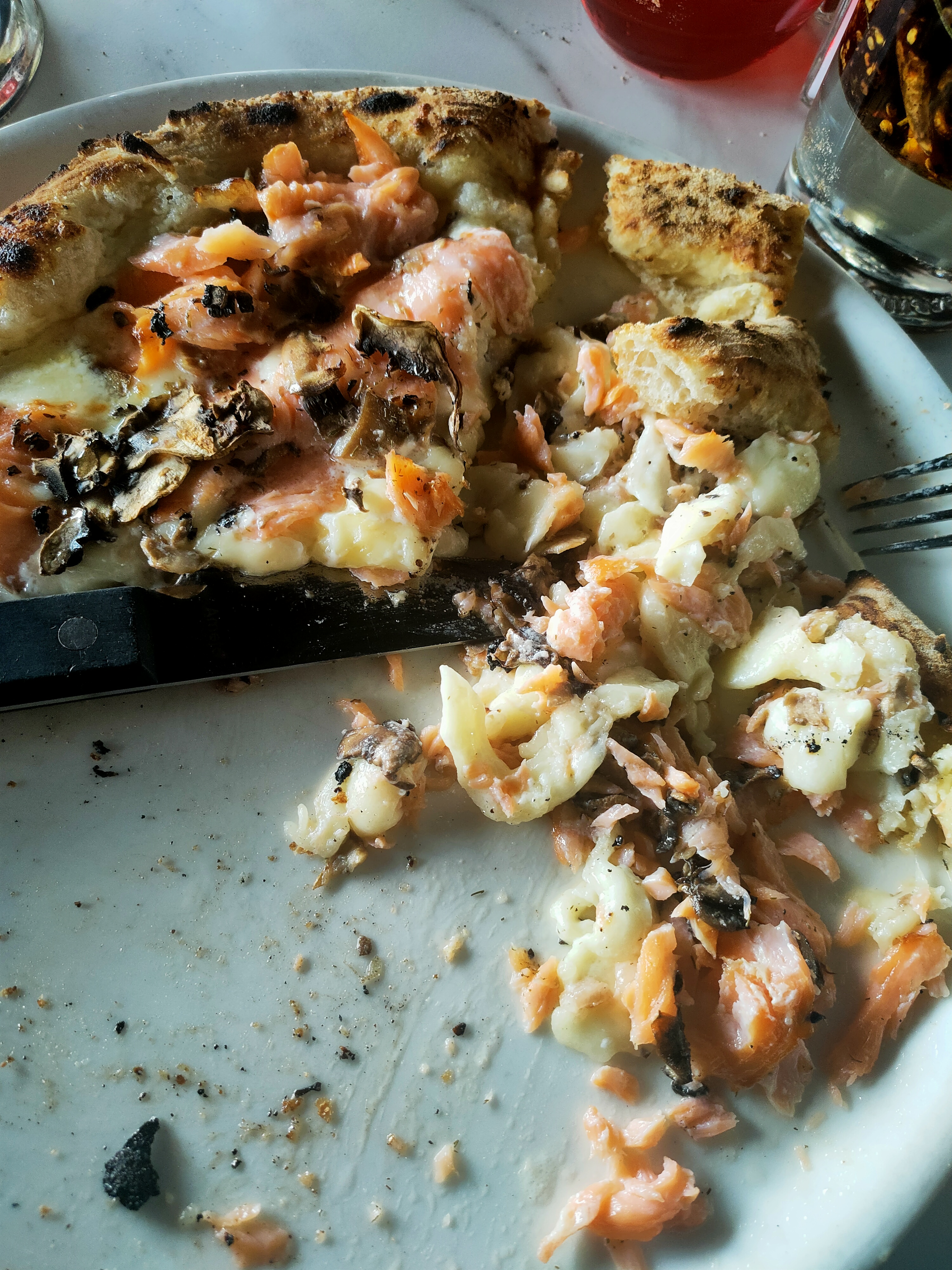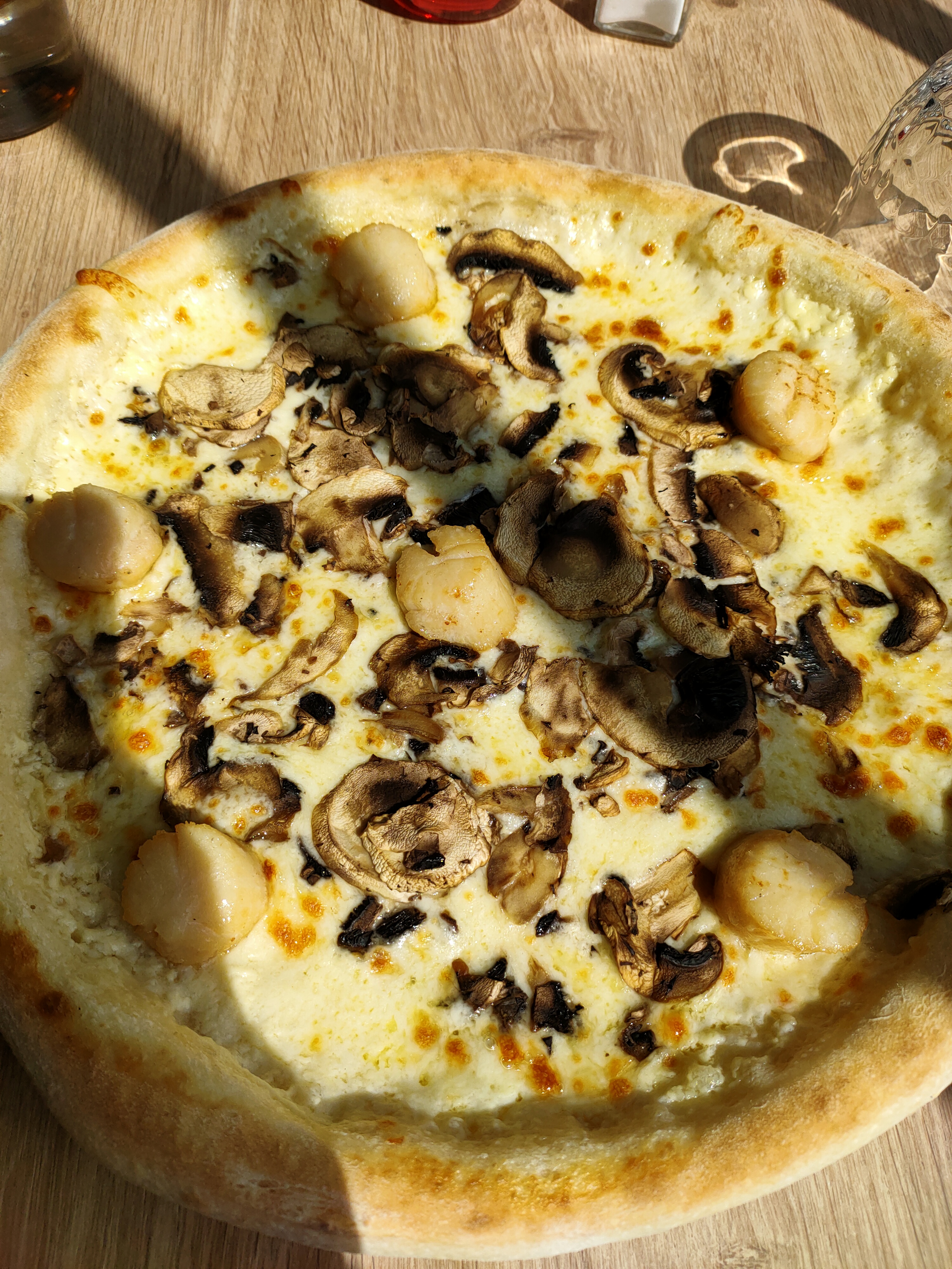 Première fois ici désoler mais ça sentais les égouts a l entrée mais nous avions vraiment envie de découvrir et y avait du monde et la déco est attrayante . En entree j' ai pris une friture de calamars avec le choix en sauce accompagnement j'ai pris truffe, la friture n était pas assaisonner fade mais la sauce au truffe était excellente ont n'a demandé du pas et trempé dedans c était même meilleur que la friture avec du pain avec sûrement leurs pâte a pizza et c était chaud ça c était bon . Ma femme a pris des pâte truffe c était bon mais pas transcendant , moi j' ai pris la pizza avec les gambas et les st jacques moi j' ai trouver ça excellent et leur pâte a pizza très bonne. Pour le service c était un dimanche fin de semaine la serveuse devait être fatiguée car pas du tout souriante.pour fini l ambiance je dirais que la déco est agréable notre table un peut serré. 1 cocktail pour 2, une entrée 2, un plat, une pizza 56€ ...