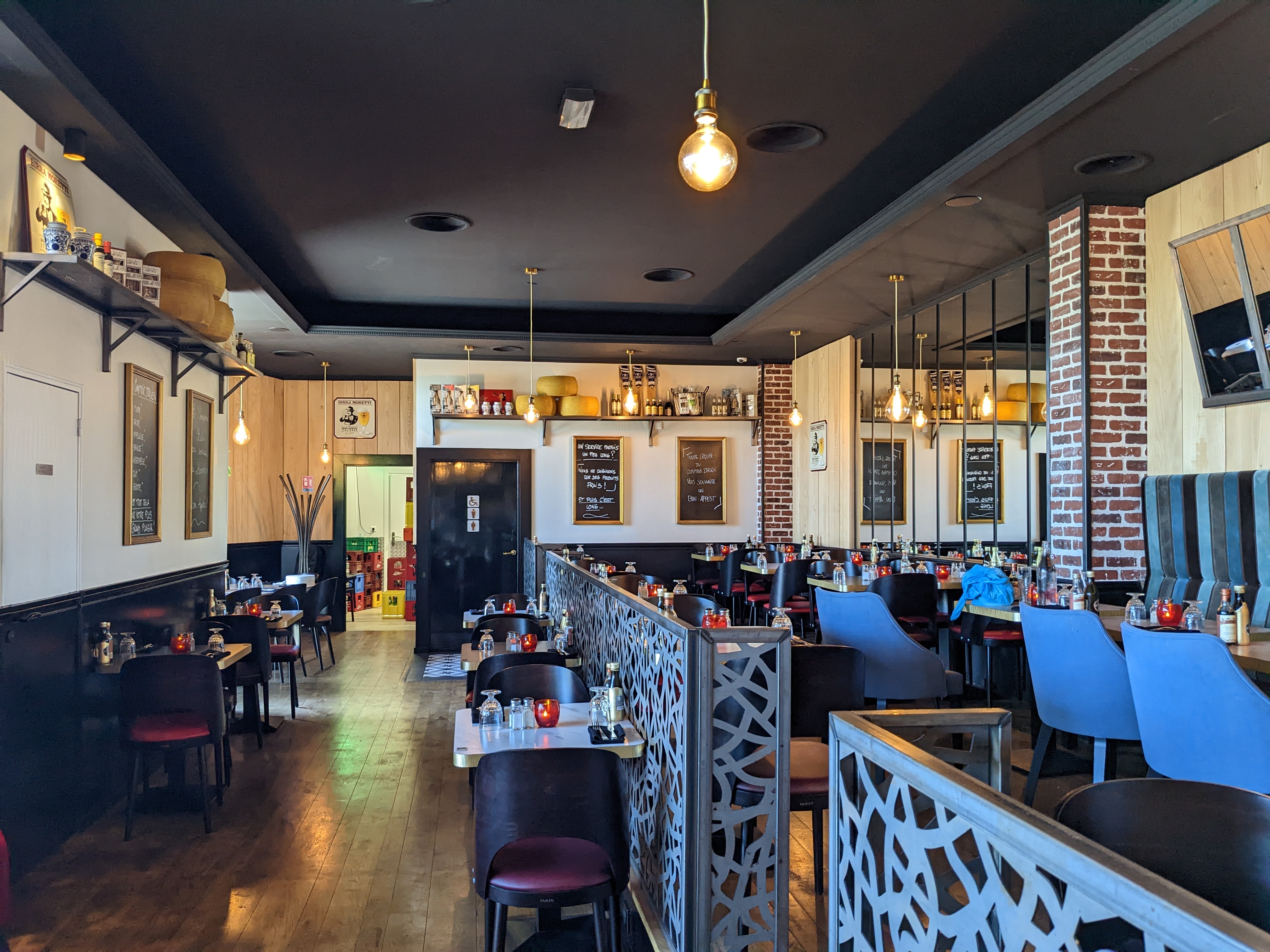 Nous avons passés une très bonne soirée dans ce restaurant à la décoration originale. Nous étions installés dans de grands fauteuils rouges très confortables et surtout la table était grande ! Et ça c'est appréciable ! La nourriture était excellente mais j'ai trouvé les prix un peu chers. Nous avions choisi une grande planche à partager pour l'entrée et nous nous sommes régalés. La quantité de charcuterie était là contrairement à la burrata que j'ai trouvé un peu petite (pourquoi mettre 1/2 et pas une entière ??). Le reste du repas était tout aussi bon. Petit bémol sur la lenteur du service. Quasiment 45 minutes entre l'entrée et le plat. Honnêtement on a failli annuler notre plat pour passer directement au dessert parce que nous n'avions plus faim.