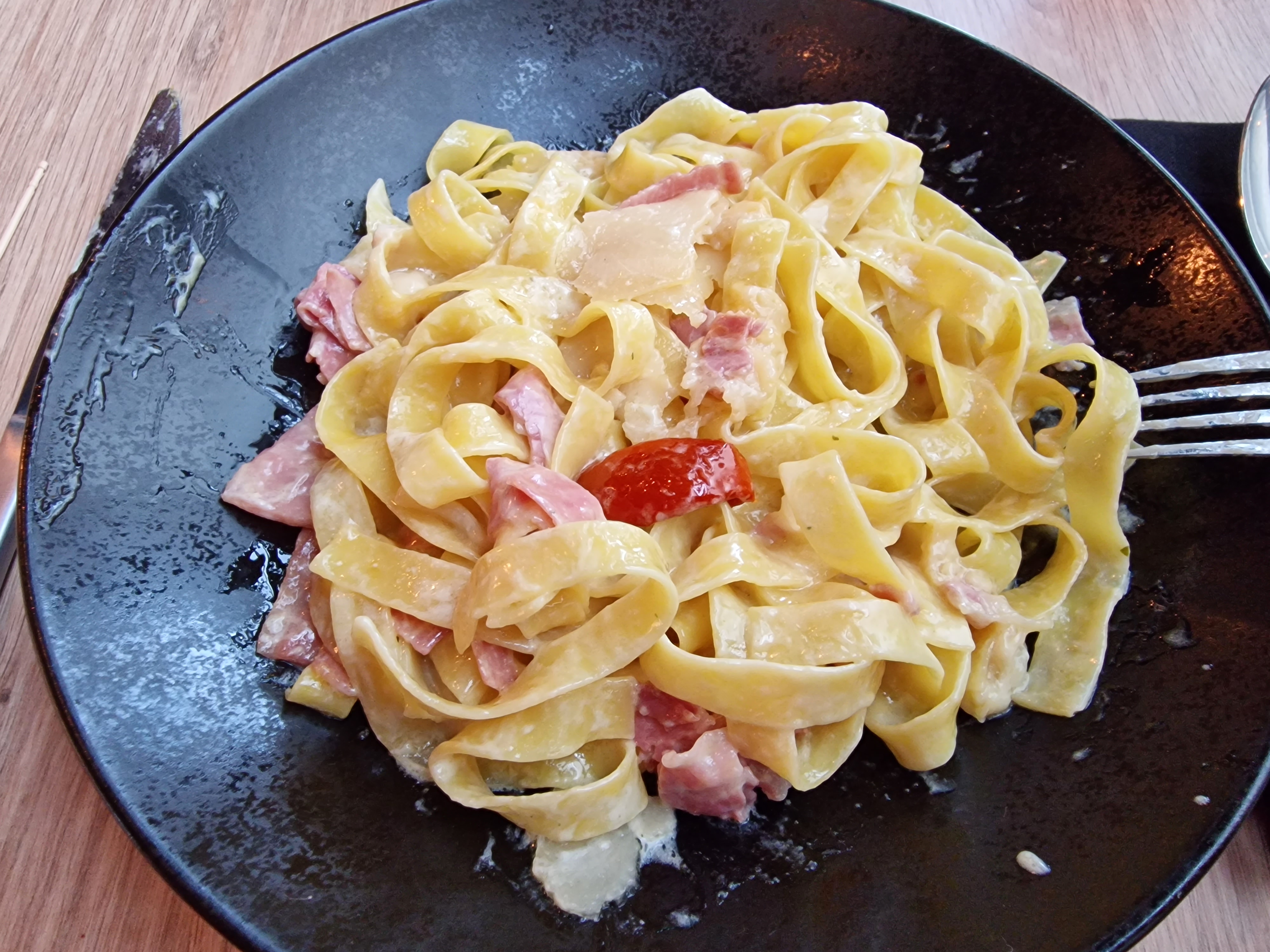 -Restaurant Italien? Vraiment? -Vous voulez prendre des pâtes carbo, écrient dans le menu avec l'appellation en Italien pour vendre du rêve mais en faites vous apprenez que c'est à base de crème fraîche donc rien d'Italien,c'est même une insulte. -Les pâtes étaient sèches malgré la sauce tomate qui avait le goût d'une banale purée de tomate, obligé de mettre de l'huile d'olive et du parmesan pour rattraper, encore une insulte à L'Italie que de raté de simples pâtes. -Pizza rien d'extraordinaire niveau goût de la pâte, une pizzeria classique de quartier fait mieux le travail. -TROP CHER POUR CE QUE C'EST!!! -Une cuisine de cantine est meilleure...