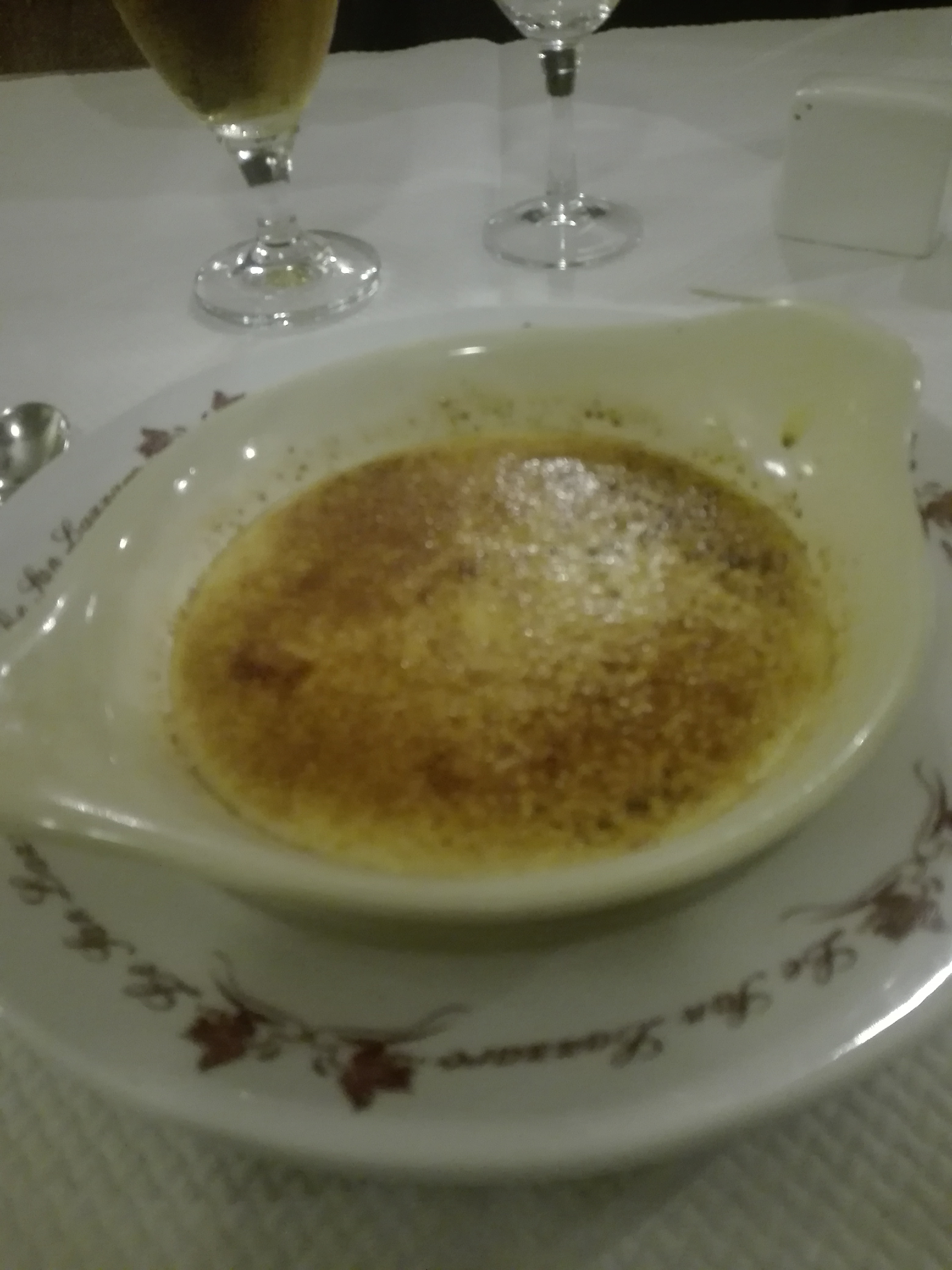 Escalope très bonne mais tres déçue des profiteroles. J’ai d’abord cru que les choux étaient fourrés avec de la glace, mais je me suis rendu compte après quelques minutes qu’ils s’agissait de crème pâtissière congelée… Immangeable ! L’assiette à dessert est restée sur la table et aucun serveurs n’est venu nous débarrasser.