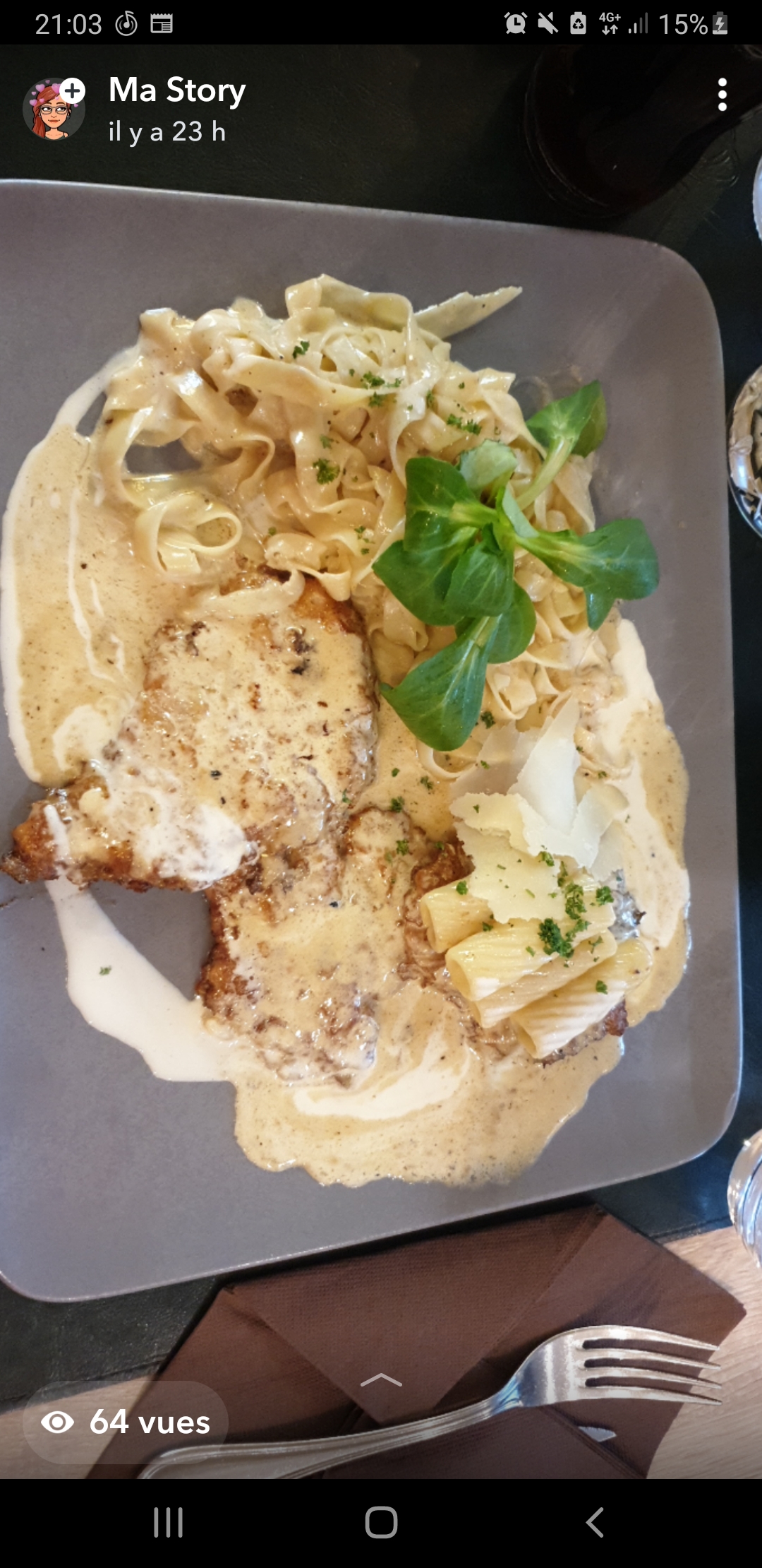Pate de la pizza non.cuite sur le dessus , pate noix gorgonzola sans intérêt et tiramisu pas sur qu il soit fait maison en tout cas pas à mon goût De plus nous étions prêt du four mais dans un courant d air car les gens sortait fumer même les clients suivit d une odeur de cigarette désagréable Peut être que les viandes étaient meilleures mais dommage du veau Bref resto sans plus et pas typiquement italiens ( buwespatzles , moules frites, saumon cordon bleu, ...) J en avait un meilleur souvenir