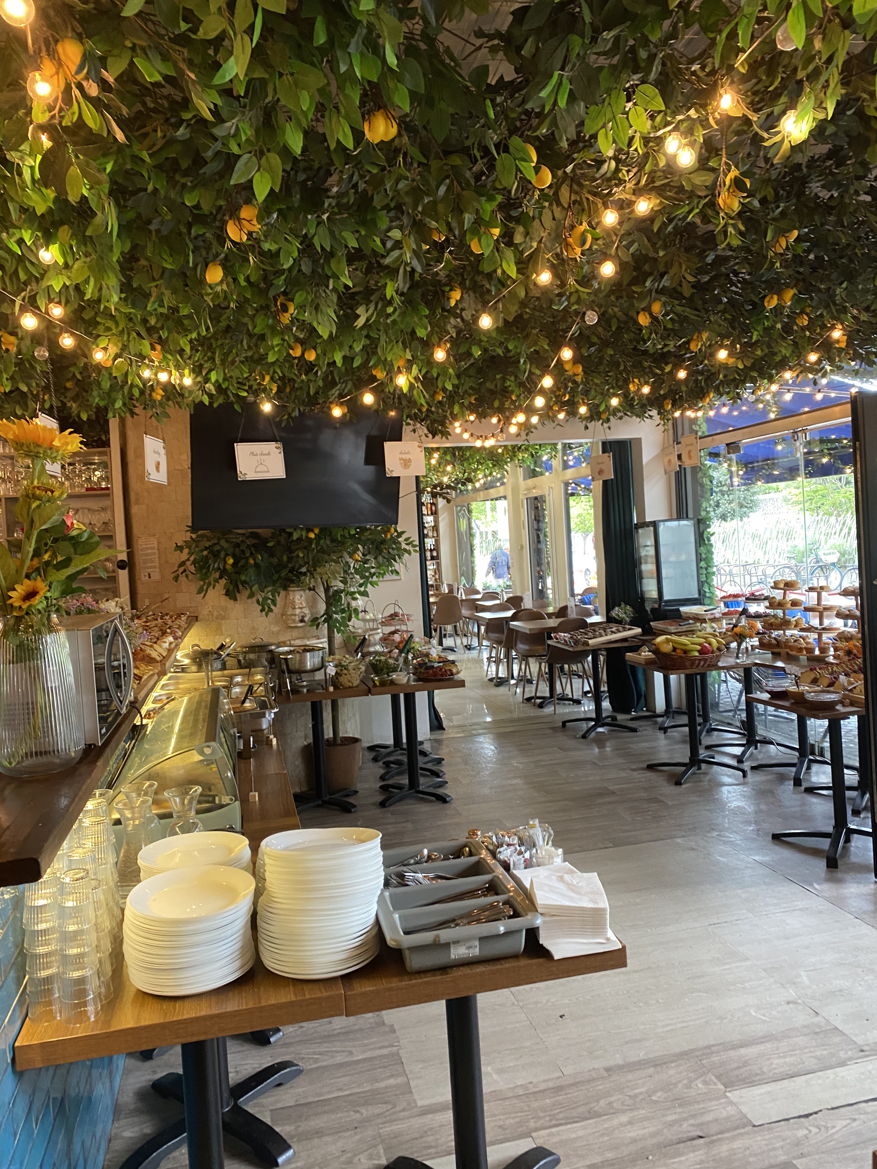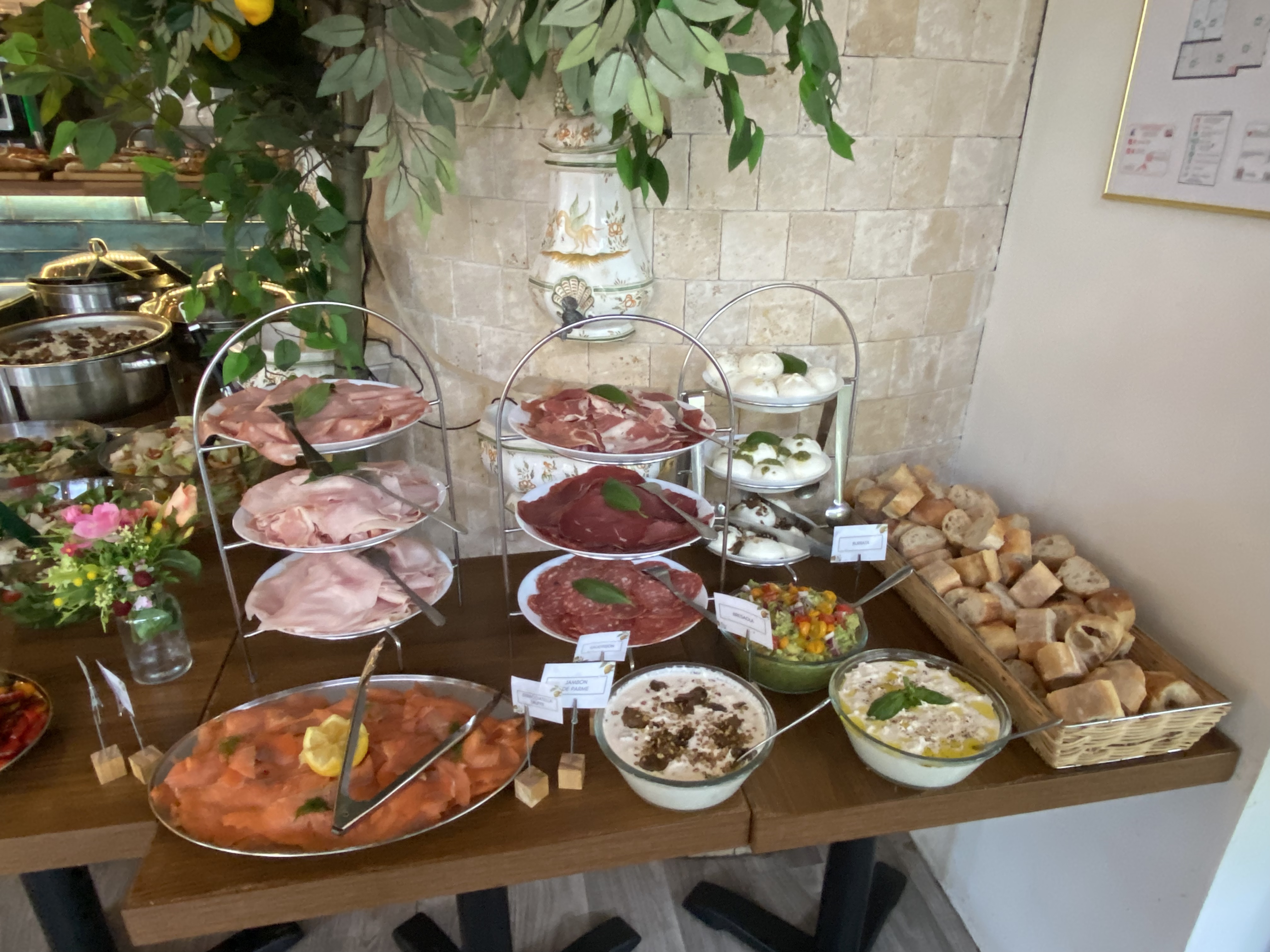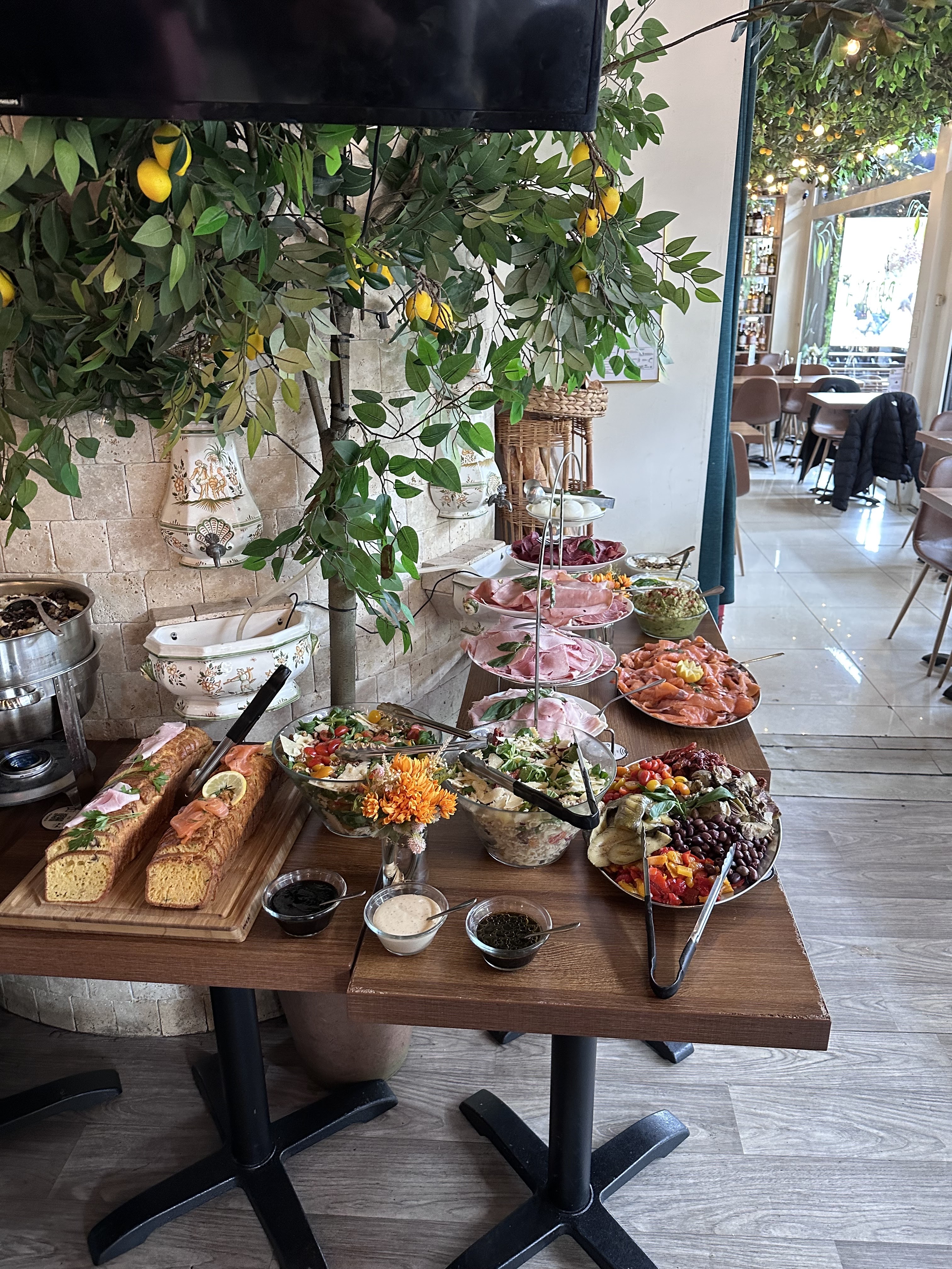 restaurant que l'on m'avait recommandé pour ces brunchs. resto facile à trouver en plein cœur du quartier des Halles et qui est joliment décoré pour mettre dans une ambiance cosy et décontractée à l'italienne... je n'avais pas réservé donc placement en terrasse après un petit temps d'attente. ils manquent un peu d'organisation dans l'accueil mais compréhensible vu le monde qu'il y avait. une fois placé buffet brunch à volonté pour 32 euros avec un large choix autant dans le salé que dans le sucré. et c'est un peu ça le soucis car du coup pour 32 euros on veut quand même rentabiliser et on mange trop et surtout on mélange un peu tout sans réellement profiter de chaque chose surtout dans le sucré que j'adore et dont le choix était très large et avec beaucoup de bonnes choses. tout n'était pas forcément excellent mais d'un bon rapport qualité/prix. sympa malgré tout à faire entre amis pour passer un bon moment le dimanche.