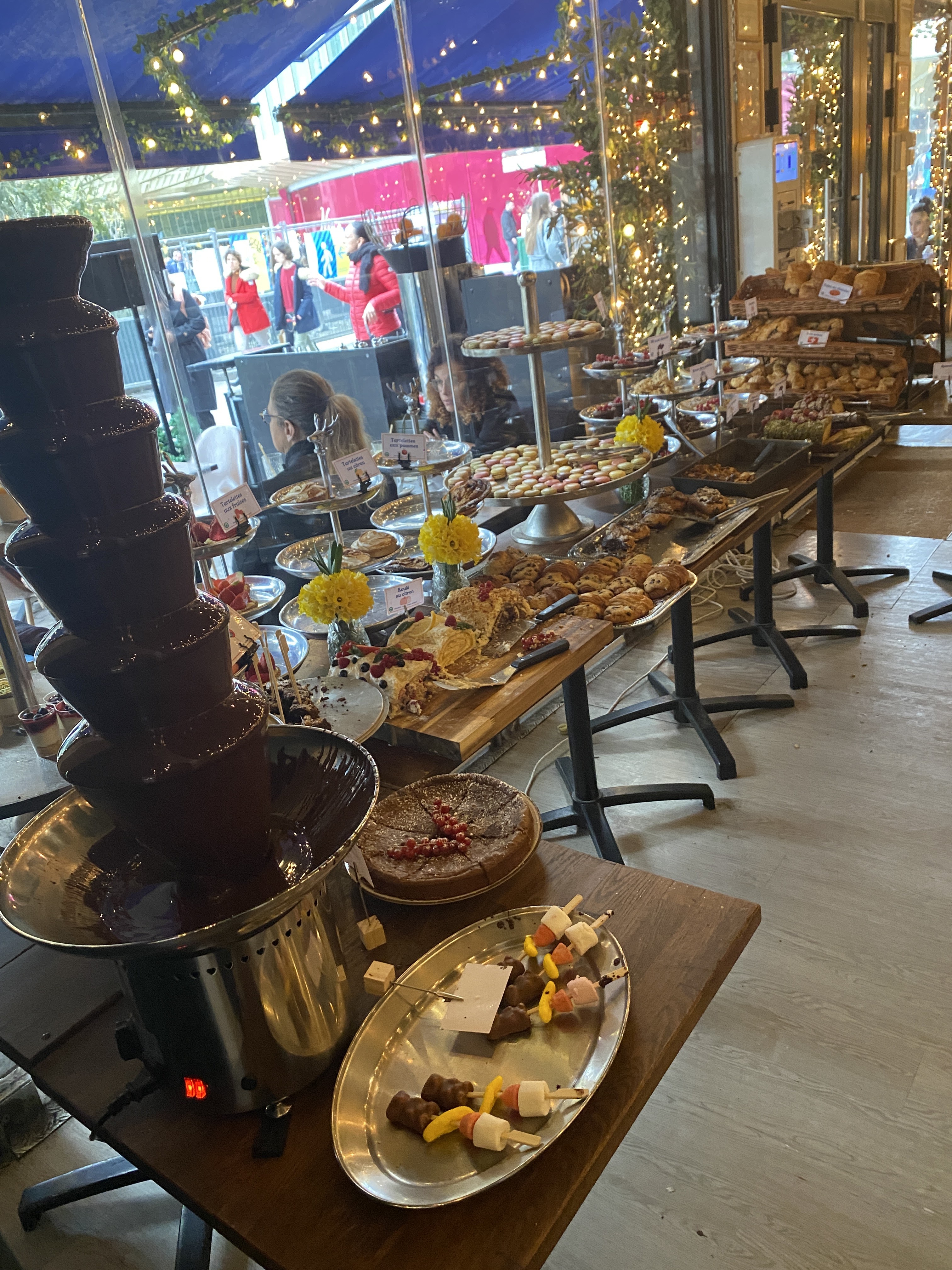 37,50 €/ personnes, bien trop cher pour la prestation. 2 boissons ( 1 chaude et 1 froide) servie 1h00 après l'arrivée, vous mangez sans boire... 😒 Et il faut relancer plusieurs fois... Les tables ne sont pas numérotées donc ils ne savent plus où ils en sont du coup... Service plus que moyen. Le personnel est dépassé par le nombre de client.. Le buffet n'est pas realimenté rapidement, pas de brochettes de fruits pour la fontaine à chocolat. . Réservation obligatoire qui n'en est nullement une, aucune prise de nom pour entrer et du coup, plusieurs files pour entrer Les pâtes étaient froides, les jus manquaient de fraîcheur, c'est vraiment dommage car en soit tout est bon..