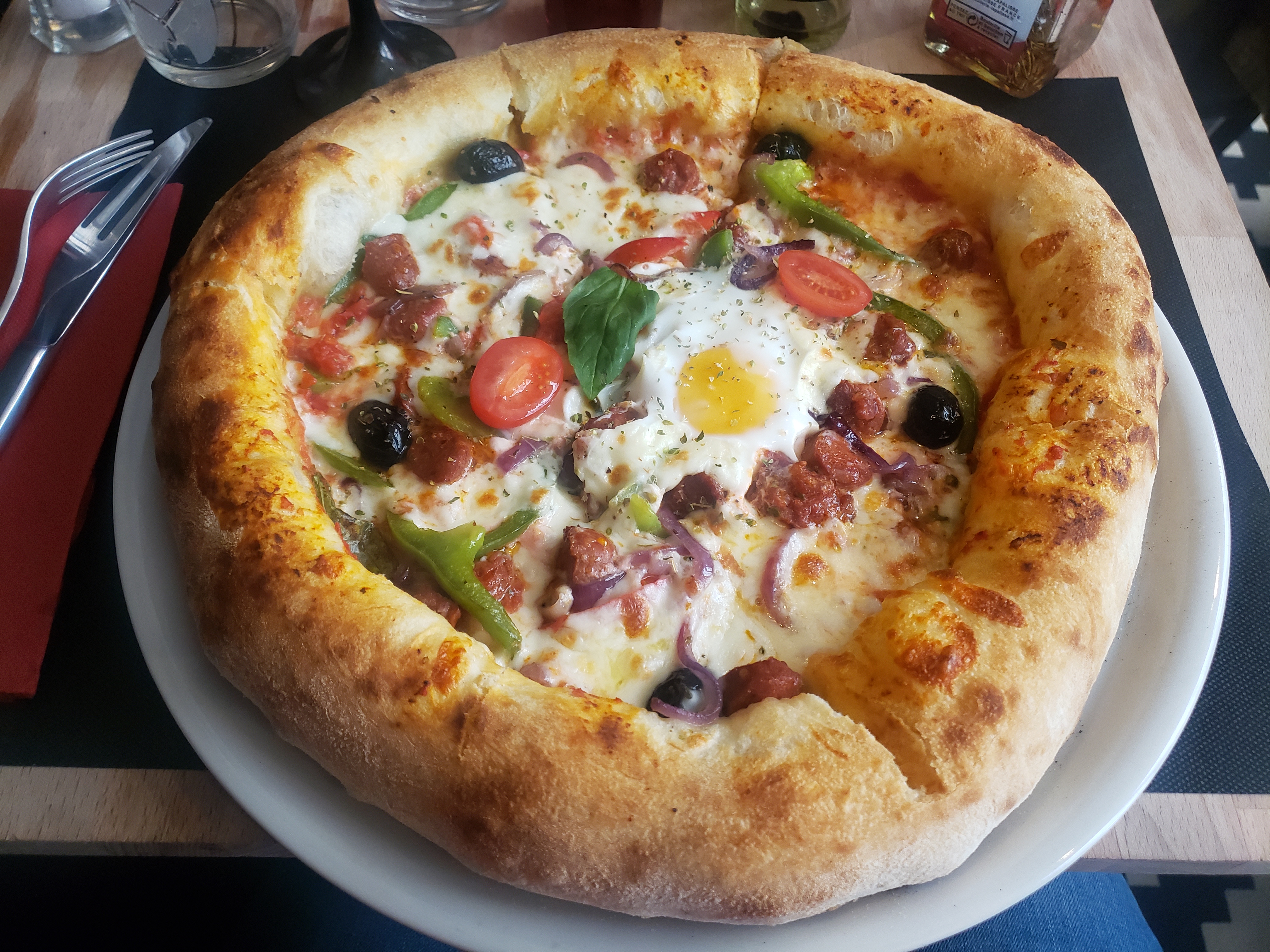 Je ne comprend pas votre note, la Pizza orientale est très mauvaise, aucun gout, 3 morceaux de merguez qui se battaient en duel, un morceau de poivron pour chaque part et encore, oeuf beaucoup trop cuit ainsi que toute la pizza, la mozzarella etait tellement cuite qu on ne sait même pas si elle etait vraiment présente et les olives cocktail avec noyaux étaient infâme. En gros il n’y avait absolument rien de bon, si on ne sait pas faire de pizza on en fait pas surtout si c est pour mettre aussi peu de garniture et sans gout.