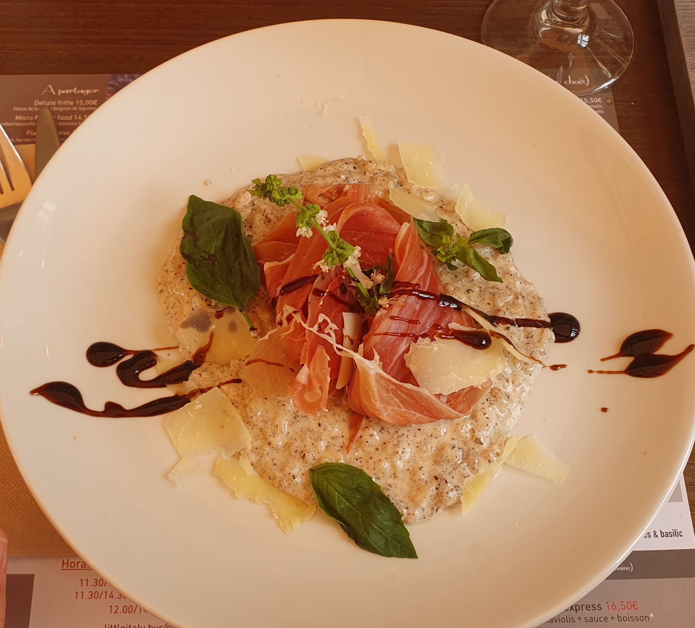 J'y ai dégusté un risotto à la crème de truffe et au jambon de parme. C'était exquis! L'accueil est chaleureux,je service impeccable. Chaque minute que j'y ai passé m'a été très agréable. Étant une grande épicurienne,je recommande grandement !